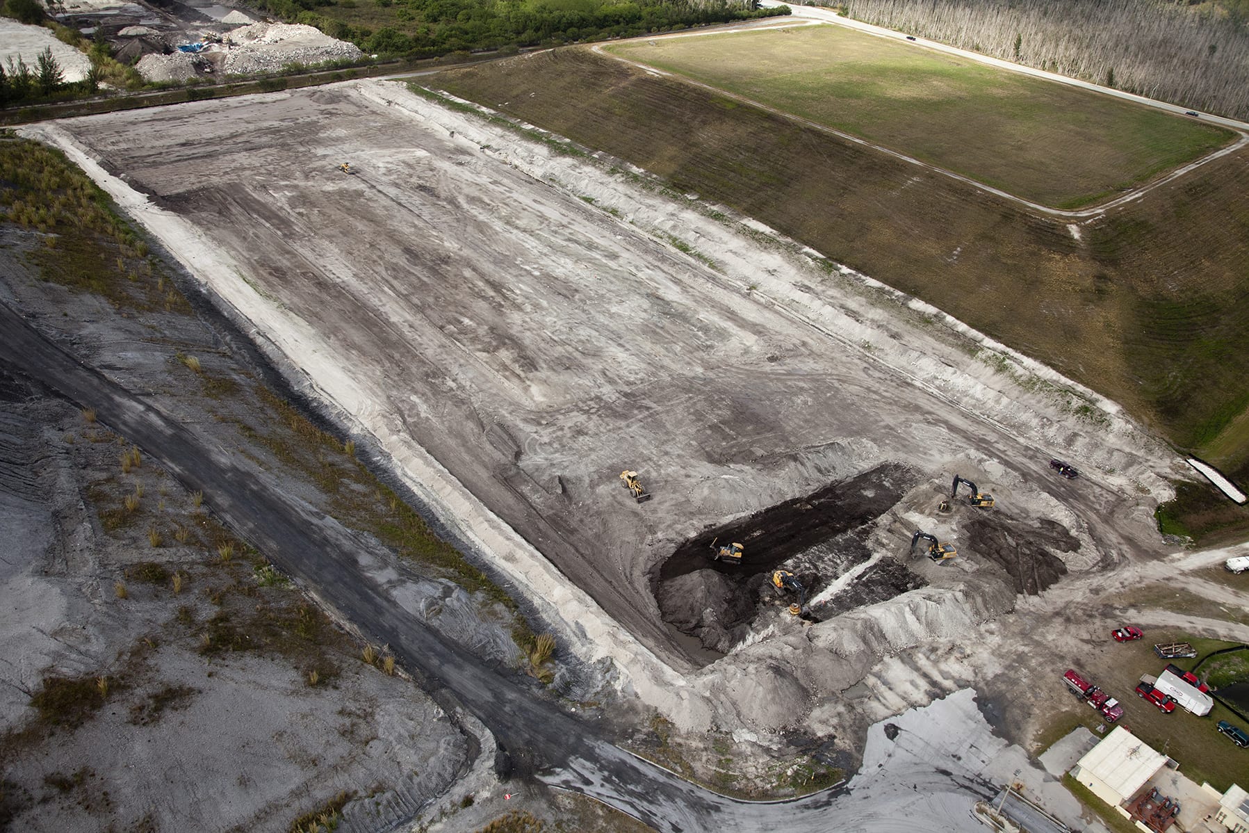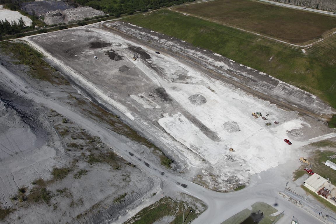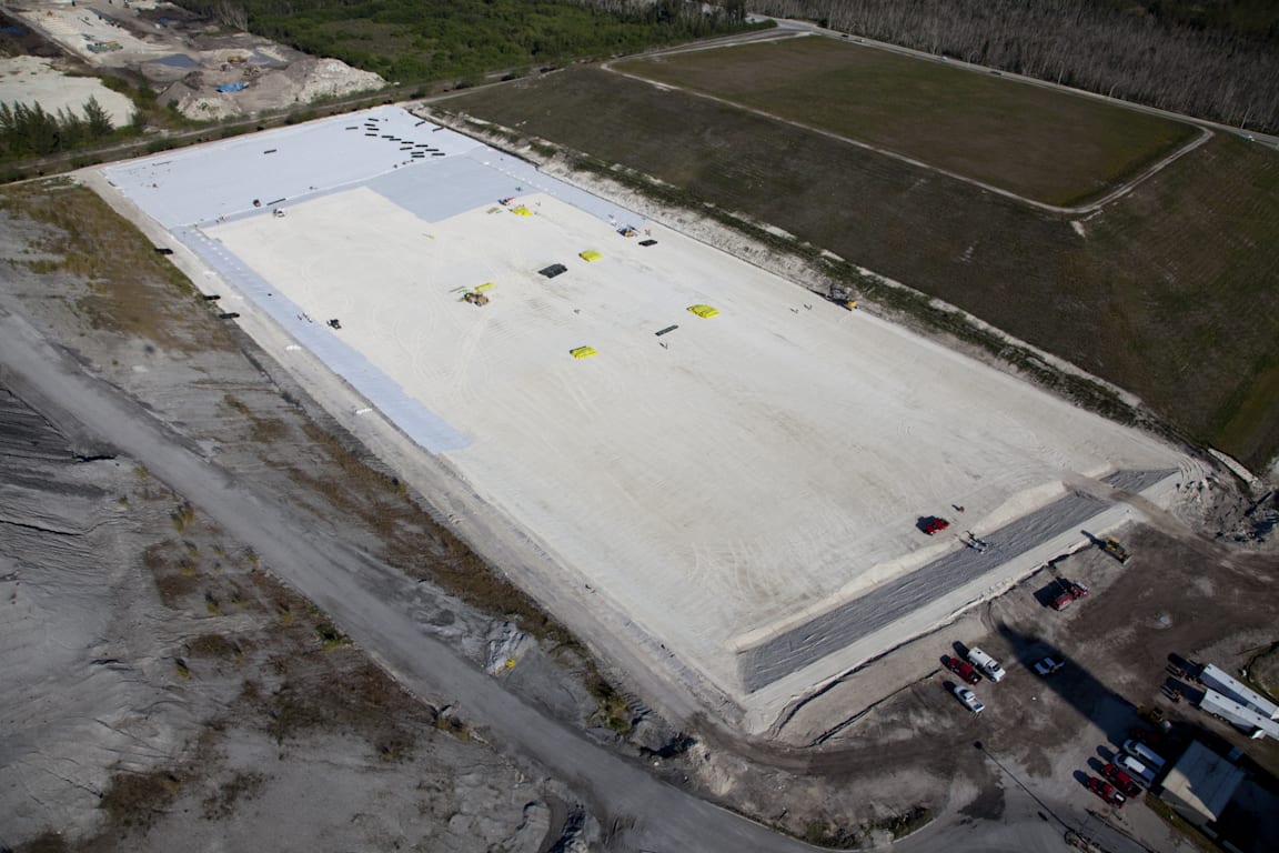 On May 28th, COMANCO Envrionmental received the Certificate of Completion for a 10-acre cell expansion at the Miami-Dade Ash Monofill in Doral, FL. The project was completed within budget, ahead of schedule and most importantly with no accidents or injuries. Some highlights from the scope of work were: * Stripping & Demucking * Backfilling & geosynthetics sub-grade preperation * A 5 layer geosynthetic system consisting of GCL, 2 layers of 60-mil white HDPE geomembrane, geonet & geocomposite * 2′ of protective cover sand over the geosynthetics * Over 3,000 LF of HDPE collection & detection piping wrapped in river gravel & geotextile * Two new manholes tied into the leachate collection & detection systems * A solar panel alarm system for the leachate detection system Upon completion of the 2′ protective cover sand, an electrical leak location survey was performed by Leak Location Services, Inc. to ensure the liner system did not have any holes. Please see below aerial photos showing the progress from start to finish.