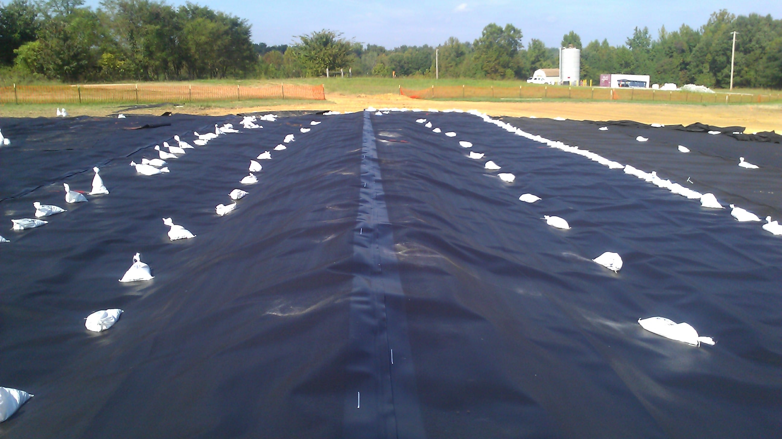 This past Saturday, COMANCO Environmental finished installing a 3-acre geosynthetic cap at the Sebree Landfill in Robards, Kentucky. The cap system consisted of a 16-oz/sy NW geotextile, a double-sided 300-mil gas vent geocomposite layer, a textured 60-mil HDPE geomembrane and a double-sided 300-mil drainage geocomposite layer. Superintendent, Tony Sanchez and his 11-man crew completed this job in less than 2 weeks. Most importantly, safety remained the top priority as there were zero incidents, accidents or injuries incurred. Please see below for some photos of the construction progress.