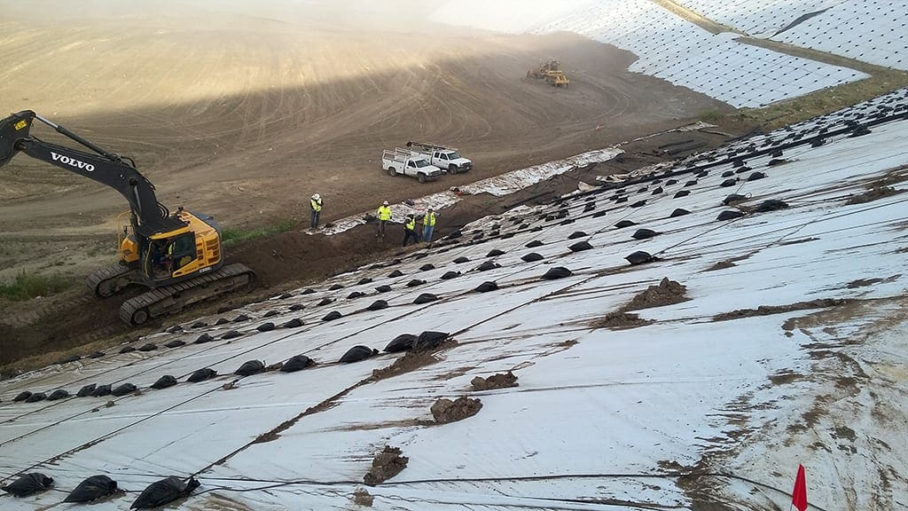 COMANCO crew repairs multi-layer liner system at the Frank R. Bowerman Landfill located in Southern California. Carlos Garcia and crew have been busy repairing an existing landfill cell area of 200’ X 200’ consisting of GCL, 60 mil black/white textured liner, 16-ounce geotextile and a final layer of 8 mil reinforced scrim rain tarp material. The existing ballast system of sandbags across the slopes and benches had to be removed first; then the cover material located on the benches had to be removed as well.