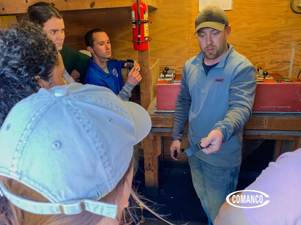 Participants with Engineers Without Borders were given the opportunity to operate both our Columbine and Demtech wedges, Extruder Guns, leister, grinder, vacuum box, and tensiometer. The COMANCO staff tested the students’ welds, and all their samples passed with flying colors!