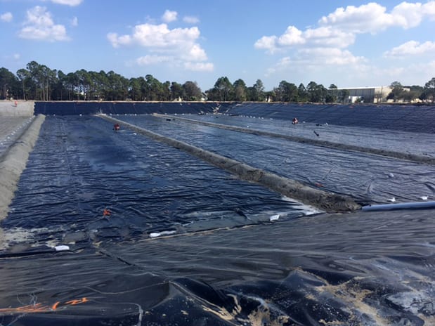 Earlier this week, COMANCO Environmental commenced construction on the 2nd phase of a 2-part Dredge Basin Liner Containment project.  Installation of a new 40-mil HDPE geomembrane liner began on a 2nd 15-acre holding basin in Melbourne, FL.  Superintendent, Jorge Barrantes, and a 10-man crew returned to site where they completed the 1st 660,000 SF basin & 215,000 SF clarifying pond earlier this year.  The team picked up where they left off and are working safely and diligently to finish by the end of this month.