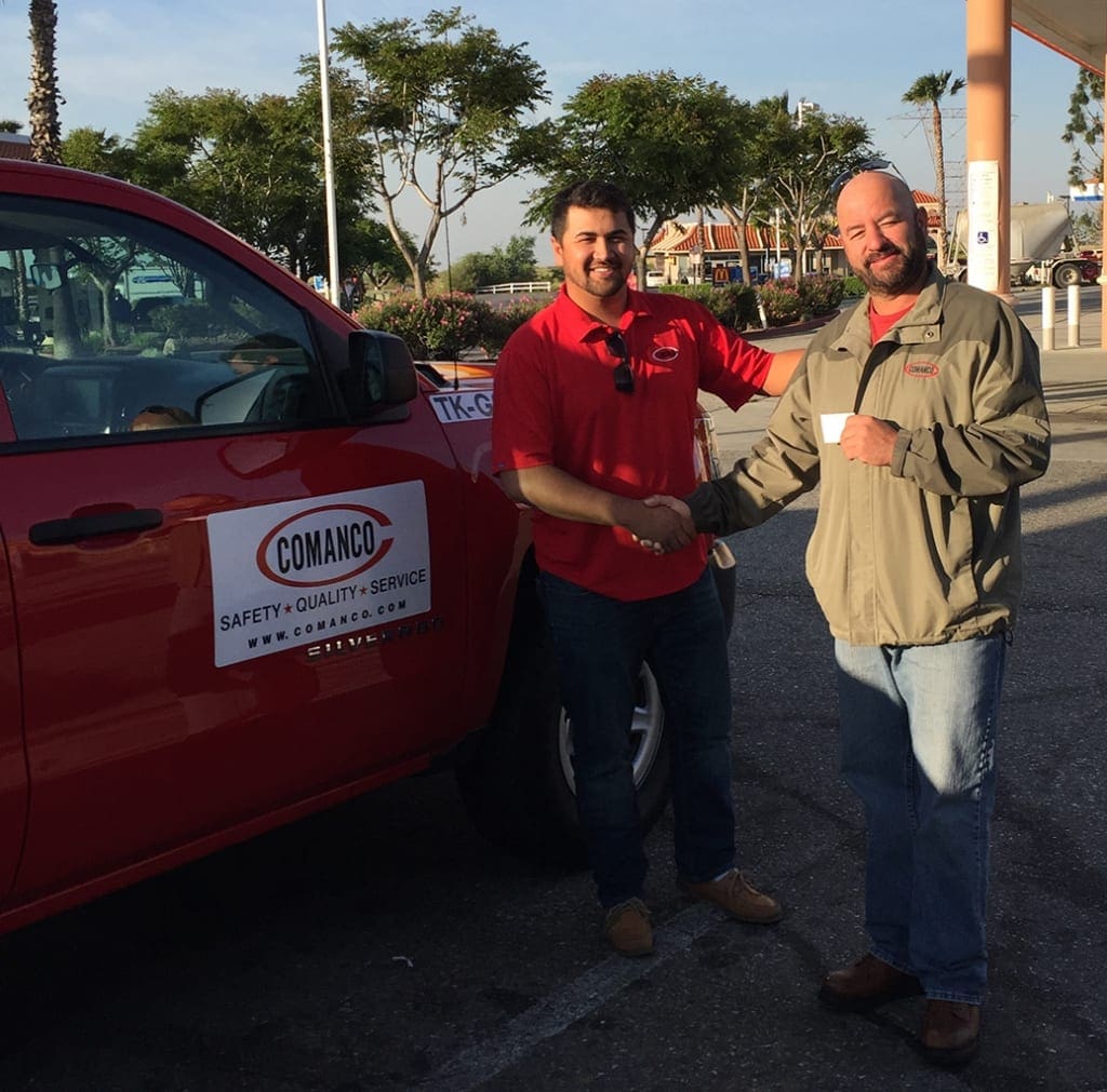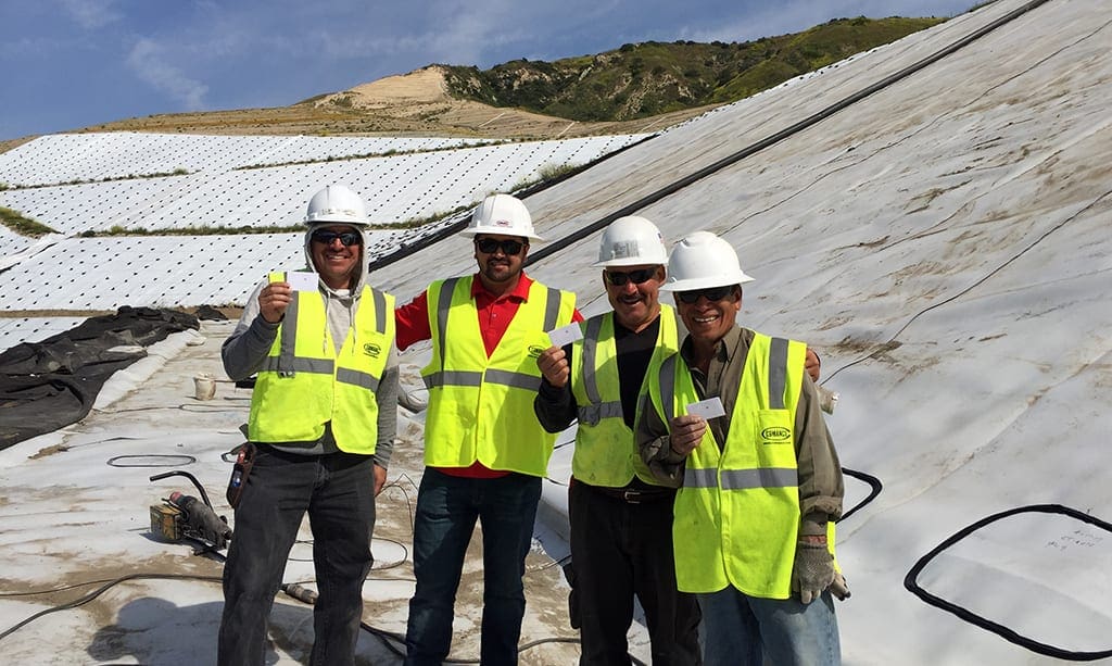 Project Engineer Kip Thompson was on hand to deliver 1st quarter safety cards to eligible crew members working in California. Working at a local landfill in Southern California, Supervisors Pablo Medina, Carlos Garcia, and crew members navigate steep slopes in order to repair an existing landfill cell. COMANCO thanks these employees for their commitment to working safely and adherence to COMANCO’s safety policies.