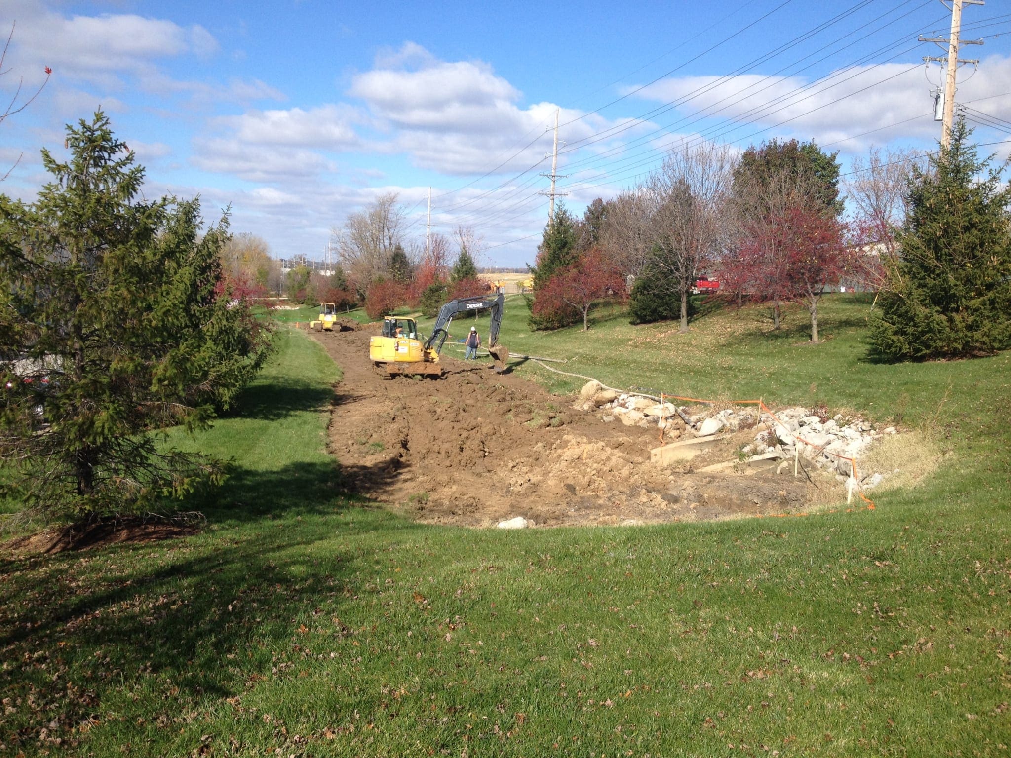 COMANCO has begun a storm water remediation project in the Midwest near St. Louis, MO. The scope of work includes 350 cubic yards of excavation and re-grading to existing, non-functional drainage canal, removal and replacement of an existing rip rap outlet basin around culvert outlets, installation of 250 square yards of sod over newly graded storm water runoff ditch and installation of sprinkler system components.