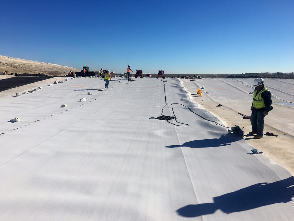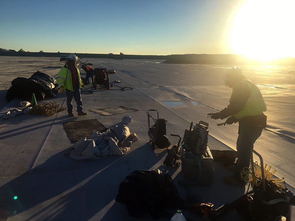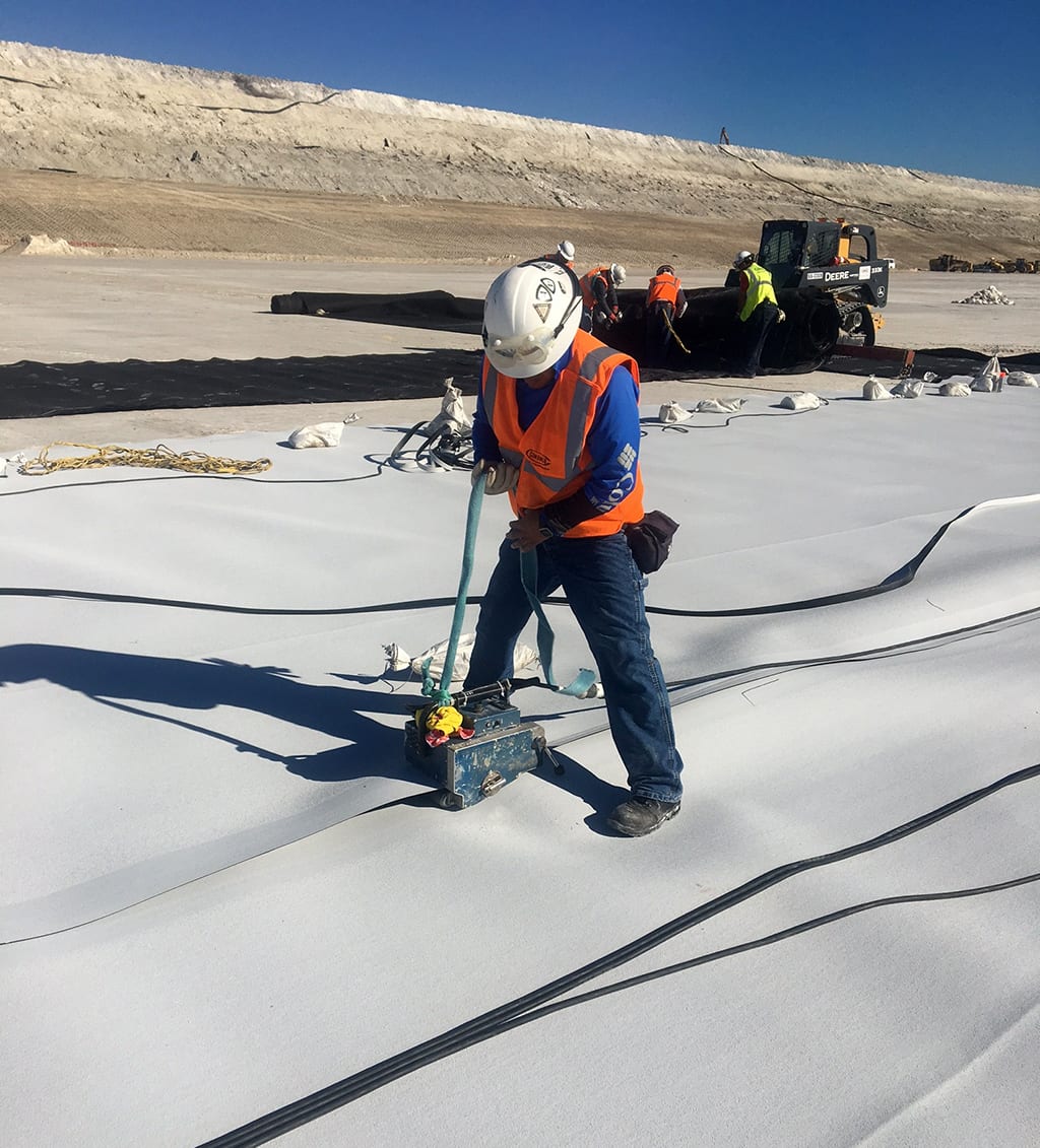 As the sun rises in south Louisiana, so too does the COMANCO crew. Bright and early, the team assembles to prepare their equipment for another day of installation. Once Superintendent Martin Calderon discusses the day’s plan with everyone, they each take their positions and begin deployment. Technicians Francisco Rubi Murillo and Willebaldo Gomez Hernandez utilize COMANCO’s wedge welders to seam the 80mil white double-sided textured HDPE conductive geomembrane. This team’s attention to quality, safe, service will provide this fertilizer manufacturer with the components needed to produce their product for years to come.