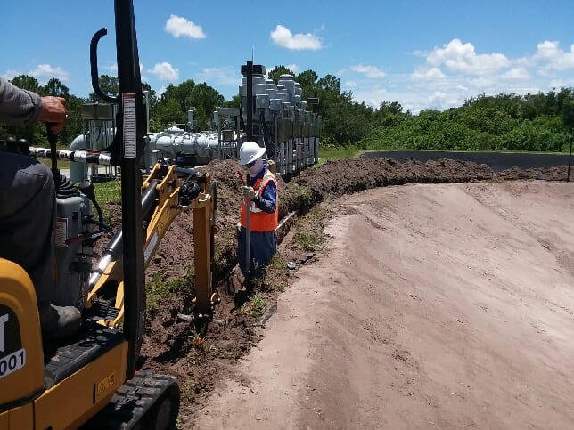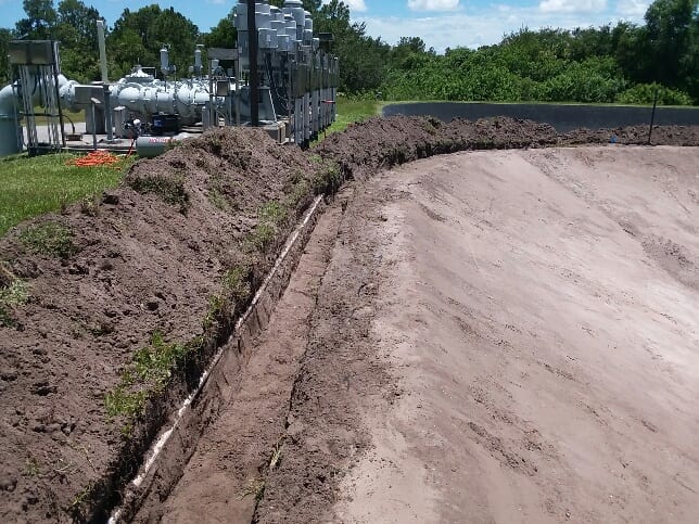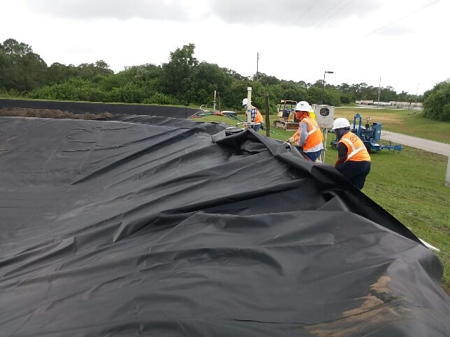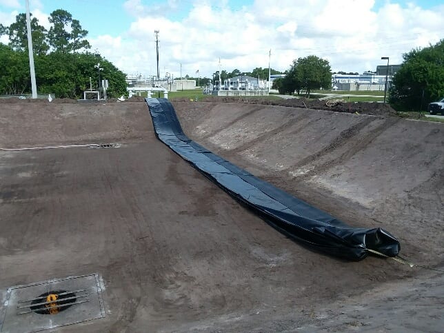 COMANCO has begun the first of two 45mil Reinforced Polypropylene pond liner replacements at a Waste Water Treatment Facility in Port St. Lucie, FL. COMANCO will complete one pond at a time, so as not to cause any downtime for the facility. Superintendent Larry Graham and crew are responsible for the demo of the existing liner, subgrade re-grading and compaction, and the installation of the new 45mil RPP liner. Despite the constant threat of typical Florida inclement weather, the crew is working safely and efficiently for our client.