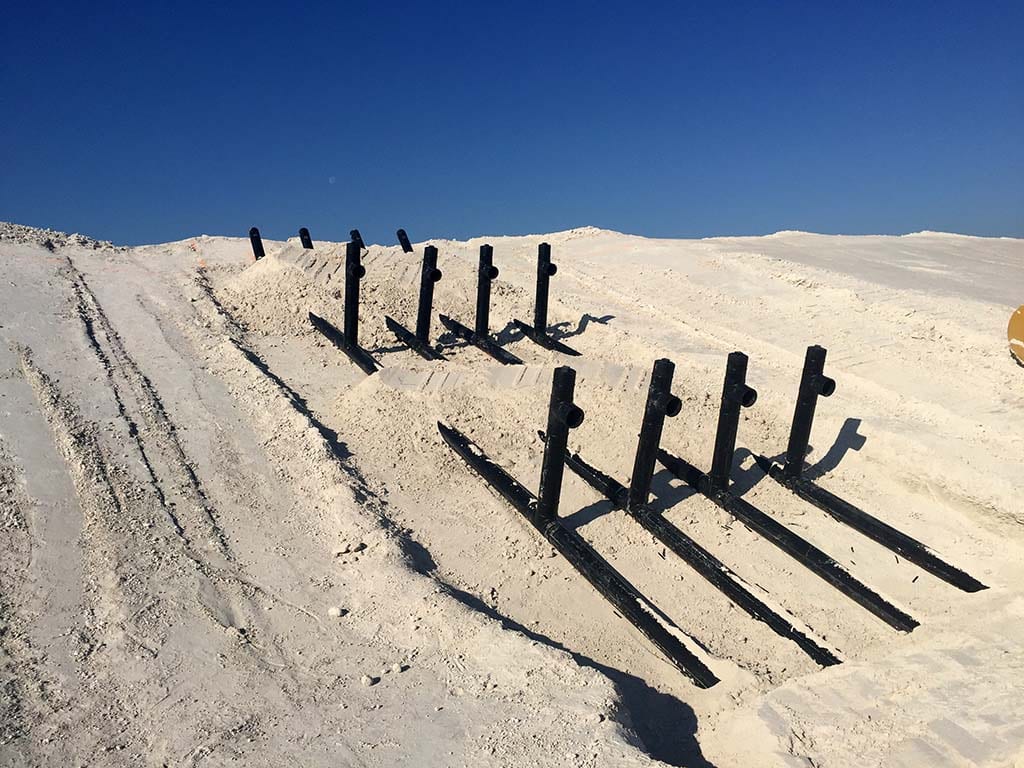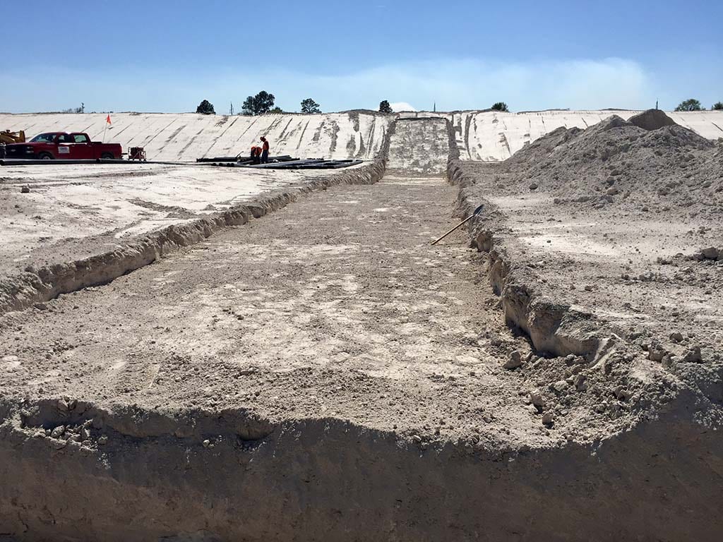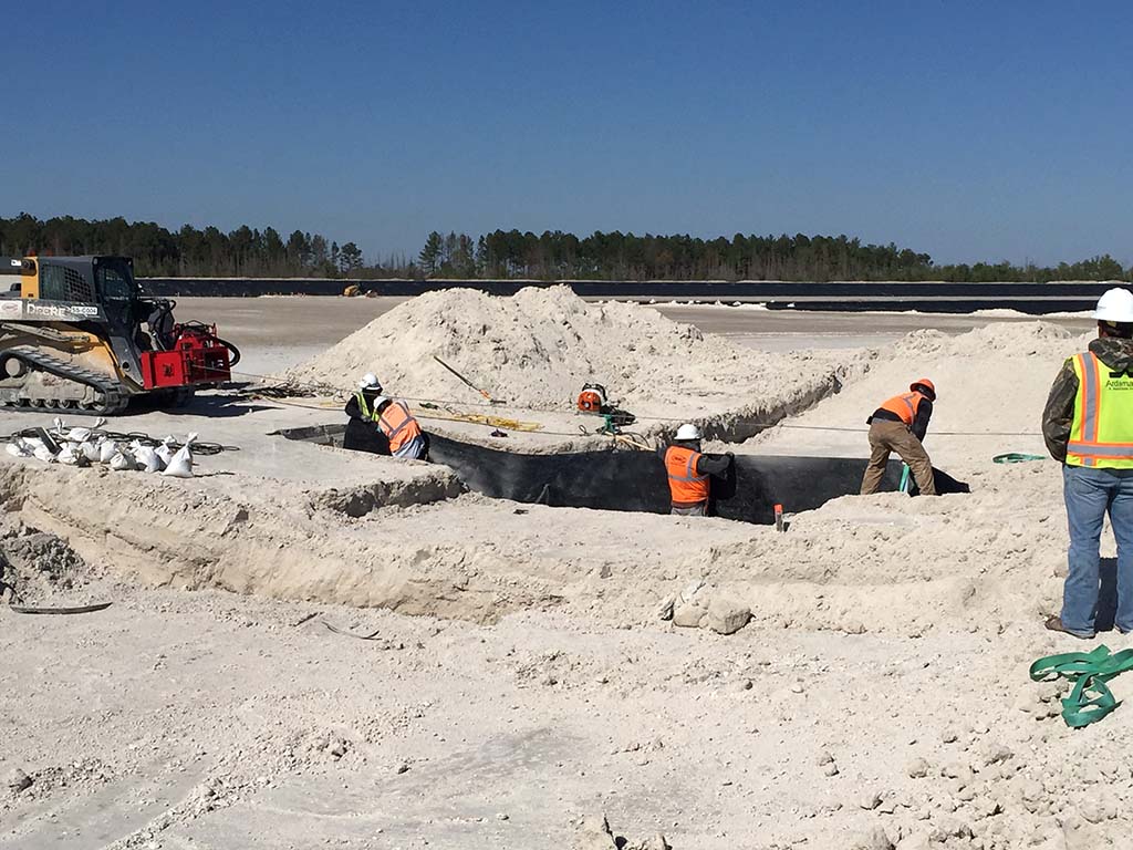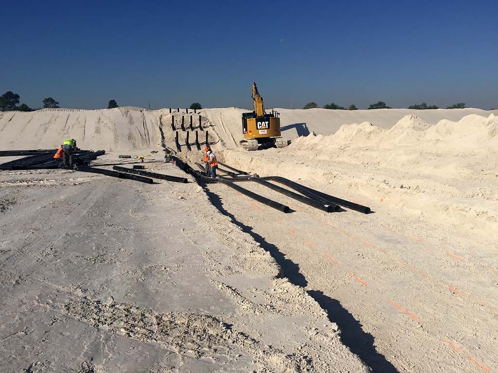 This week, COMANCO Environmental began installing outlet drains on a gyp stack expansion project in north Florida. COMANCO excavated to the appropriate grade using a GPS-equipped excavator. Once the outlet was to grade, the liner seepshields were then extrusion welded to the existing liner. The seepshields act as a barrier to keep water flowing through the outlet pipes from eroding away the gypsum around them.