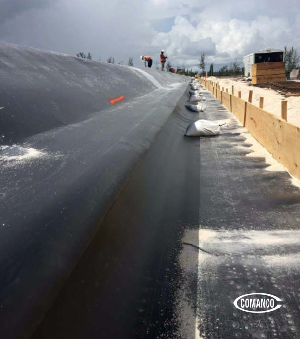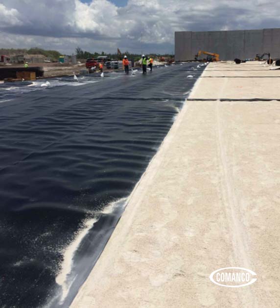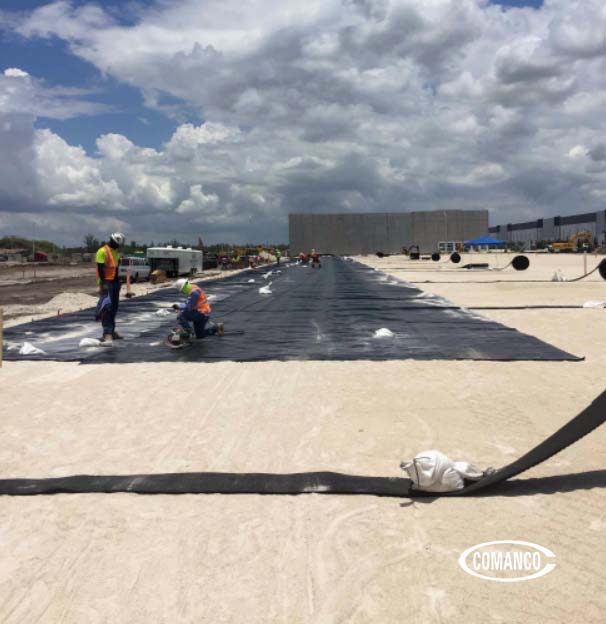 The COMANCO team, led by Superintendent Jorge Barrantes, are currently installing a 4.5 acre 60mil HDPE geomembrane vapor barrier system. The design is complete with geovent strips beneath the liner that ties into a 6” Sch80 PVC header system that directs any potential vapors beneath the building out and away from the property.
