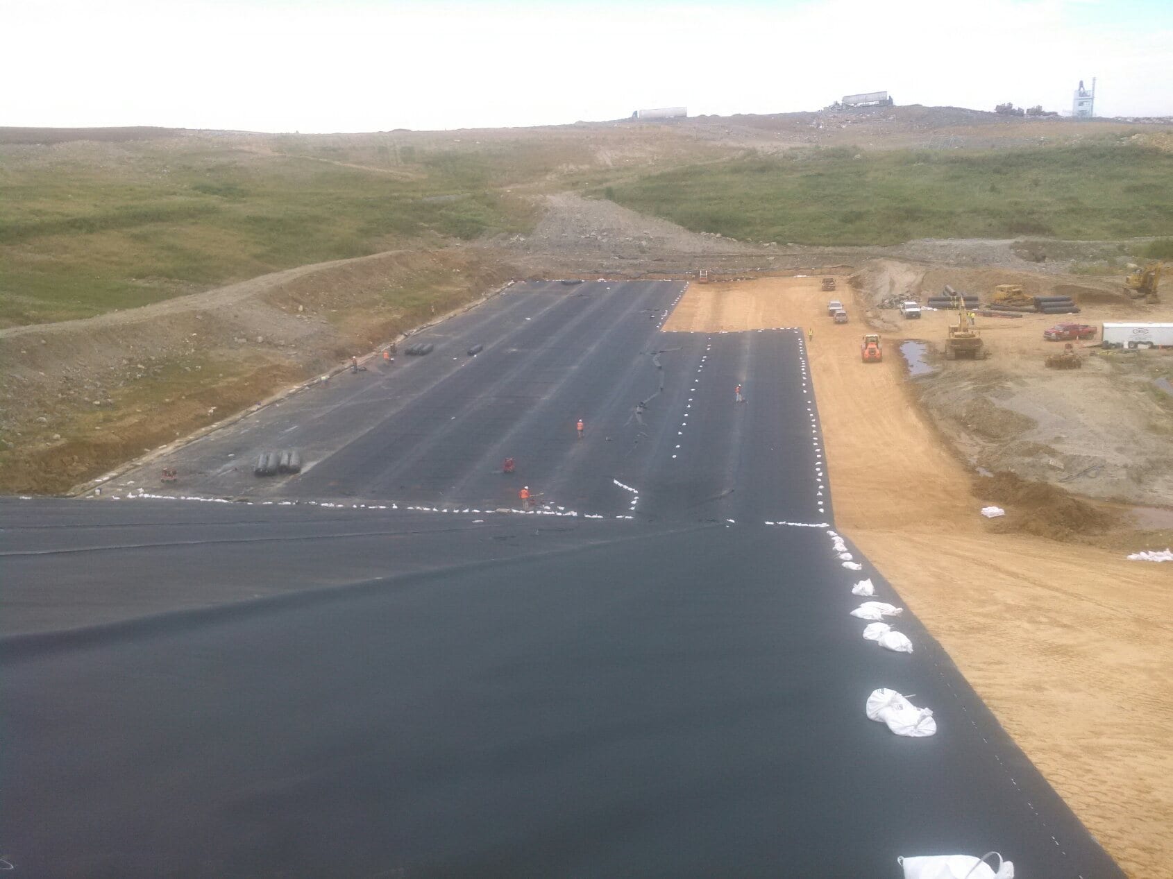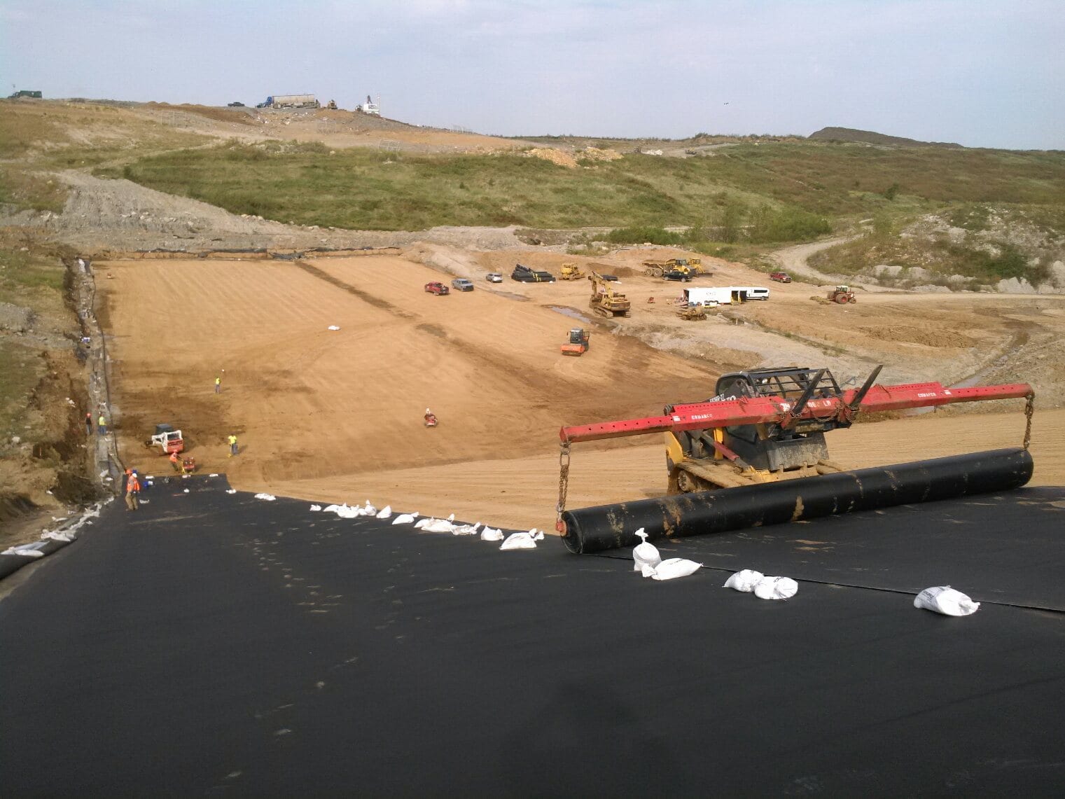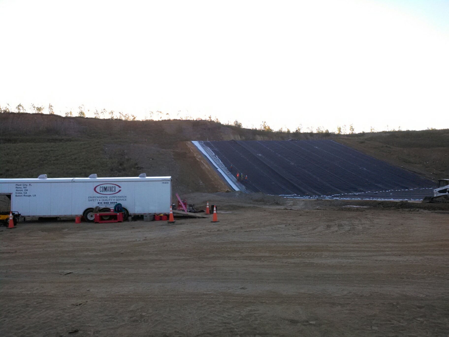 A COMANCO crew led by Project Superintendent Larry Graham is almost finished with a geosynthetics installation for a cell expansion project outside Kansas City, MO. To date, work completed consists of a 4 layer, 4 acre lined containment system. From subgrade to protective cover the system includes: 60-mil textured HDPE geomembrane layer, geosynthetic clay liner layer, 200-mil geocomposite layer then another 60-mil textured HDPE primary layer. The team also lined an LCS trench that spanned the cell with geomembrane rub sheets and separation textiles as well as a large sump area and riser on the east end of the cell. COMANCO will be going back later this month to complete the final 2.5 acres of geotextile layer above the granular drainage layer.