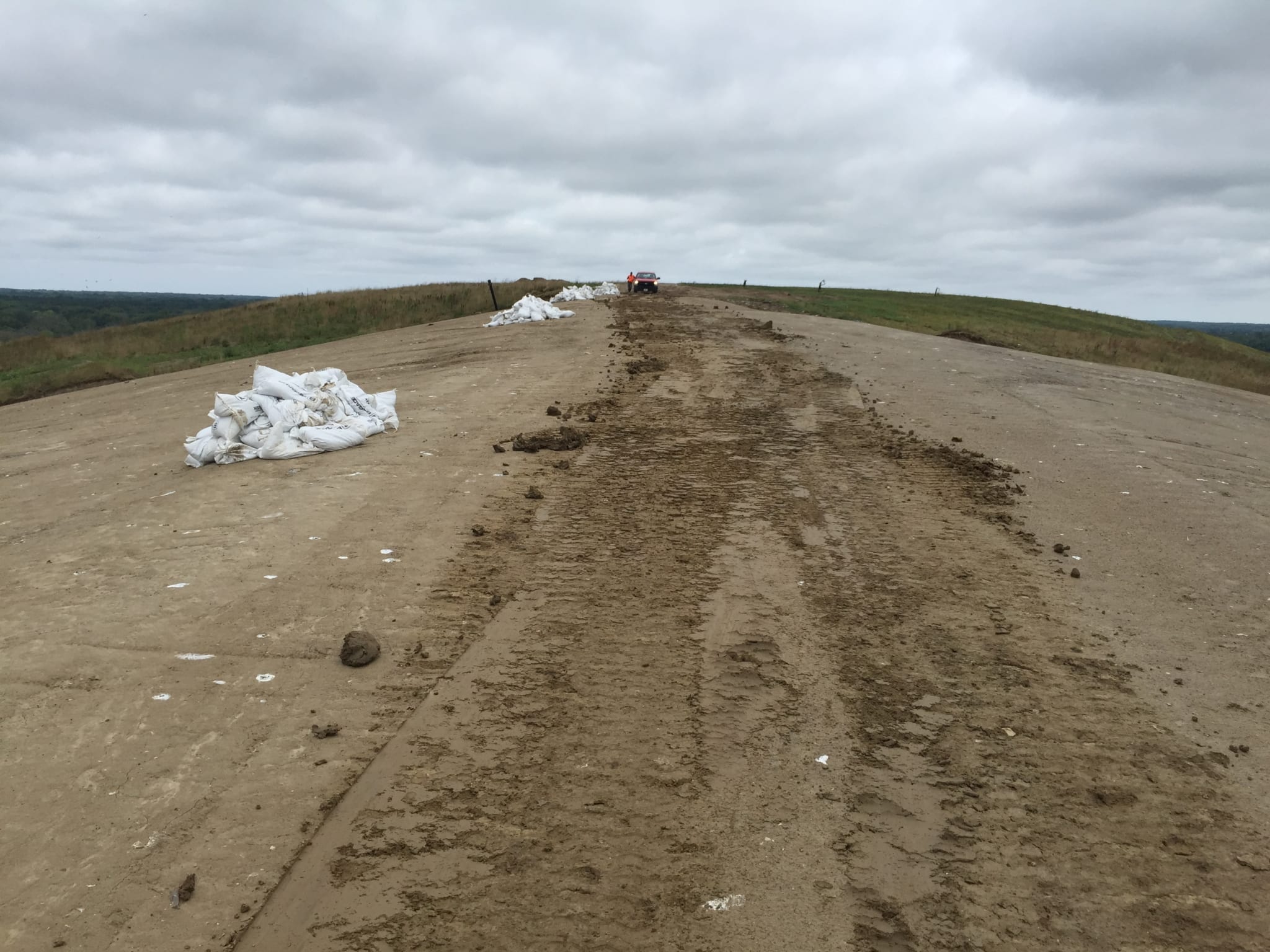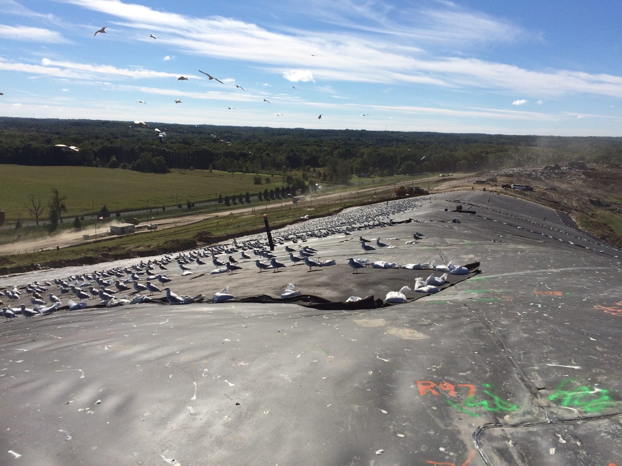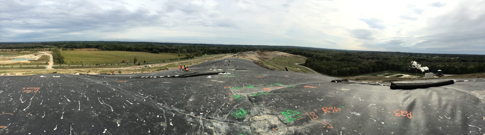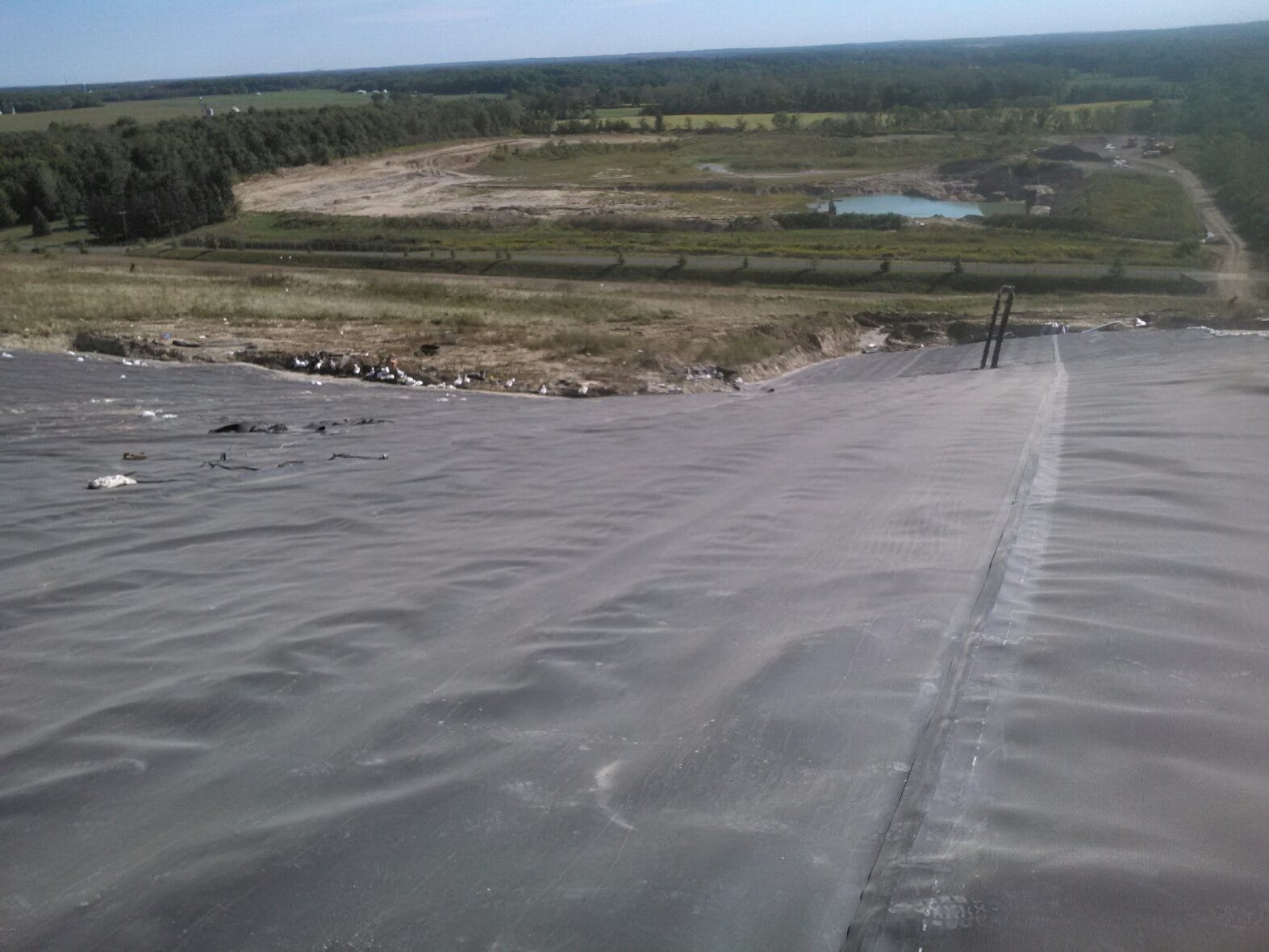 Superintendent LeRoy Smith and his ten man crew completed a 7 acre landfill capping project earlier this month. The 295,500 square foot cap system included a geosynthetic clay liner layer on the subgrade and a 40-mil textured LLDPE geomembrane primary layer on top. The cap itself was enclosed on north, east and west ends producing almost 2,500 linear feet of extrusion weld tie -in. The crew also installed 200-mil geocomposite for future down chute and diversion berm locations that spanned about 465 linear feet a piece; intended for surface water conveyance. Located right on Lake Michigan, this crew had to battle high winds and rain throughout the duration of this project. Supervision did a great job maintaining COMANCO’s high level of safe work practices during these tough conditions. They also did a great job traversing the cap location with tough access points, fully utilizing a competent spotter system. Please see some photos of the project below.