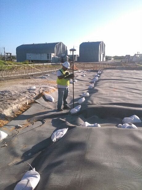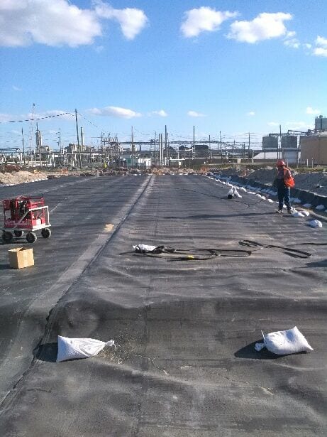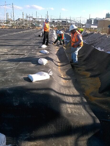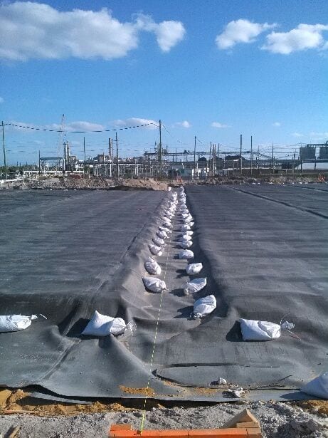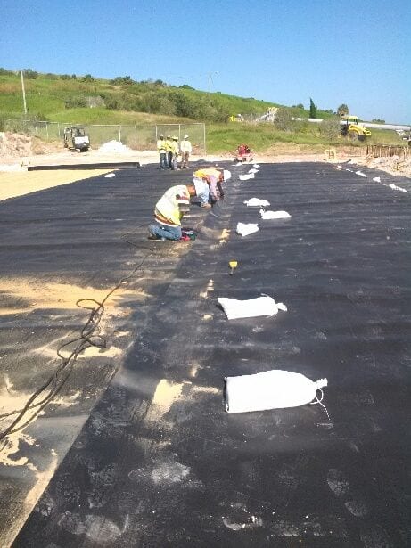 A COMANCO crew led by Jorge Gomez and Charlie Ingle completed the installation of a liner on a phosphoric acid dewatering pad at a Central Florida chemical plant last week. Sand and concrete will go on top of this liner, and the containment pad will divert water into a floating ditch. The crew will complete the installation by attaching the liner to the concrete with stainless steel batten bar in the next few weeks.