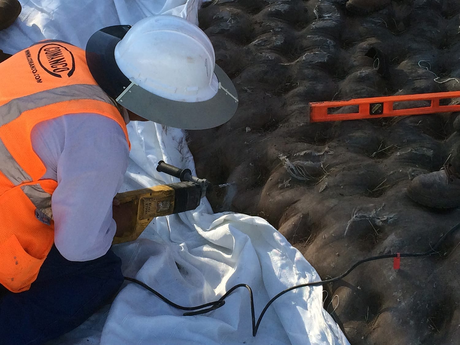 COMANCO has recently completed the first of two Fabriform flume structures for a Pasco County Landfill in Florida. Superintendent Todd Kirkman and Foreman Jorge Gomez are leading the eight-man crew. The first flume consisted of 2,000SF of 6-inch Fabriform which tied into an existing flume. COMANCO utilized its concrete pump to fill the flume with 30 cubic yards of a pumpable grout mix. This structure will help serve as a storm water runoff system for the landfill. KEEP UP THE EXCELLENT WORK!