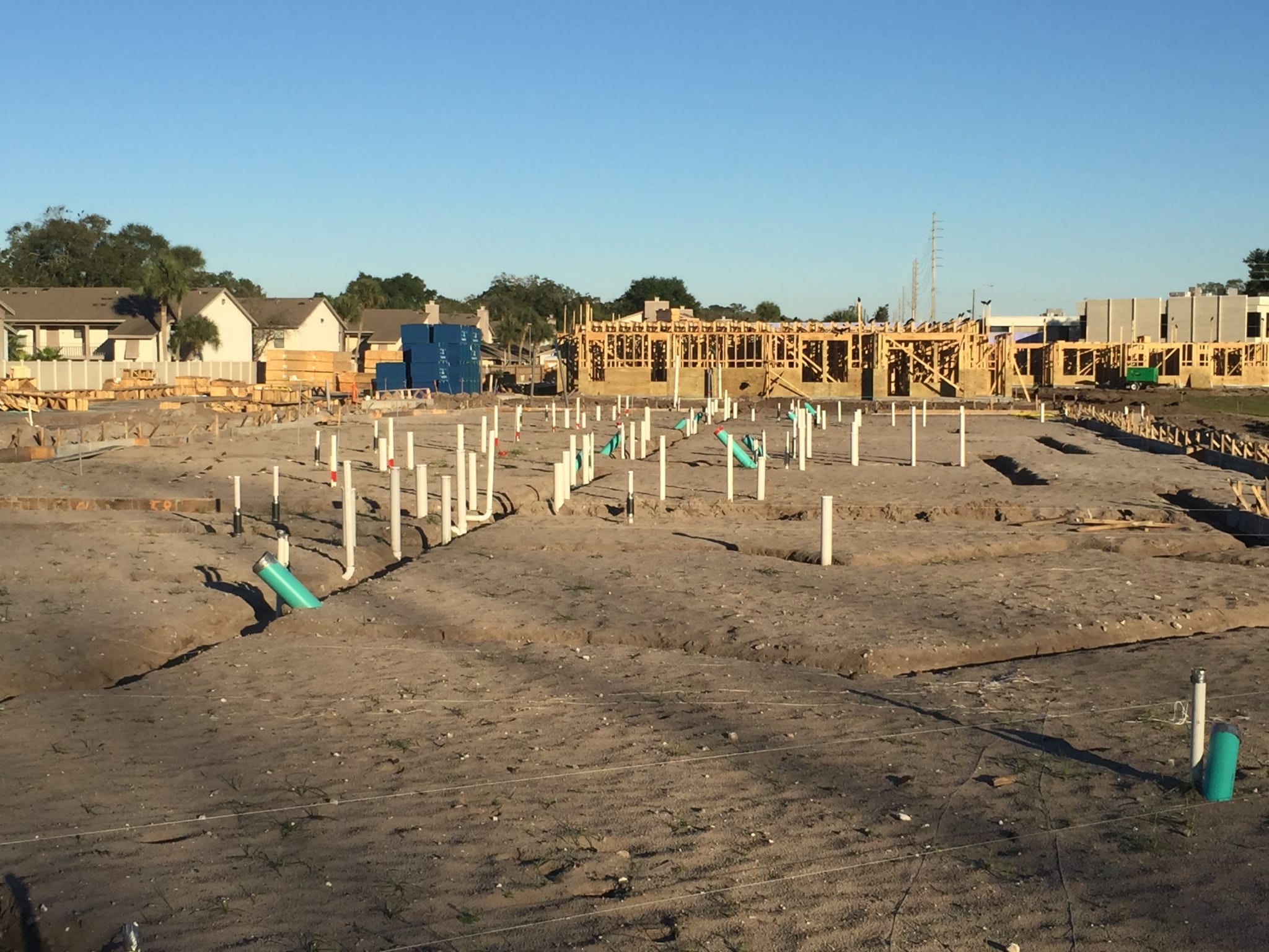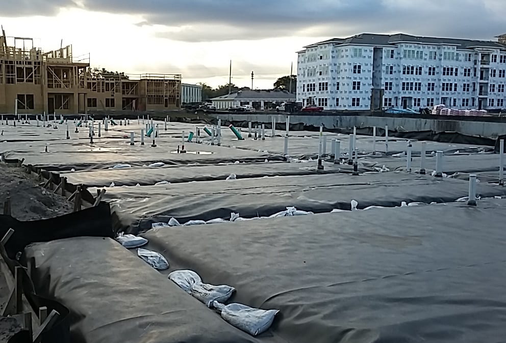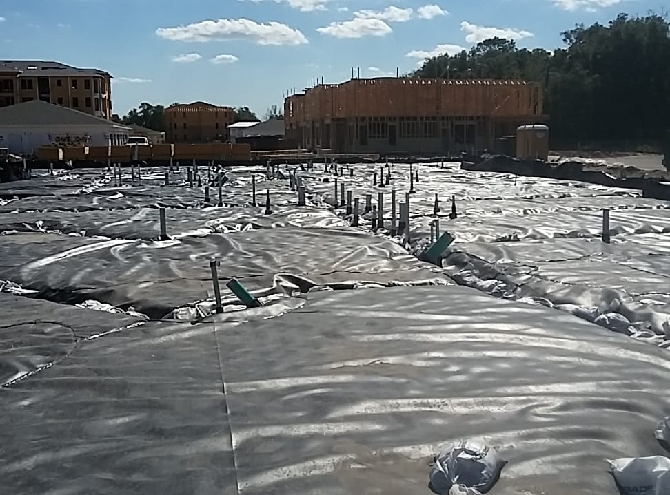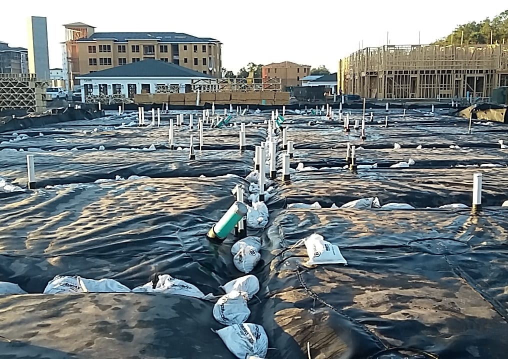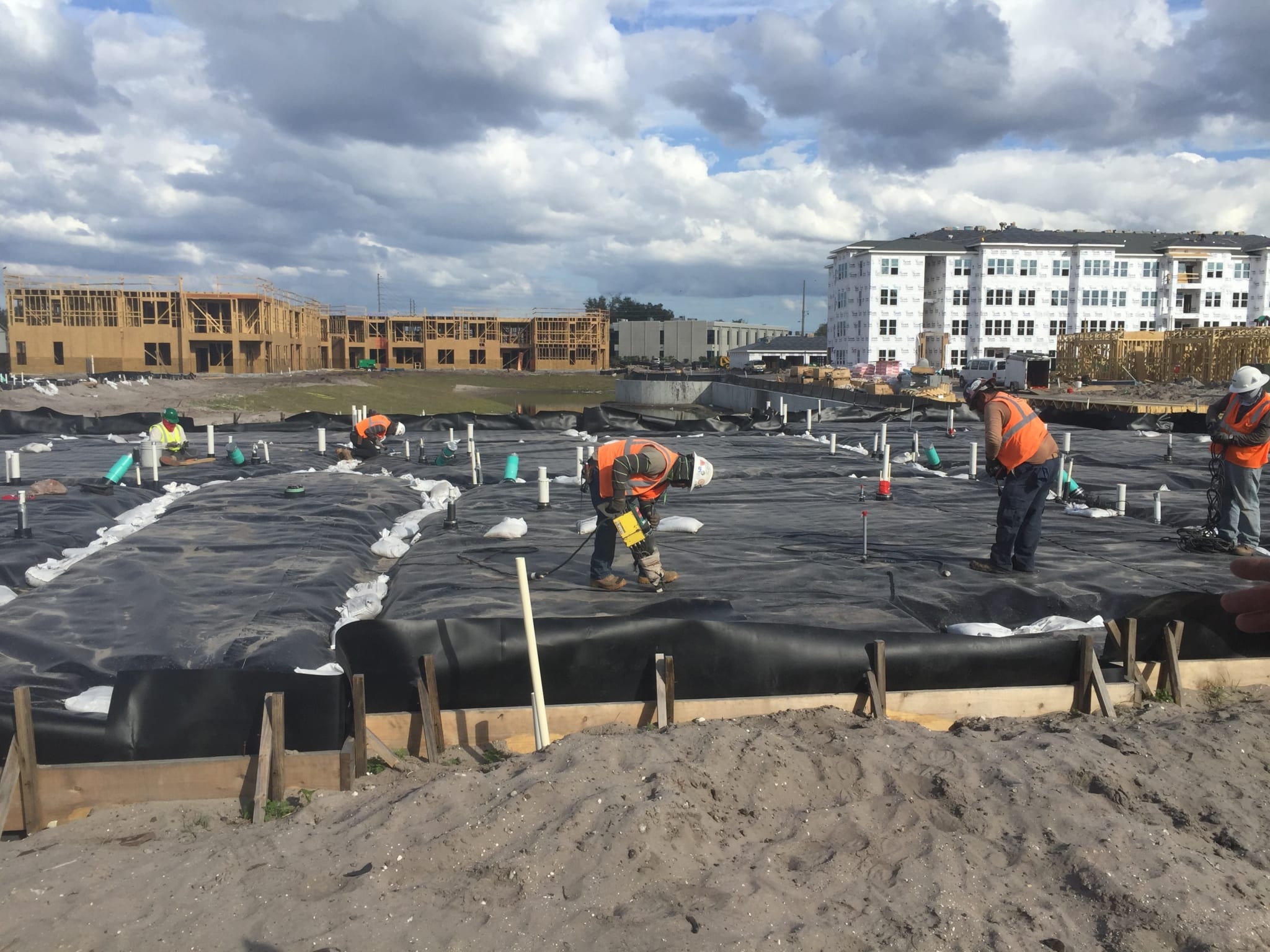 COMANCO is finishing up the installation of a geomembrane vapor barrier beneath the foundation of a new apartment building in Orlando, FL. The crew led by Arnulfo Martinez installed a 40mil HDPE geomembrane over the footprint of the future building which will act as an impermeable barrier, and prevent unwanted gas from migrating into the building. The project was quite challenging, as it also required the installation of 250+ pipe boots around all of the penetrations throughout the building. The crew worked hard to ensure the high level of quality COMANCO guarantees with its work. Despite the high level of detail, the crew worked efficiently and successfully completed the project safely and on time.