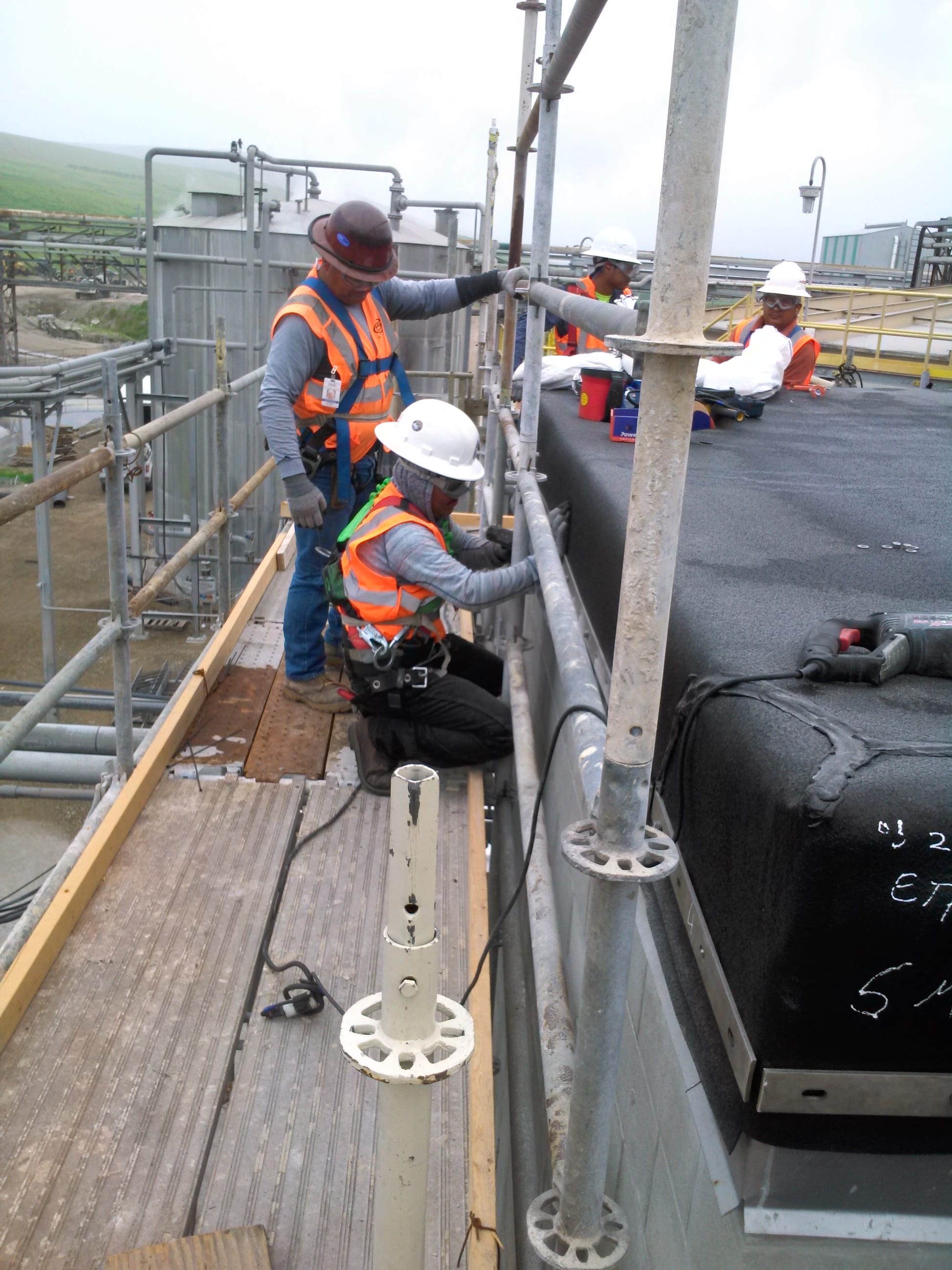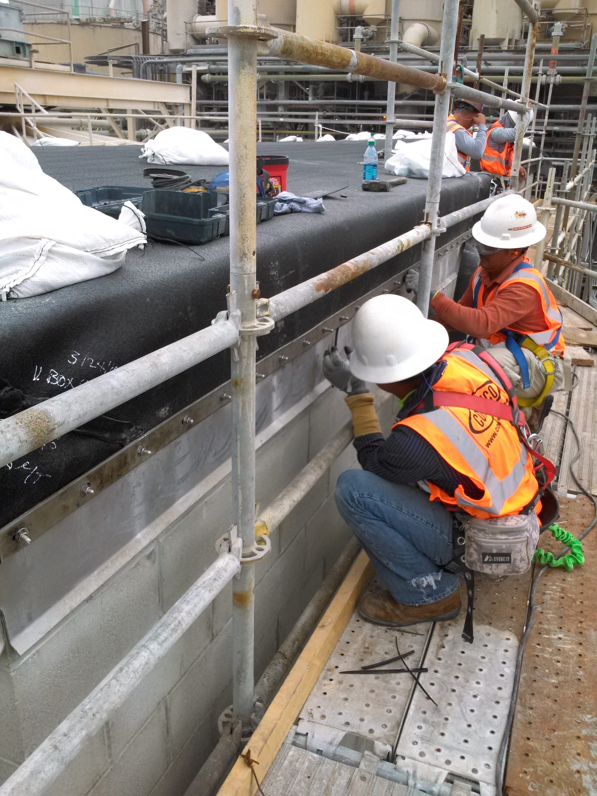 COMANCO has completed the first phase of a roof liner installation for a new MCC Building in a chemical plant in Central Florida. The crew was required to utilize scaffolding due to the limited access, and relied on their fall prevention training to ensure proper tie-off practices. The crew discussed daily the hazards involved with elevated work, and took measures to prevent any tools or materials from falling from the scaffold. The project was a success, as the crew completed the work with zero safety incidents, and the client received a new waterproof, chemical resistant HDPE roof liner.