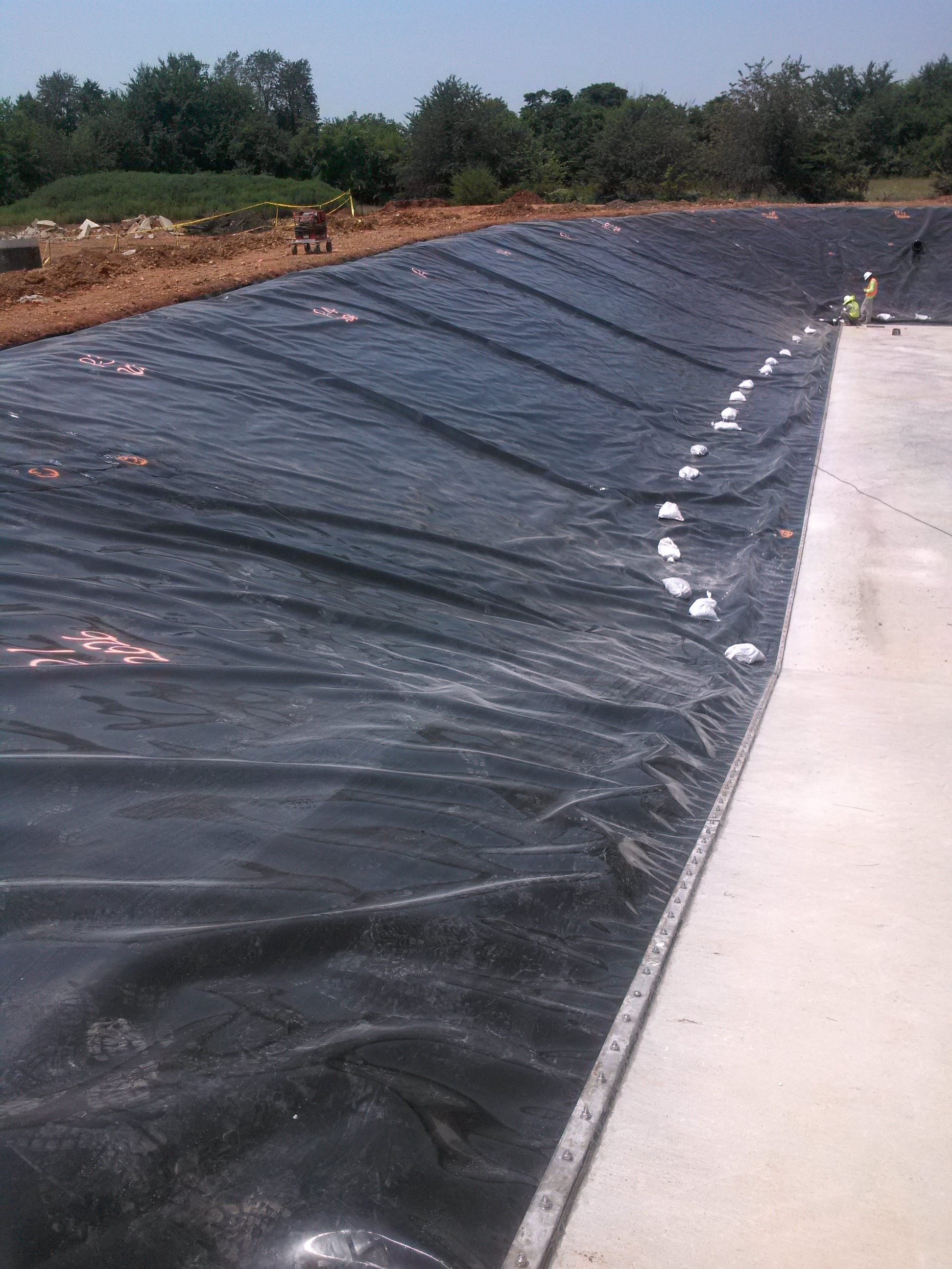 Earlier this week, COMANCO Environmental finished a pond containment project at a Water Treatment Facility near Springfield, Missouri. The 11 man crew, led by Superintendent Martin Calderon, installed 2 layers of geosynthetics – an 8-oz non-woven geotextile cushion layer with a smooth 60-mil HDPE geomembrane layer over top – approximately 15,400 SF each. The geosynthetics ran down the pond’s slopes and tied into a concrete access ramp that ran down one side of the pond and across the bottom. In order to maintain a water-tight seal at the concrete transition, a stainless steal batten bar attachment was installed and for pipes protruding into the pond, a pipe boot application was applied.