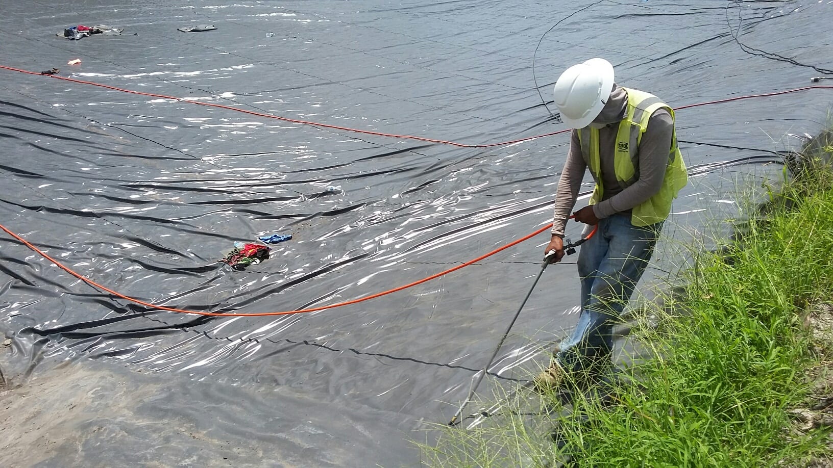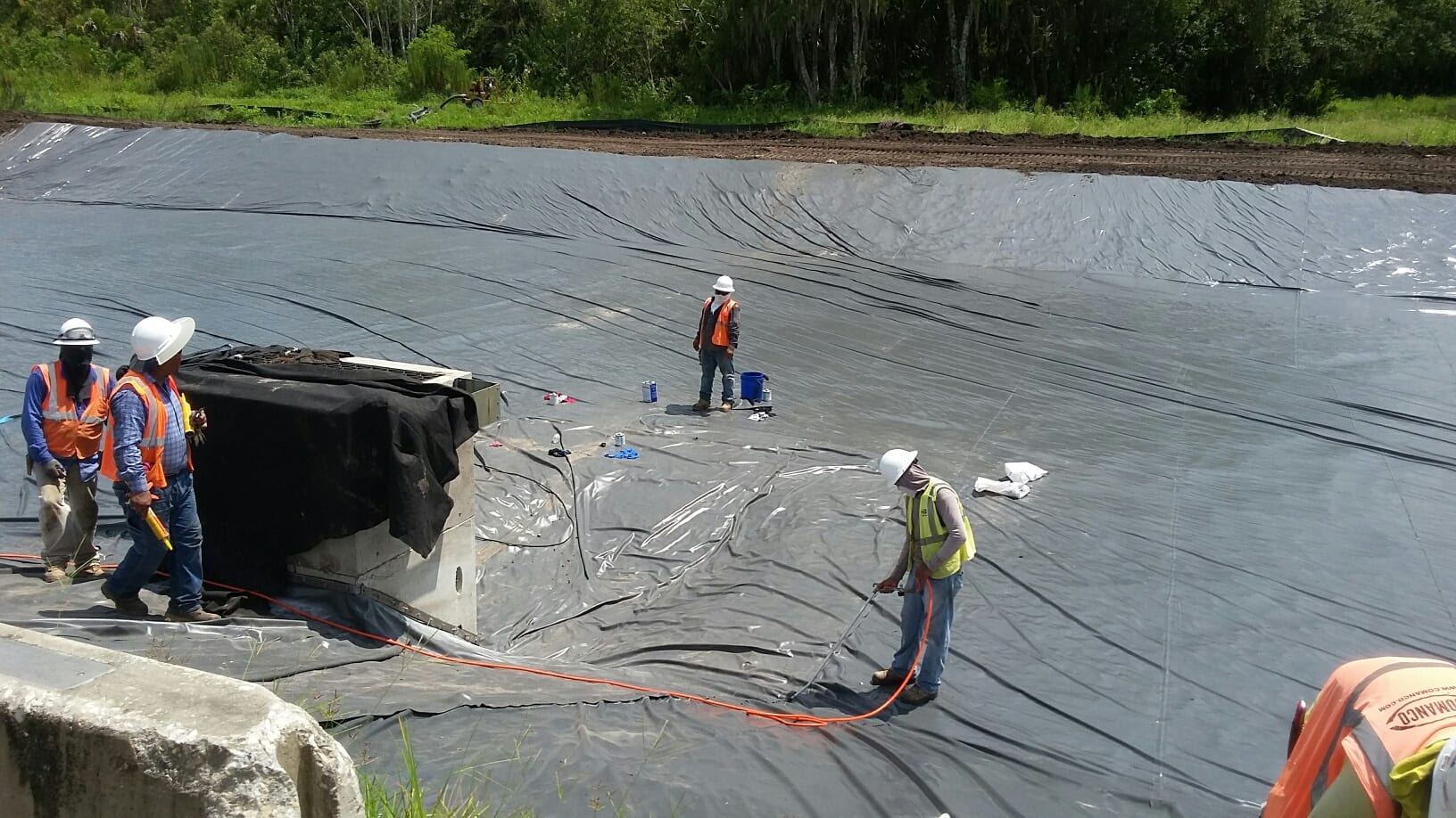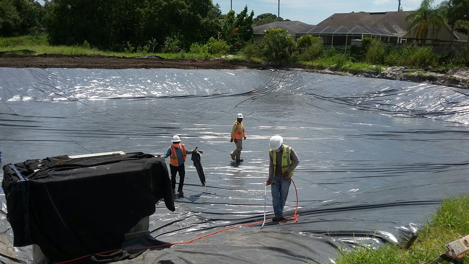 COMANCO has completed a 30mil PVC pond liner installation in Sarasota, FL. The project, which was done in two phases consisted of approx 50,000 square feet of 30mil PVC liner and batten bar attachments to concrete storm water structures. Superintendents Jorge Barrantes (1st phase) and Larry Graham (2nd phase) battled tough Florida summer rains in order to complete the pond. COMANCO can be seen completing our Quality Control air lance testing prior to the backfill of the entire pond.