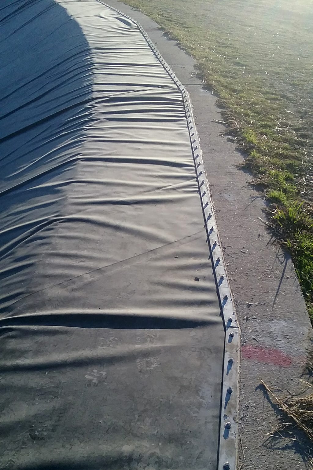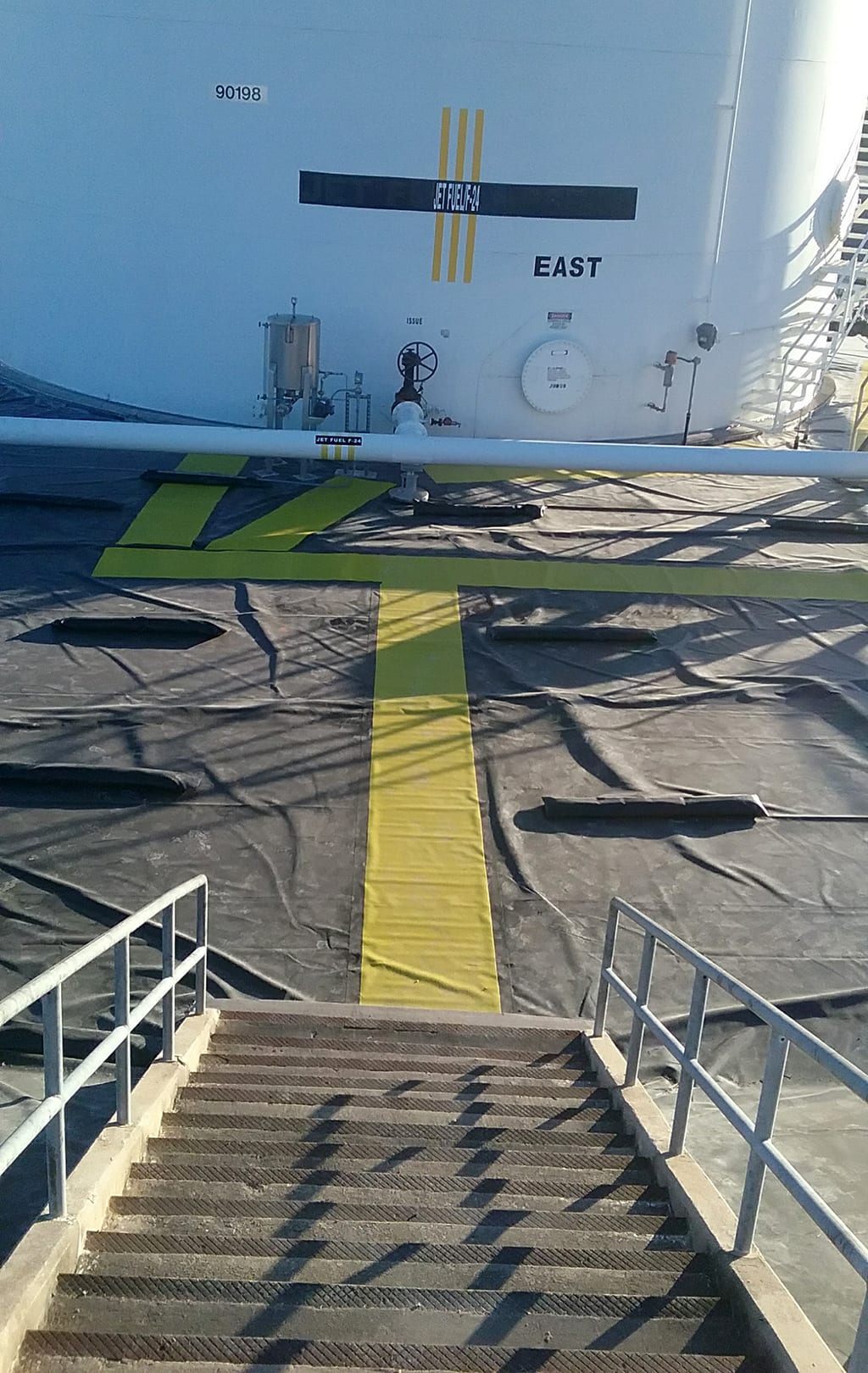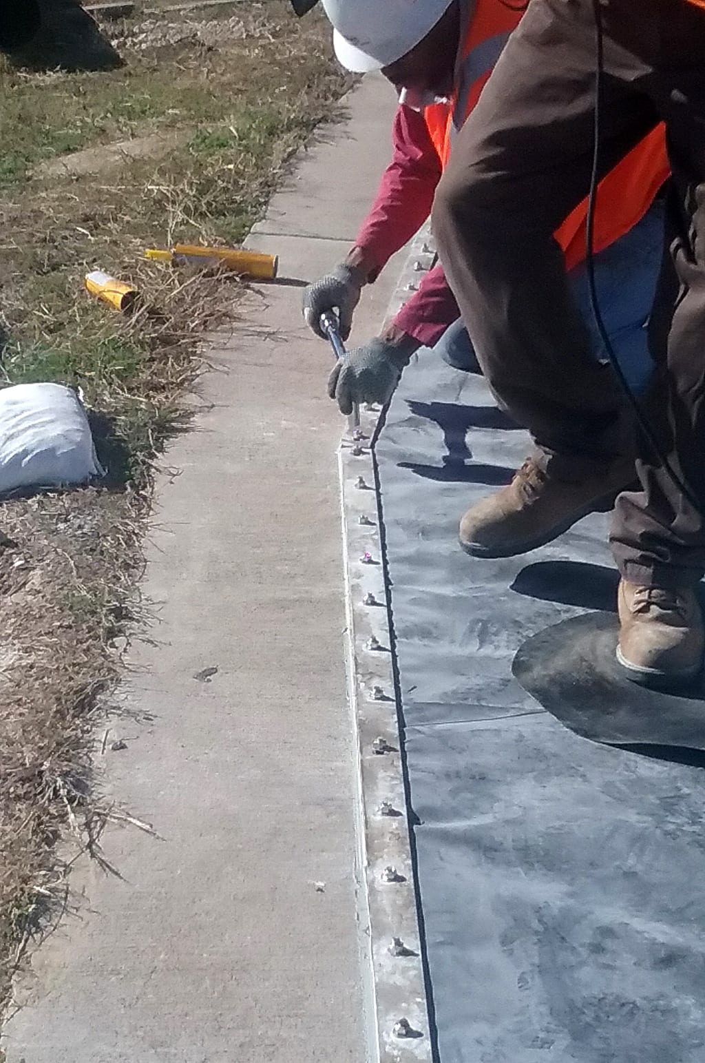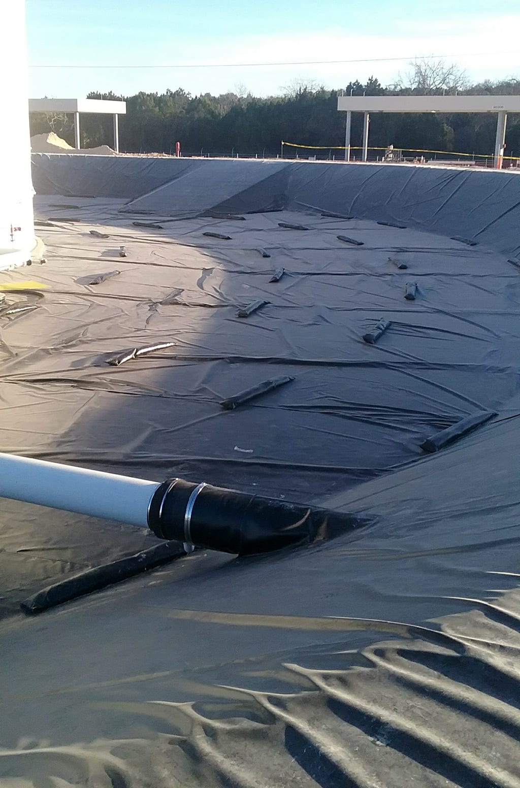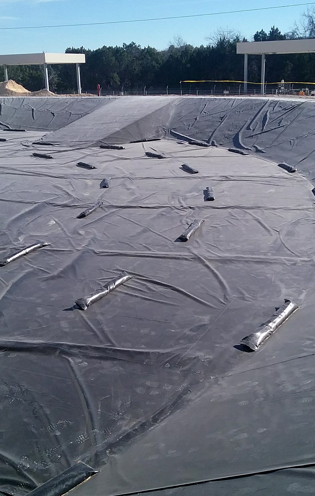 COMANCO Environmental has finished up construction on a secondary tank containment liner project near Killeen, TX.  Two identical secondary tank containments were lined with a geocomposite cushion layer on the concrete subgrade with a reinforced XR-5 liner being installed over the top to act as the containment layer.  The XR-5 was mechanically fastened to the interior tanks’ concrete ring walls and outside perimeter with batten bar.  Additionally, custom 5’ long x 6” thick XR-5 sand tubes were created and placed to act a ballast system for adverse weather conditions in the area.  Lastly, a yellow, textured XR-5 Walk-mat was installed to allow for safe access for maintenance work on each tank.  Superb job to Supervisor, Max Macedo, and his 9-man crew for completing this very detailed job with quality workmanship safely without any incidents.