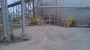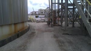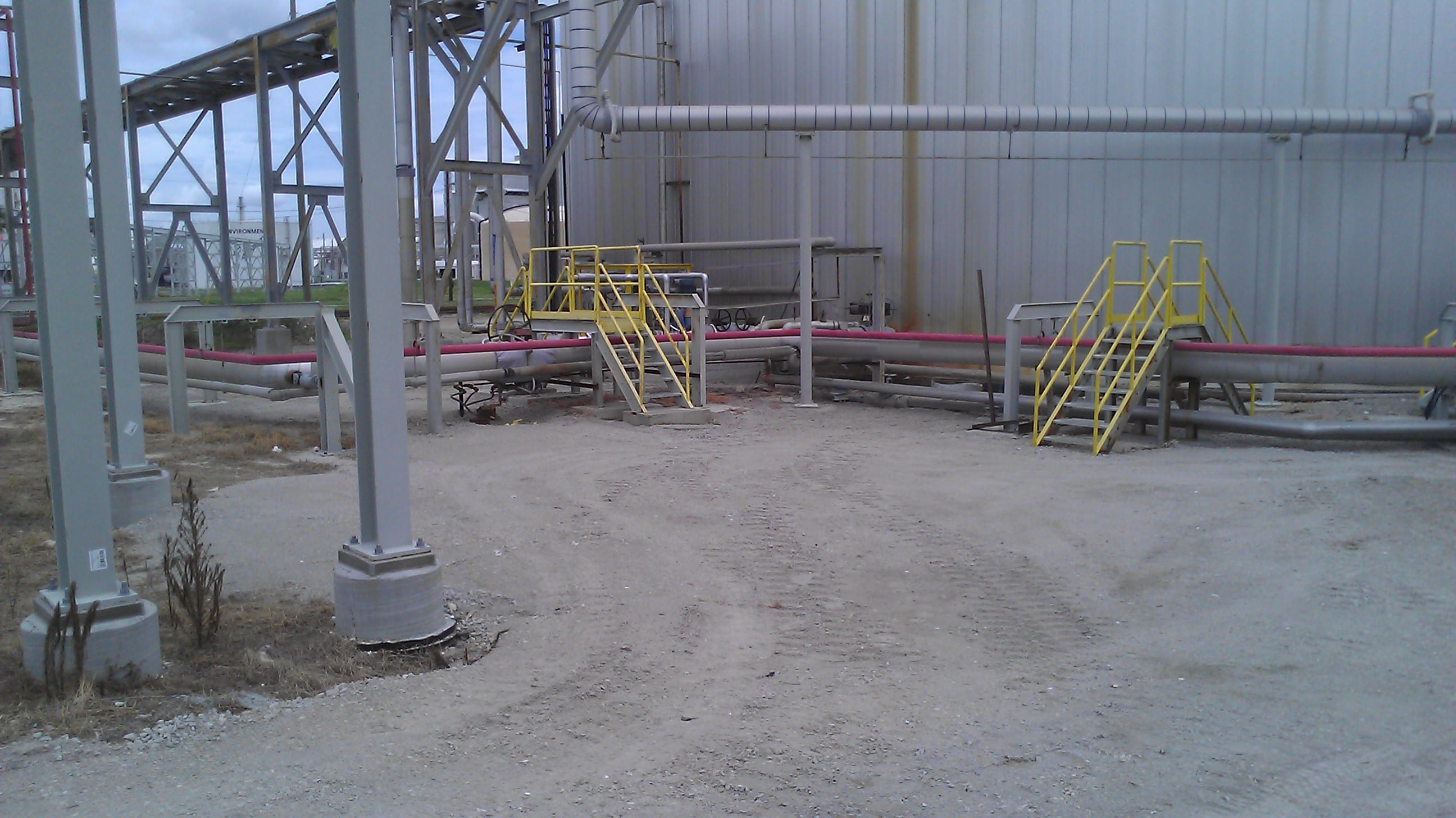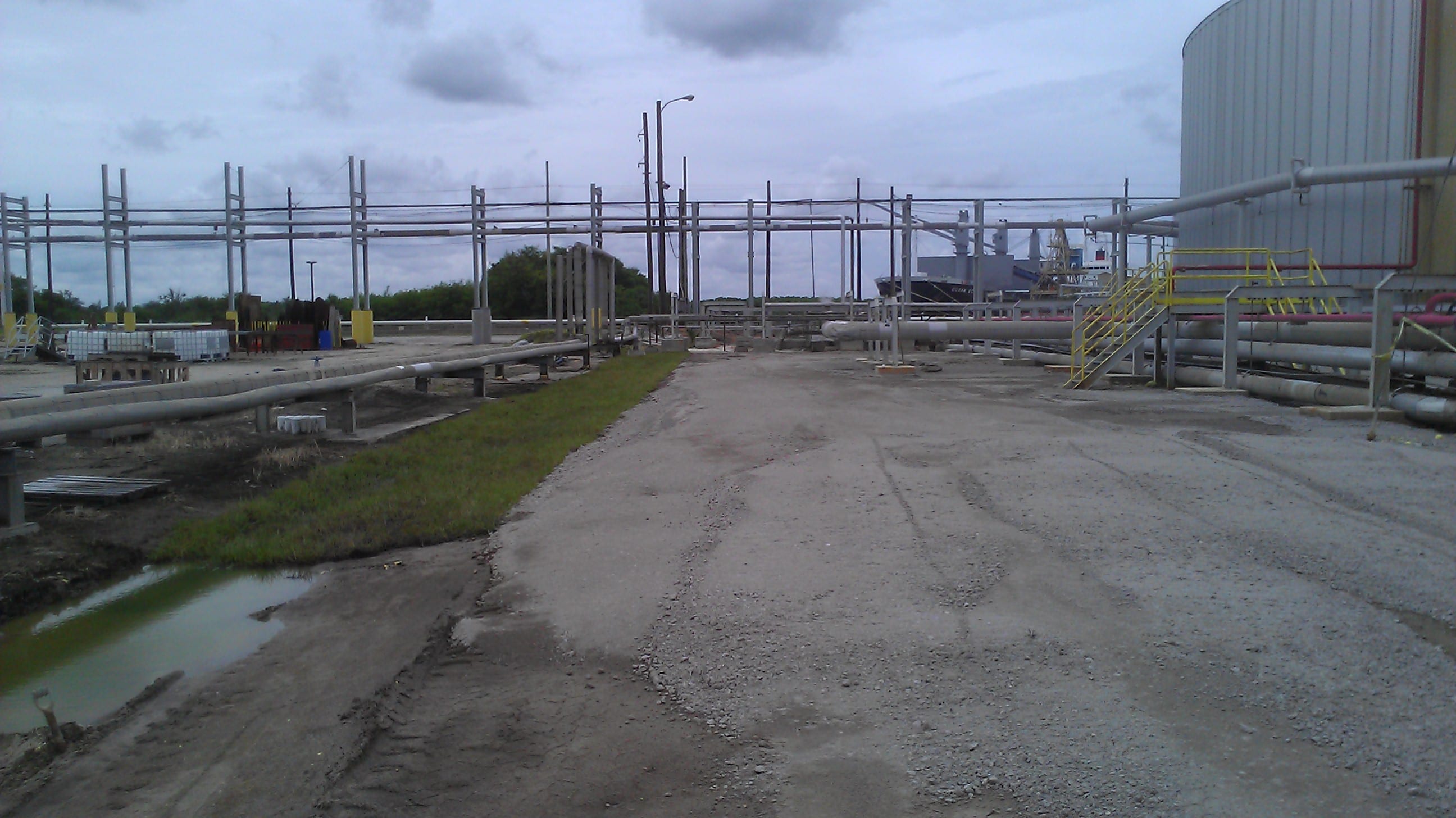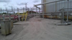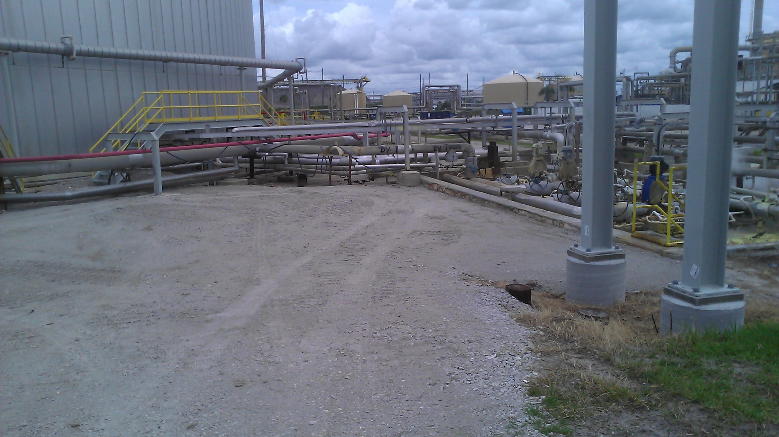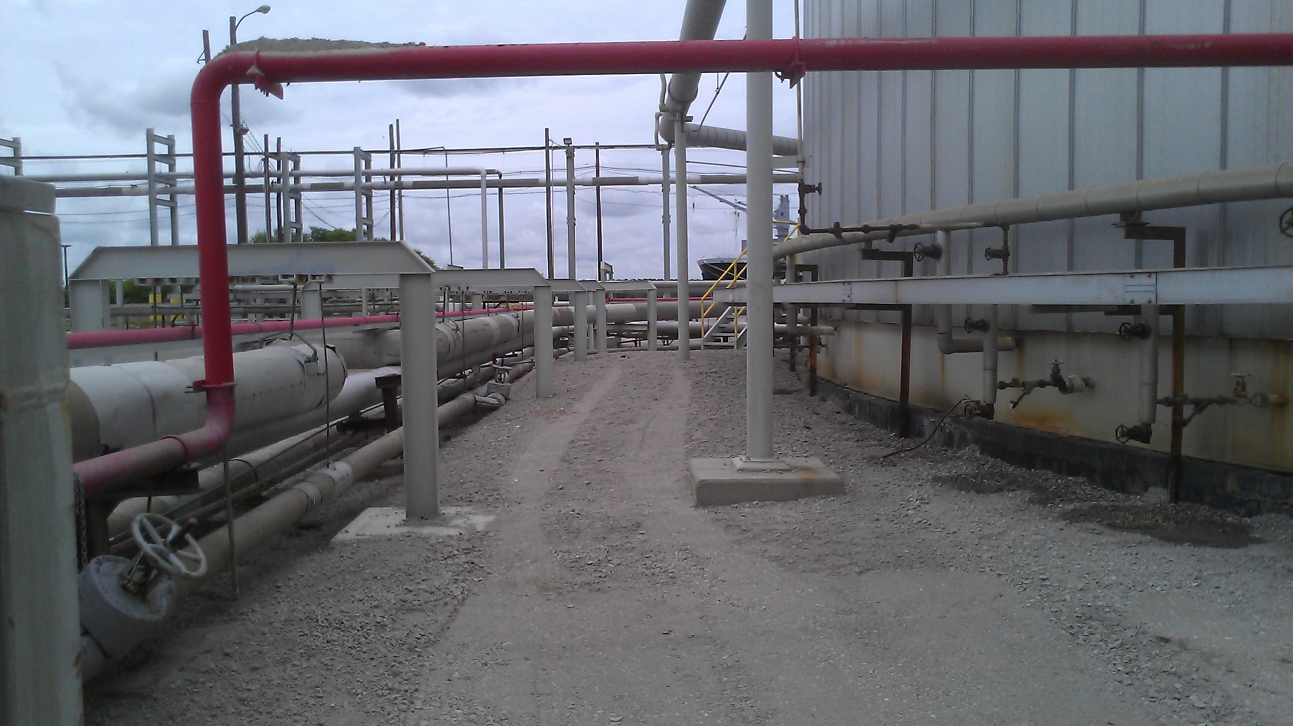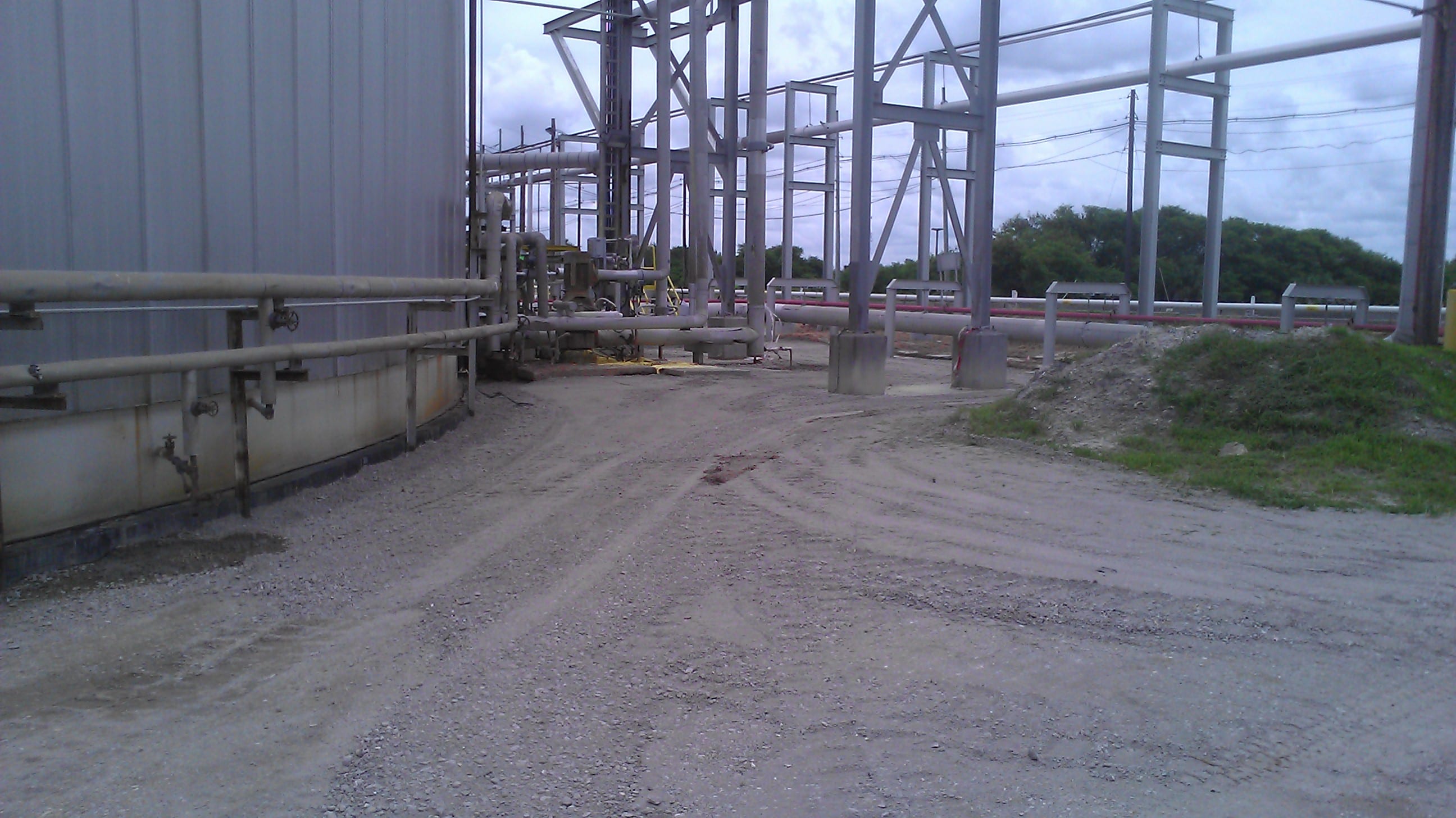 The COMANCO team completed a ground upgrade project around two sulfur tanks at a Gyp Stack site in Central Florida last week. The access area and ditches around these sulfur tanks needed maintenance, and the crew spent a week at the site grading the access and ditch areas, placing and compacting crushed concrete around the tanks, and sodding the ditch. The team had to get creative in some areas since pipe overhead and at ground-level provided little access for work. The project was completed to the client’s satisfaction with no incidents, below budget, and on time. The crew was led by Site Superintendent Tony Boatman, Project Manager Dragan Milosavljevic, and Project Engineer Nick Bridges.