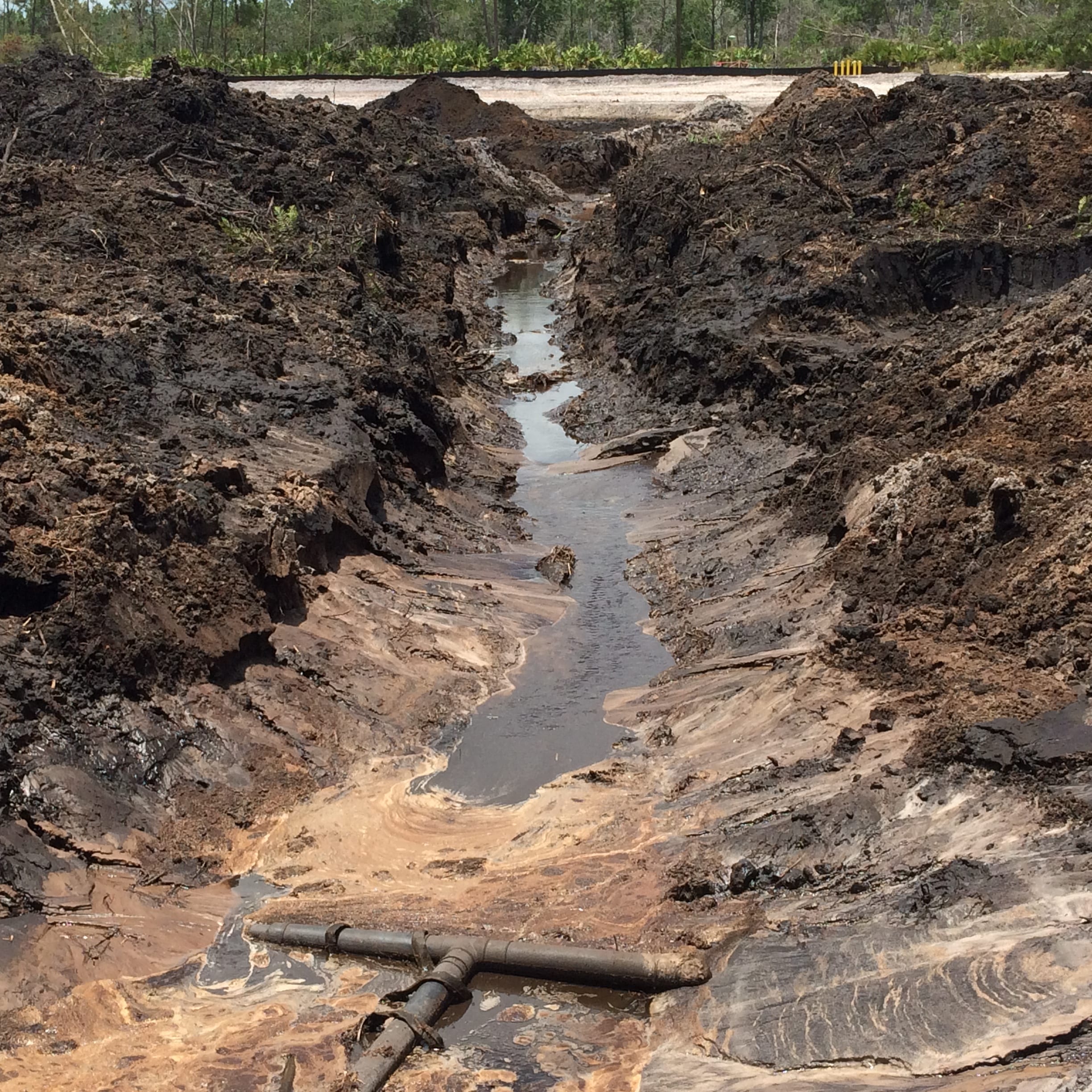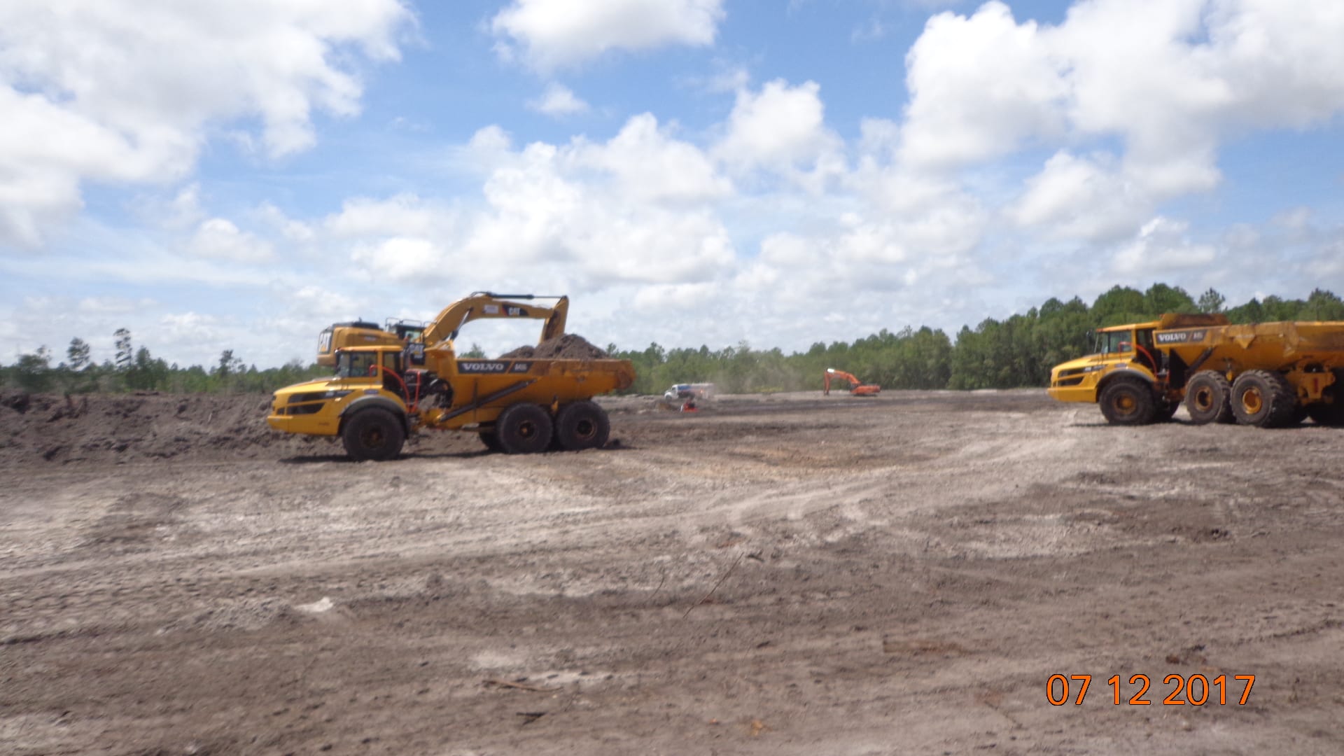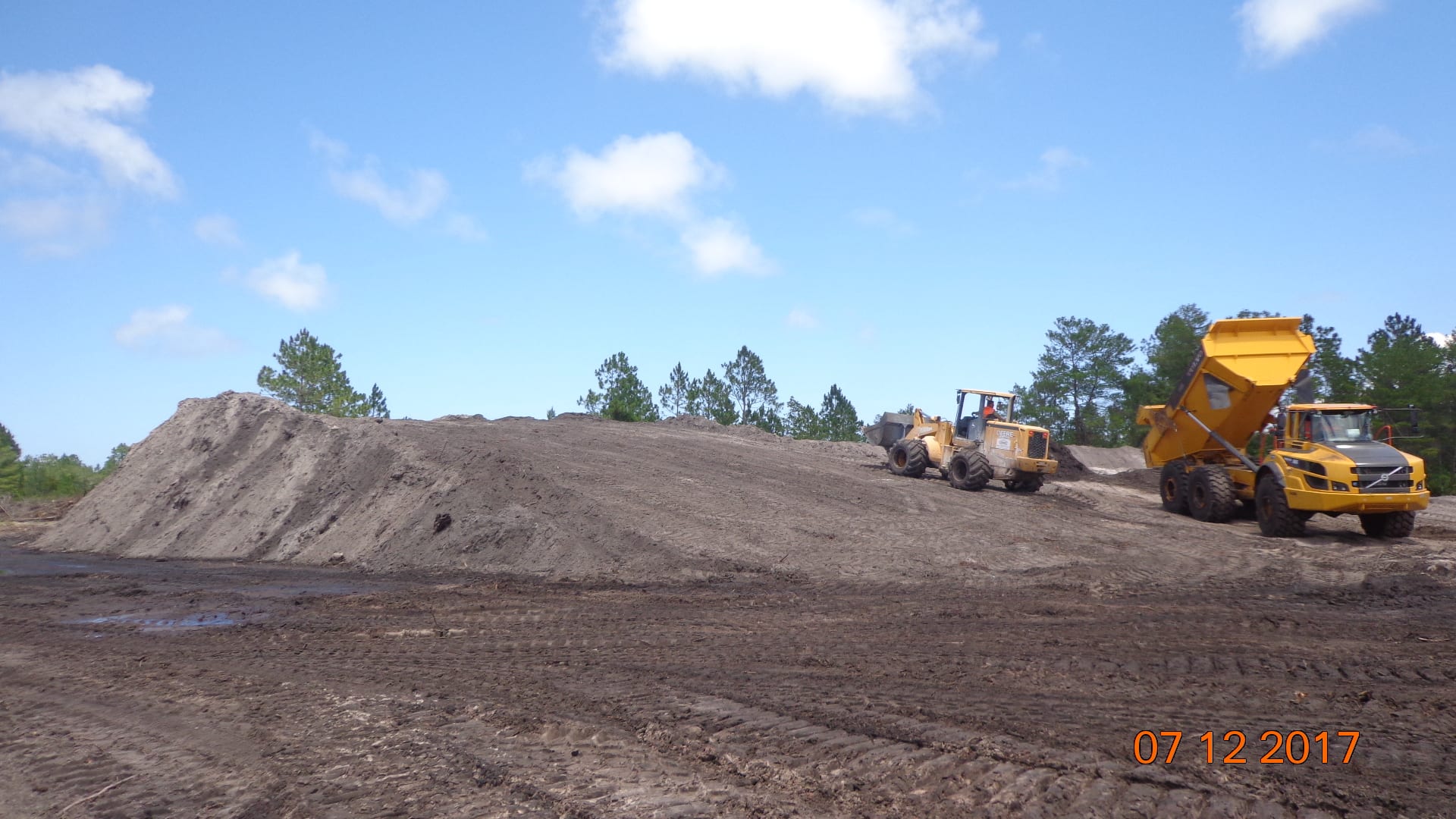 In addition to the earthwork going on at the site, the crew will be installing the Geosynthetics (HDPE geomembrane, geocomposite & GCL), HDPE leachate collection & forcemain piping, concrete stormwater piping & structures & placing sod. Currently, the crew is working on stripping and excavating organic material from the site so that the clean, structural fill material can be brought in to build up the cell.  Dewatering operations at the low lying areas of the site are taking place in order to prepare the subgrade for density testing.  Furthermore, site clearing activities such as tree removal, underbrush clearing & mulching  are concurrently in progress by another contractor so COMANCO can perform its job duties.  Crews from both companies are working together to provide the customer with unmatched quality and service all while maintaining a safe and environmentally friendly work environment.