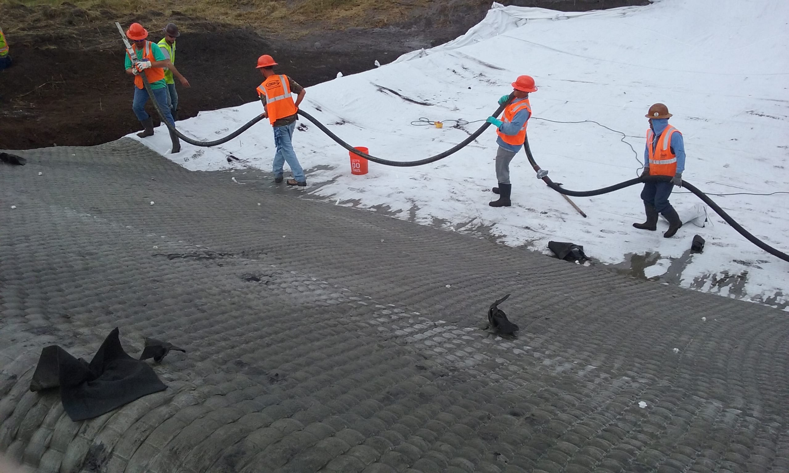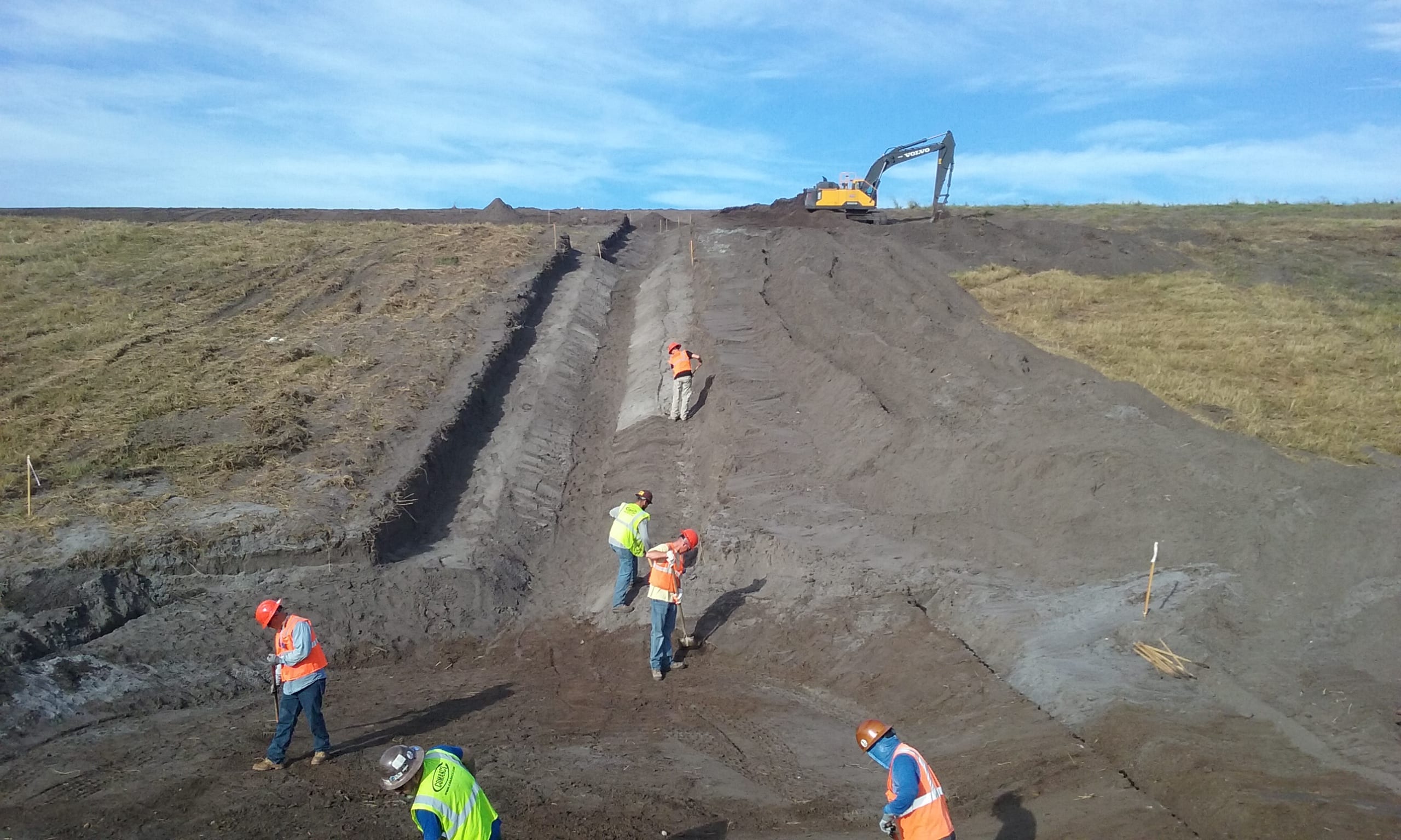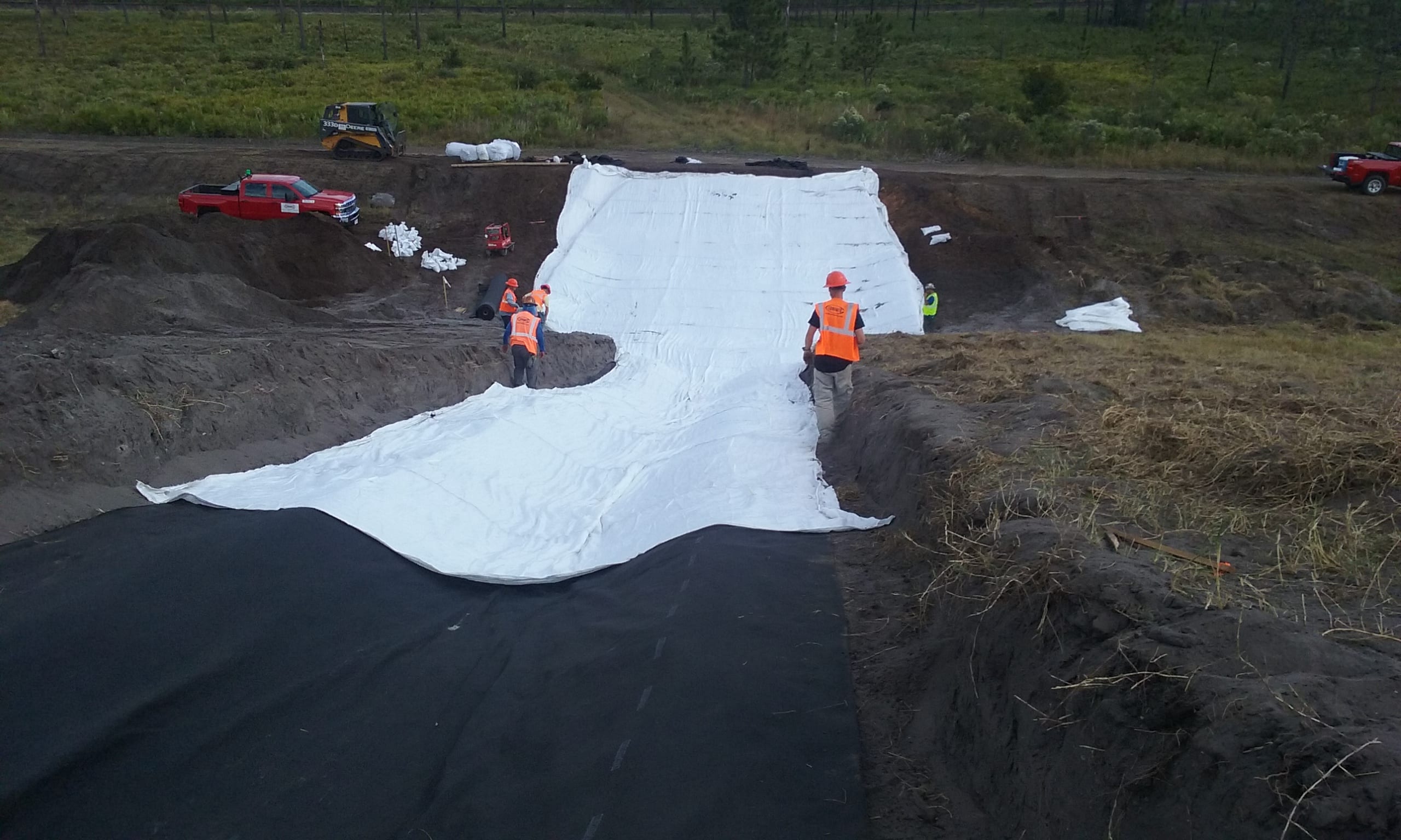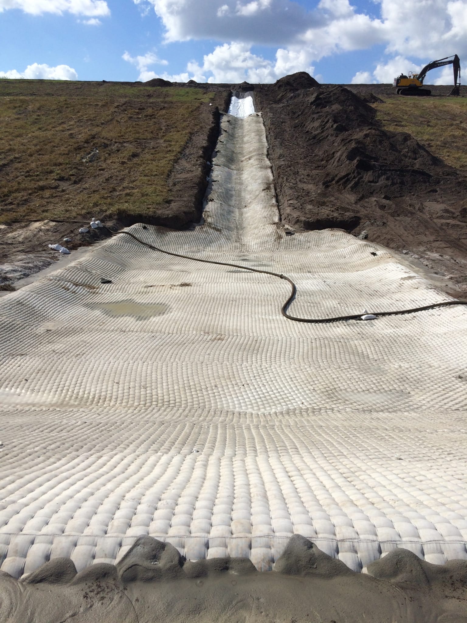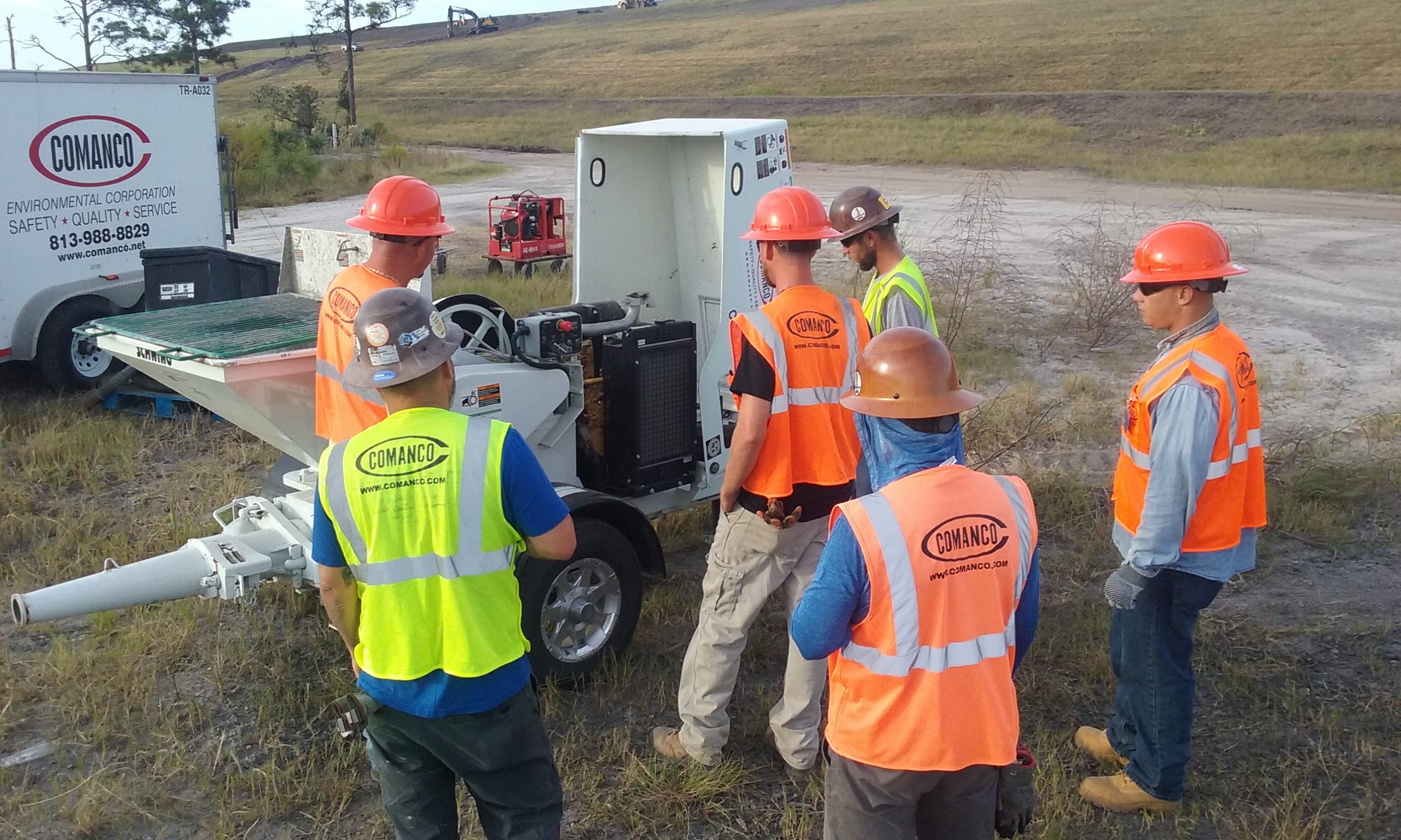 COMANCO is currently working to install 6″ filter point fabriform flumes down the side of a closed landfill cell near Orlando, FL. The two main flumes each measure over 400 LF in length, and vary between 16′ and 45′ in width. The crew led, by Superintendent Chase Yarbrough is also installing three smaller flumes from the top of the landfill to the main ditch where the flumes start. COMANCO is utilizing their own concrete pump to install the flumes, but not before conducting task training on the pump for all employees, to ensure everyone has the knowledge to work safely around the equipment.