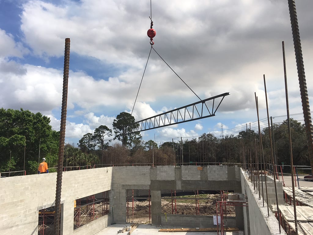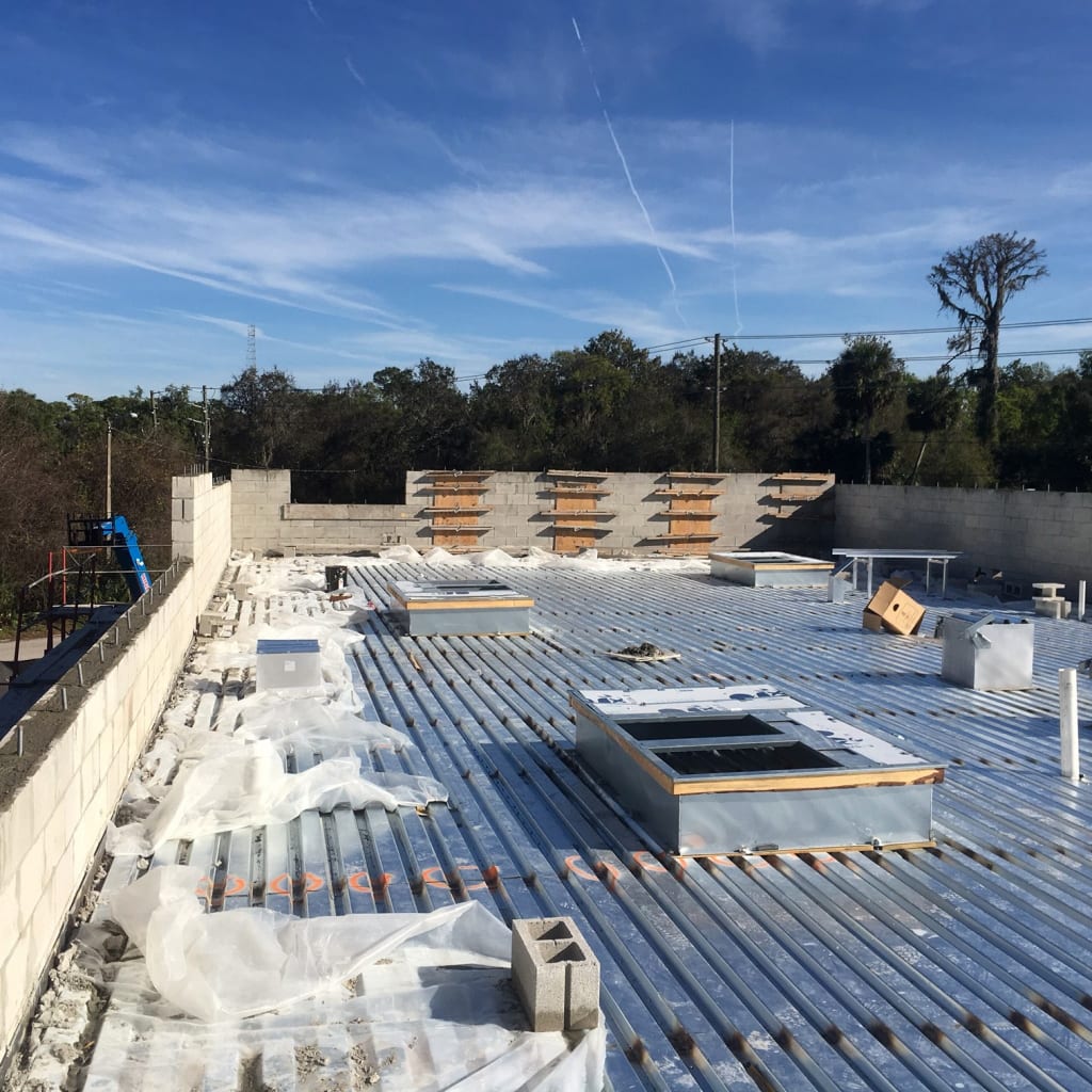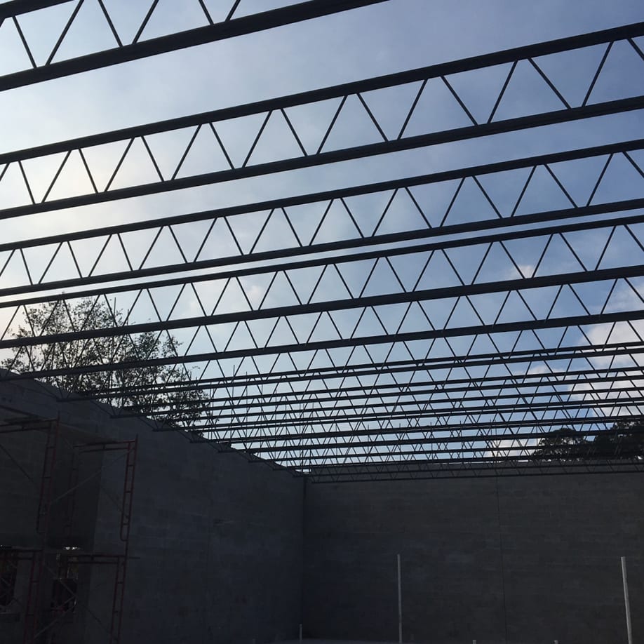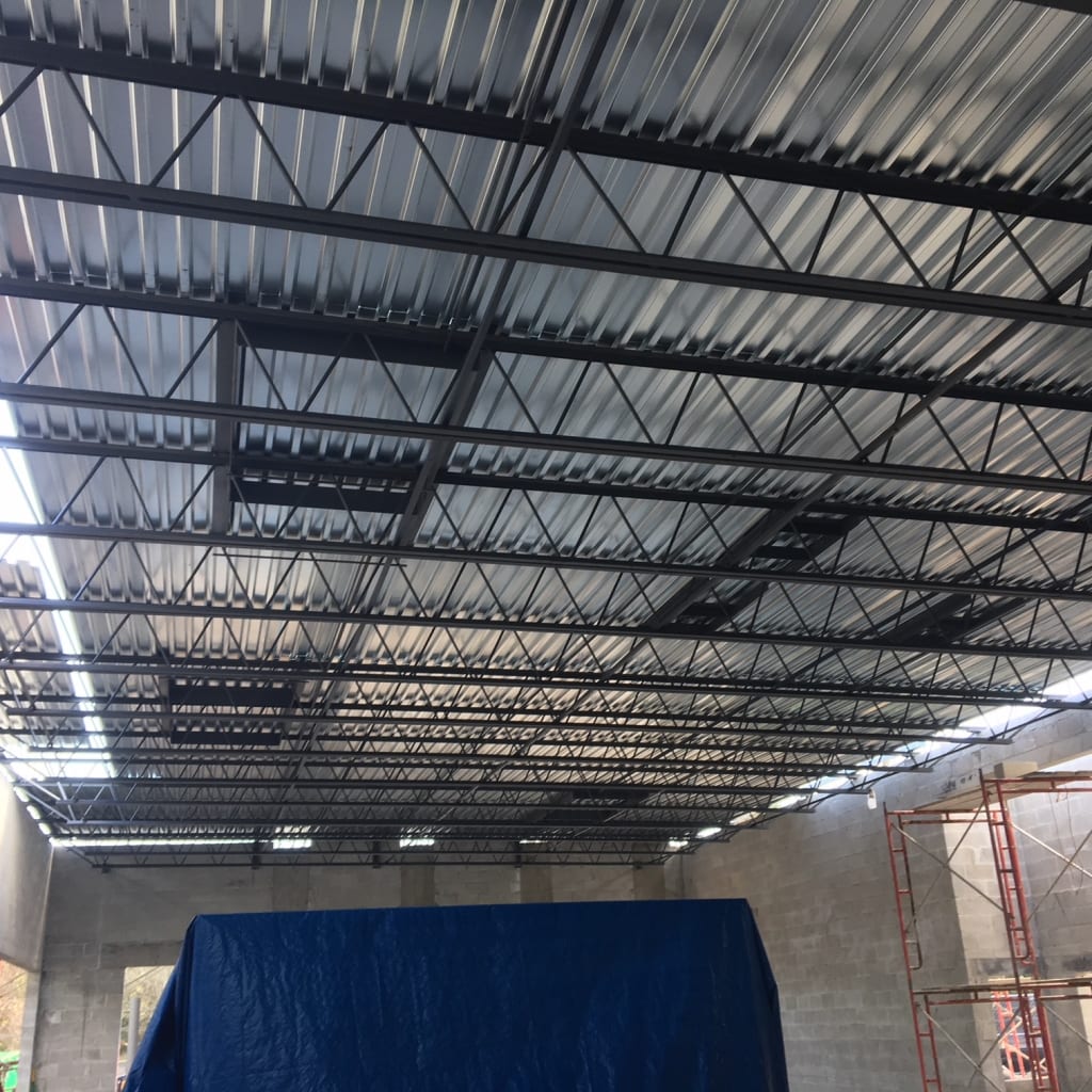 Under the supervision of COMANCO Project Manager Dan McRae, the installation of the steel bar joists and metal roof decking was completed to design in a safe and timely manner. A crane was used to fly the joists in position, allowing welding crews to attach them to embedments in the CMU block. This week, the secondary pour for the structural storefront wall and grouting of remaining CMU block were completed. COMANCO is currently working on the installation of the interior metal framework, plumbing, electrical, storefront windows & framing, and HVAC ducts and curbing. Stay tuned for more progress updates as this restaurant begins to take shape!