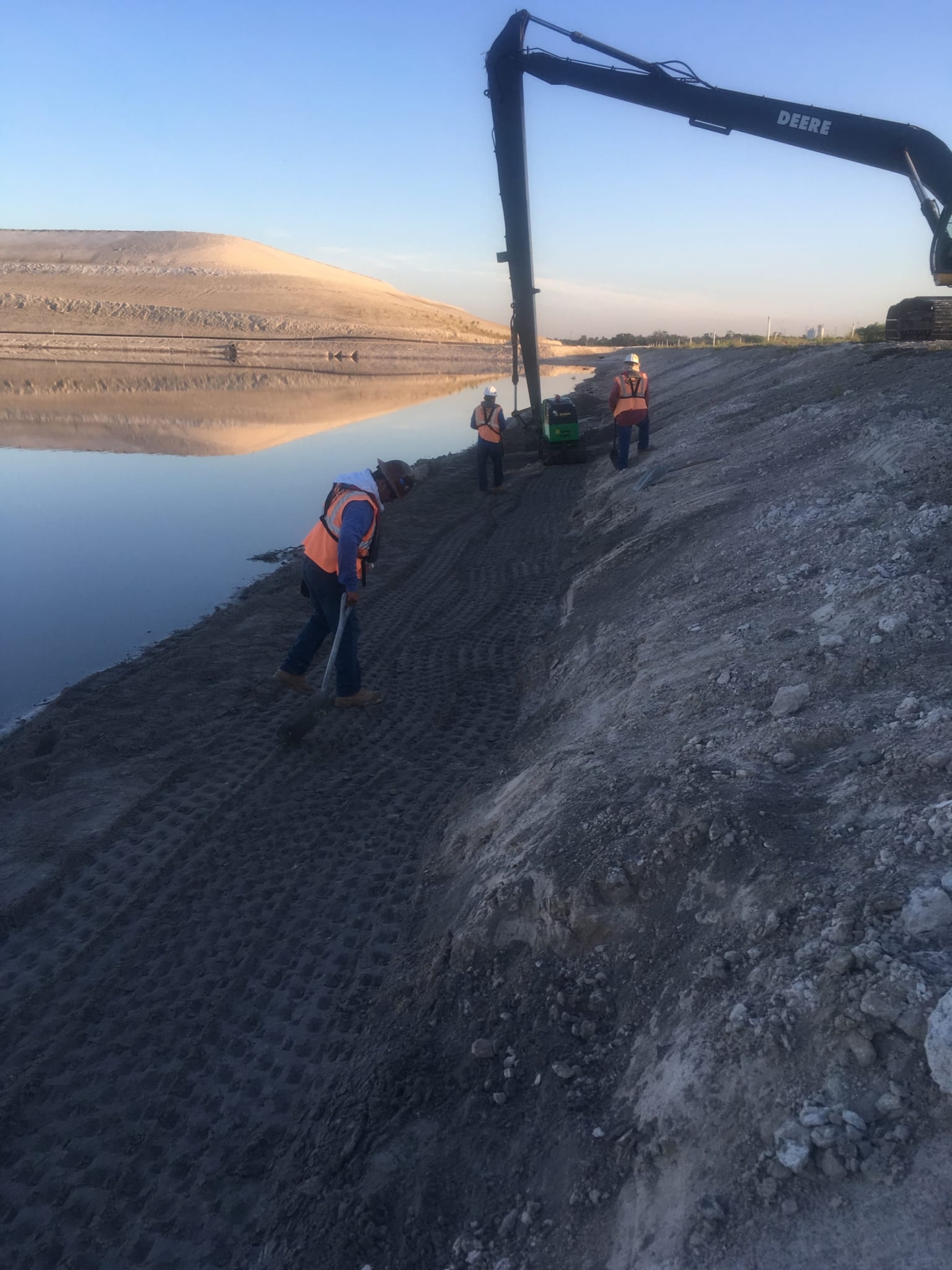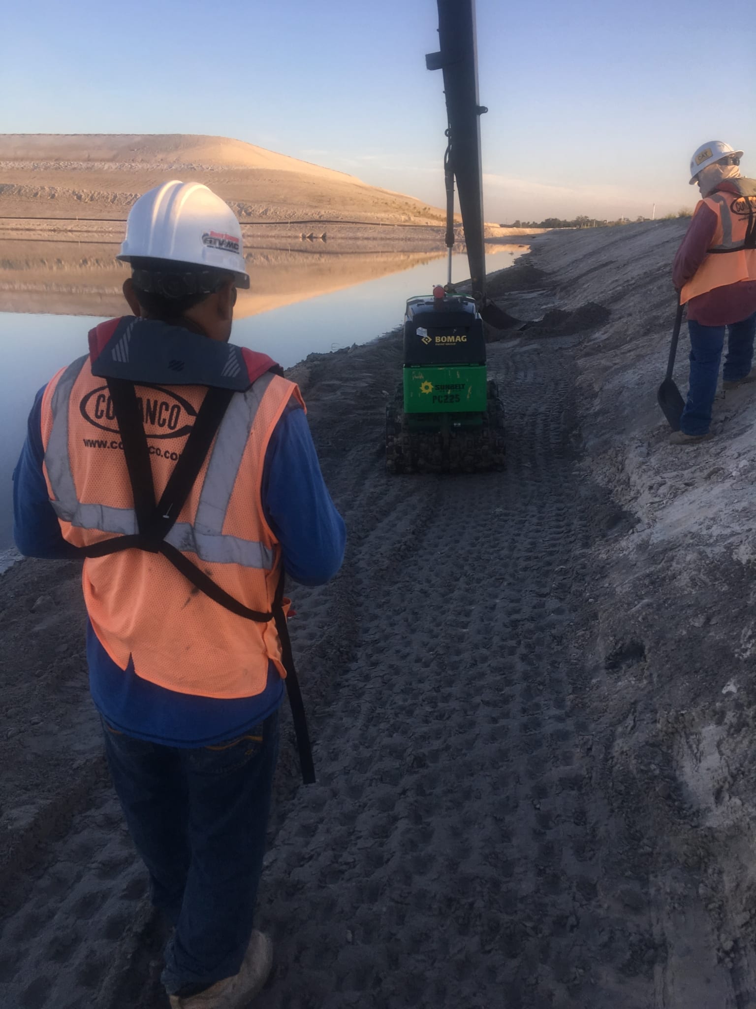 Superintendent Gary Mitchell and his crew have begun an erosion remediation project for a chemical company in Central Florida. COMANCO is tasked with cleaning the erosion area and placing a freshly compacted layer of gypsum on top of the existing liner. With limited access to the work area, COMANCO is utilizing a remote controlled roller to meet compaction requirements. Geocomposite will then be set in place with another layer of gypsum on top to help prevent future erosion issues. The crew will strive to complete the project with no incidents and on schedule.