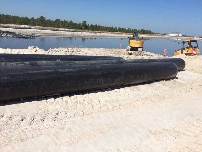 COMANCO has made significant progress on a cooling pond earthwork project at a chemical plant in Central Florida. Currently, COMANCO has completed construction of a dissipation pad which will be used to reroute discharge pipes. Construction of the dissipation pad involved hauling gyp, grading the slope, emplacing geotextile and riprap, and pouring concrete. The crew has also placed anchors to secure the pipe extensions once welding is complete. The six-man team, under the direction of Superintendent Bill Newman, continues to prepare the pipes for the tie-in.