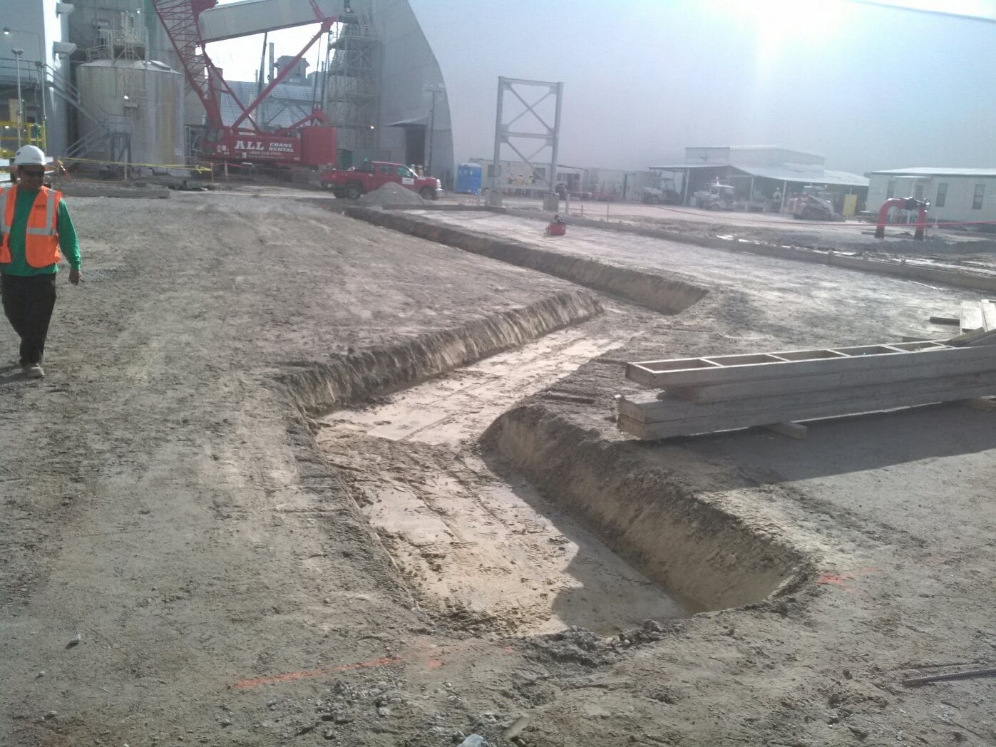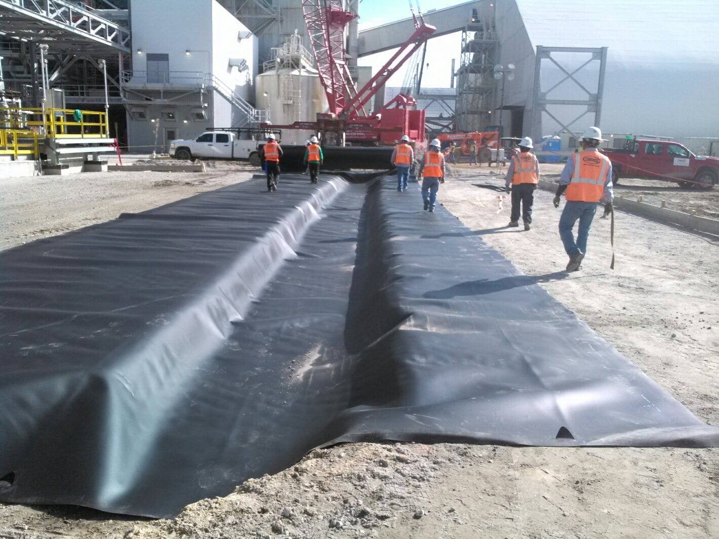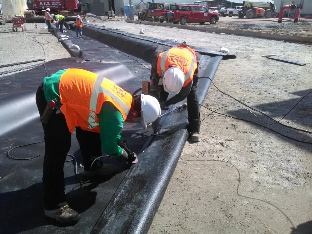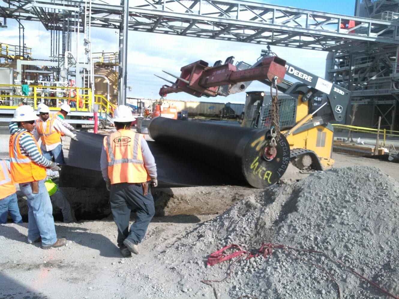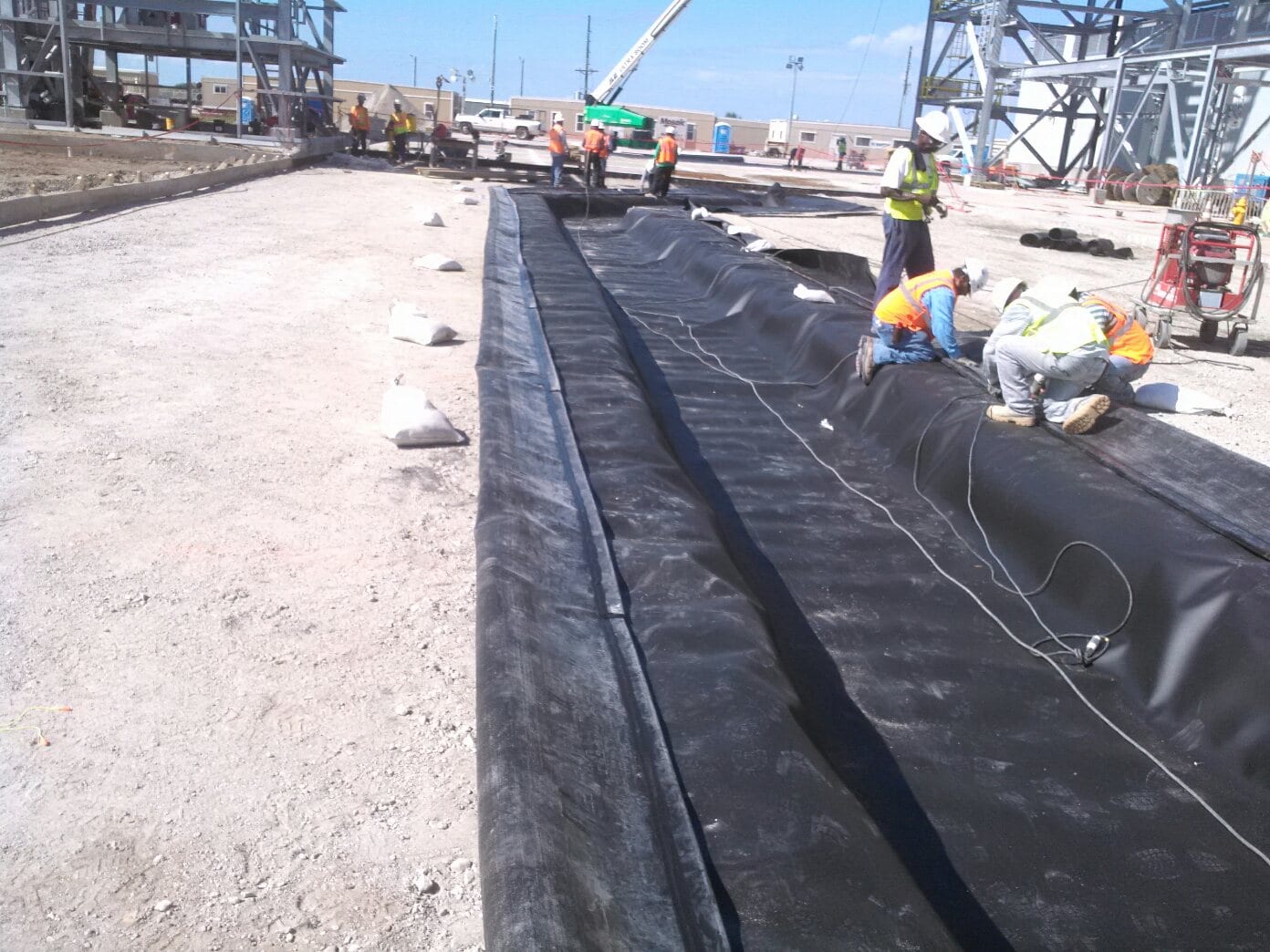 A COMANCO crew is working on lining a trench for a chemical plant expansion project in Central Florida. The crew has been deploying liner in this trench as more of the trench gets prepared, and the liner is being welded to embed channel which will be formed with the concrete walls of the trench. The crew is being led by Leadman Gerardo Ruiz.