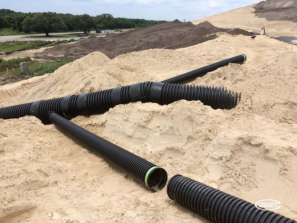 Currently, on the partial closure, 30-inch corrugated HDPE stormwater pipe is being installed just ahead of the sod layer. Once the sod is completed, the team can install the edge of liner markers completing the 2-acre partial closure. Over on the new cell expansion, all 1,800 linear feet of HDPE leachate collection pipe has been installed with the gravel and textile burrito wrap.