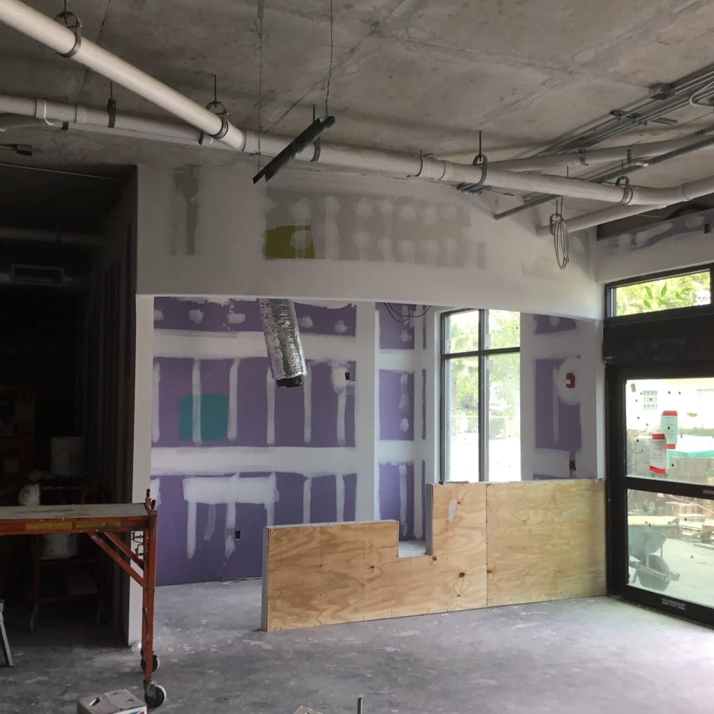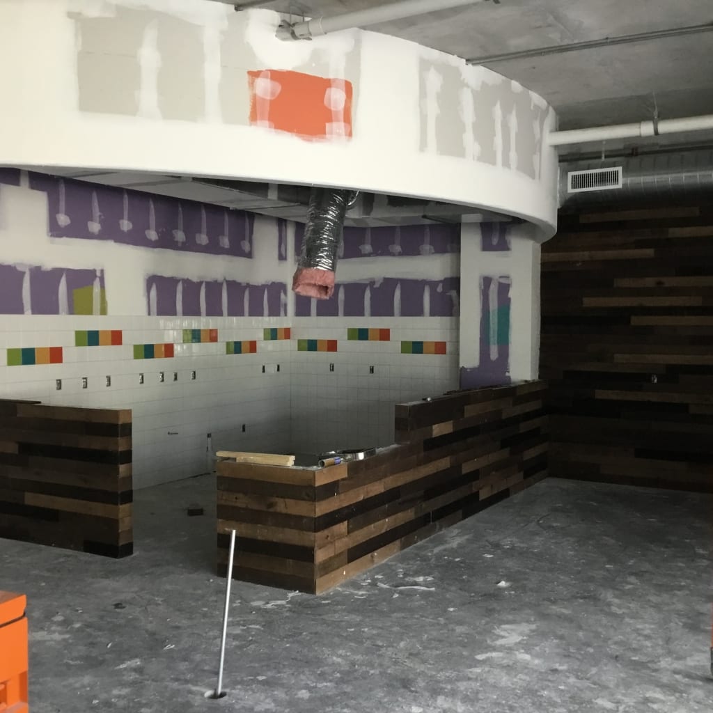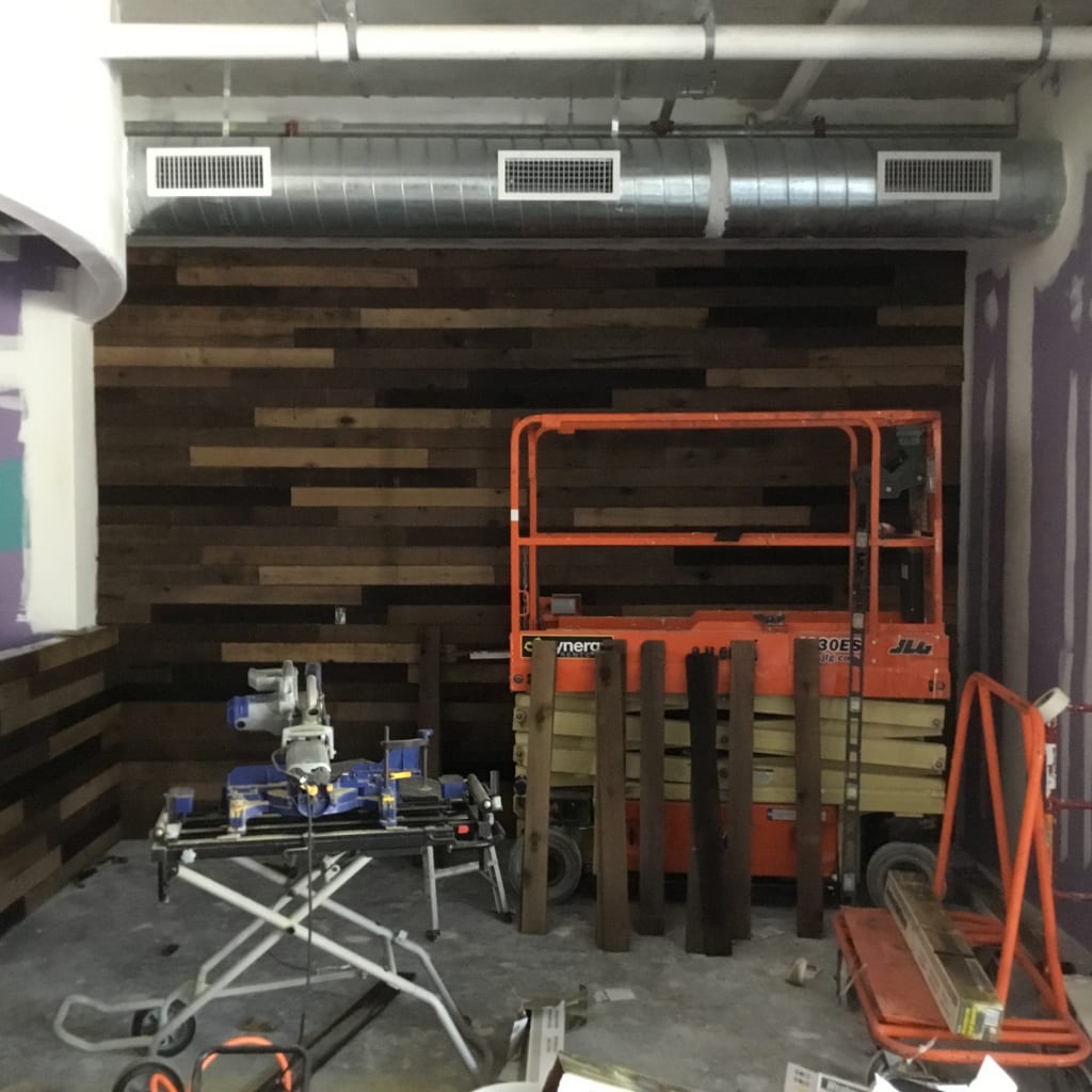 As the exterior of the new Artisan Development rounds into shape, COMANCO has begun tile and reclaimed wood installation in the Juice Bar and customer Dining Area. COMANCO Superintendent Josh Philhower is coordinating the painting that will begin at the end of the week, leading into the concrete floor polishing/staining. Stay tuned for more updates and Grand Opening Date!