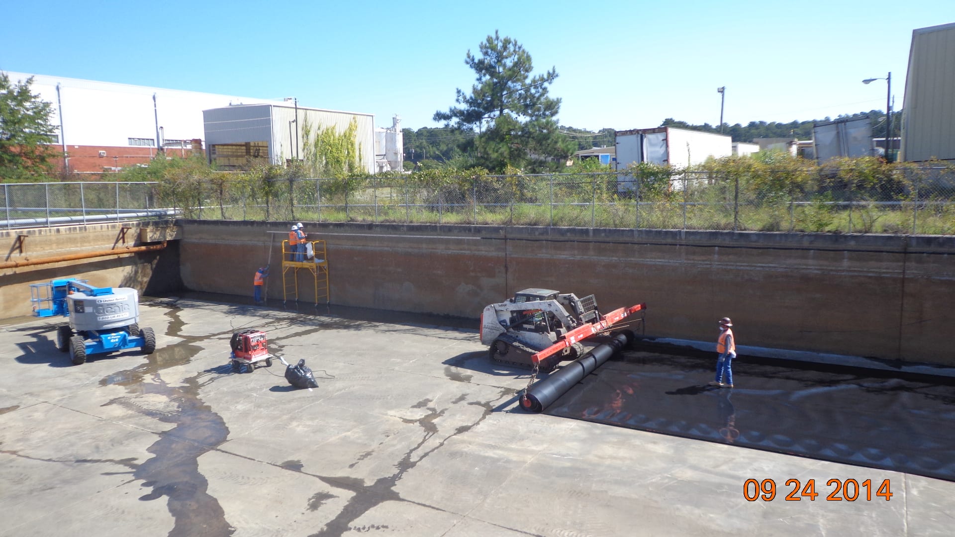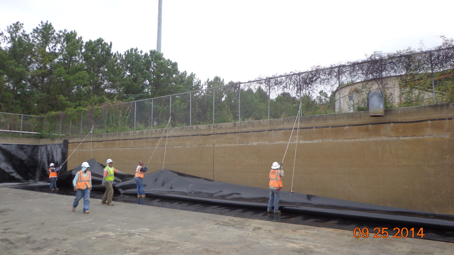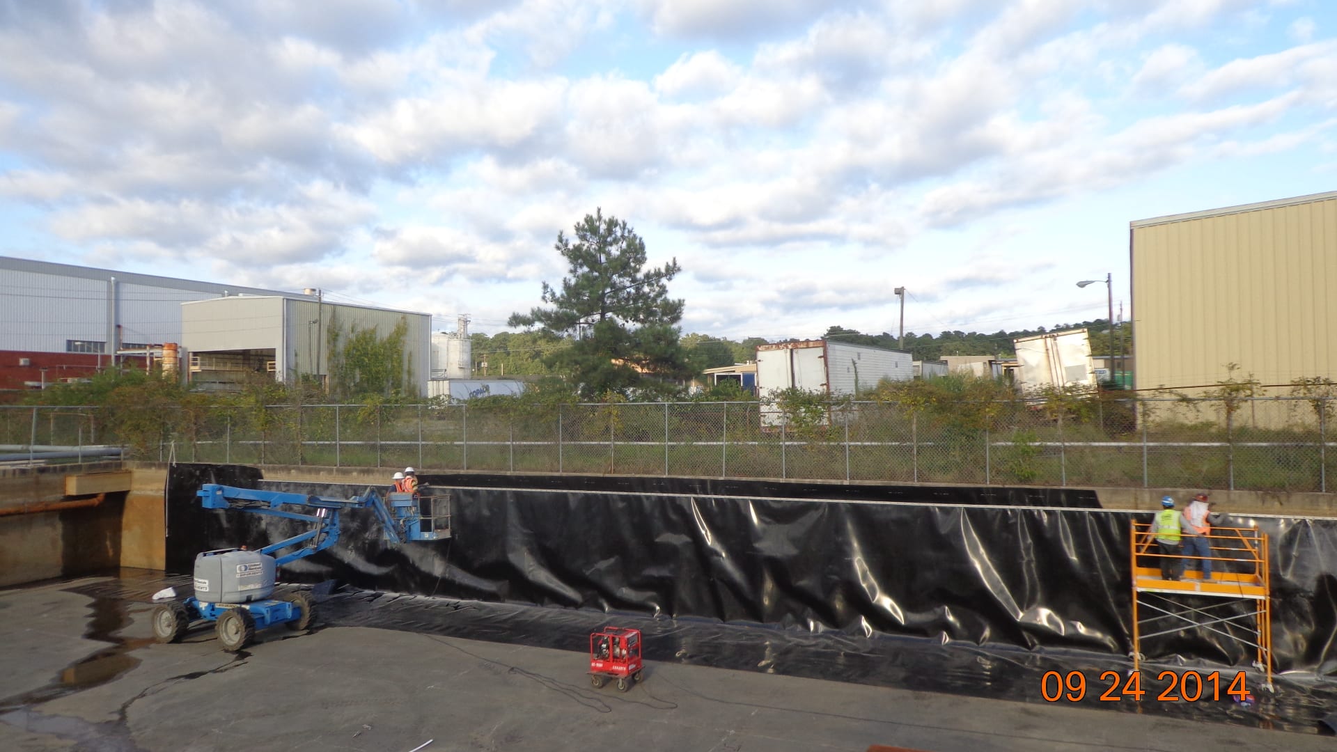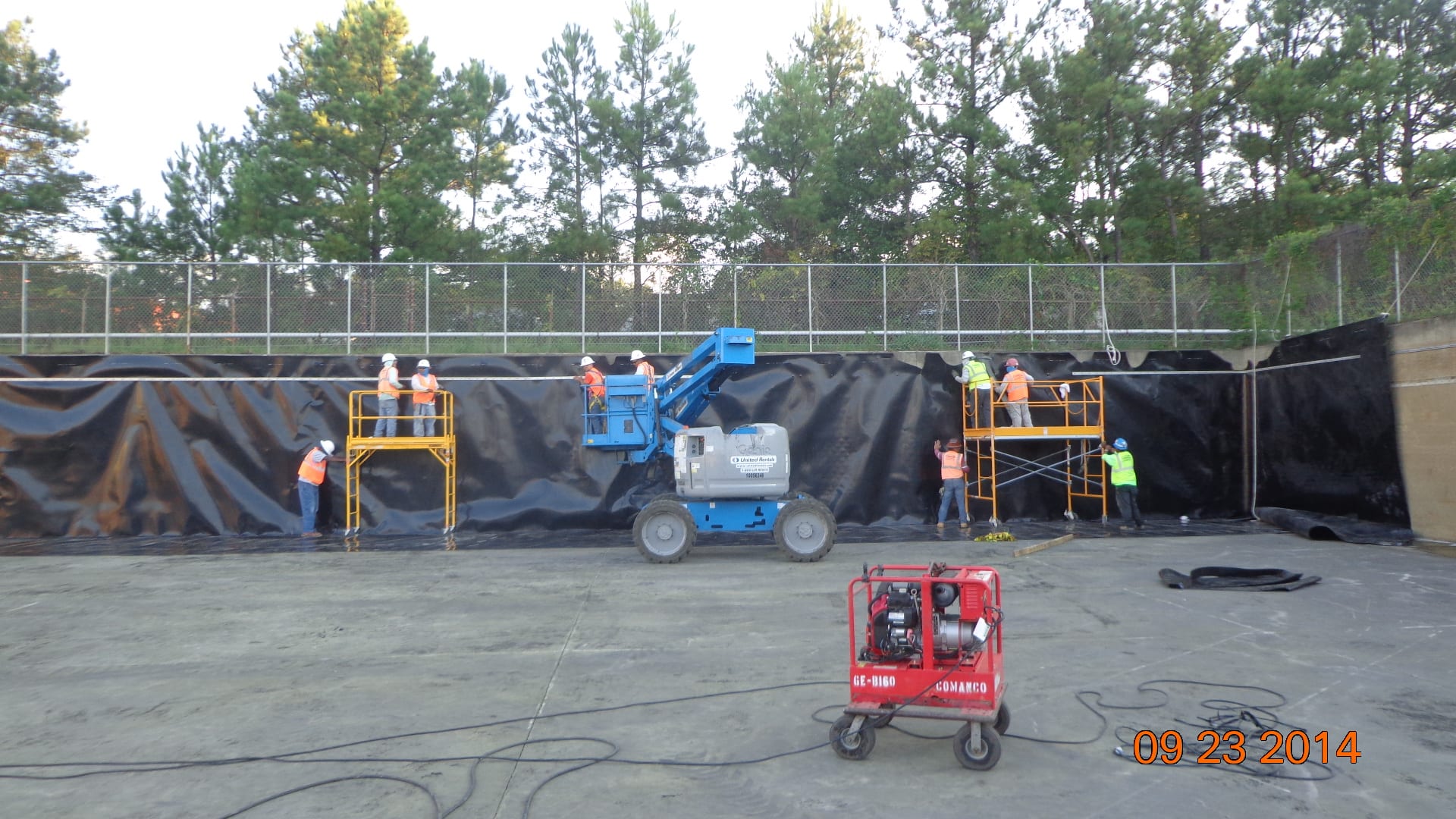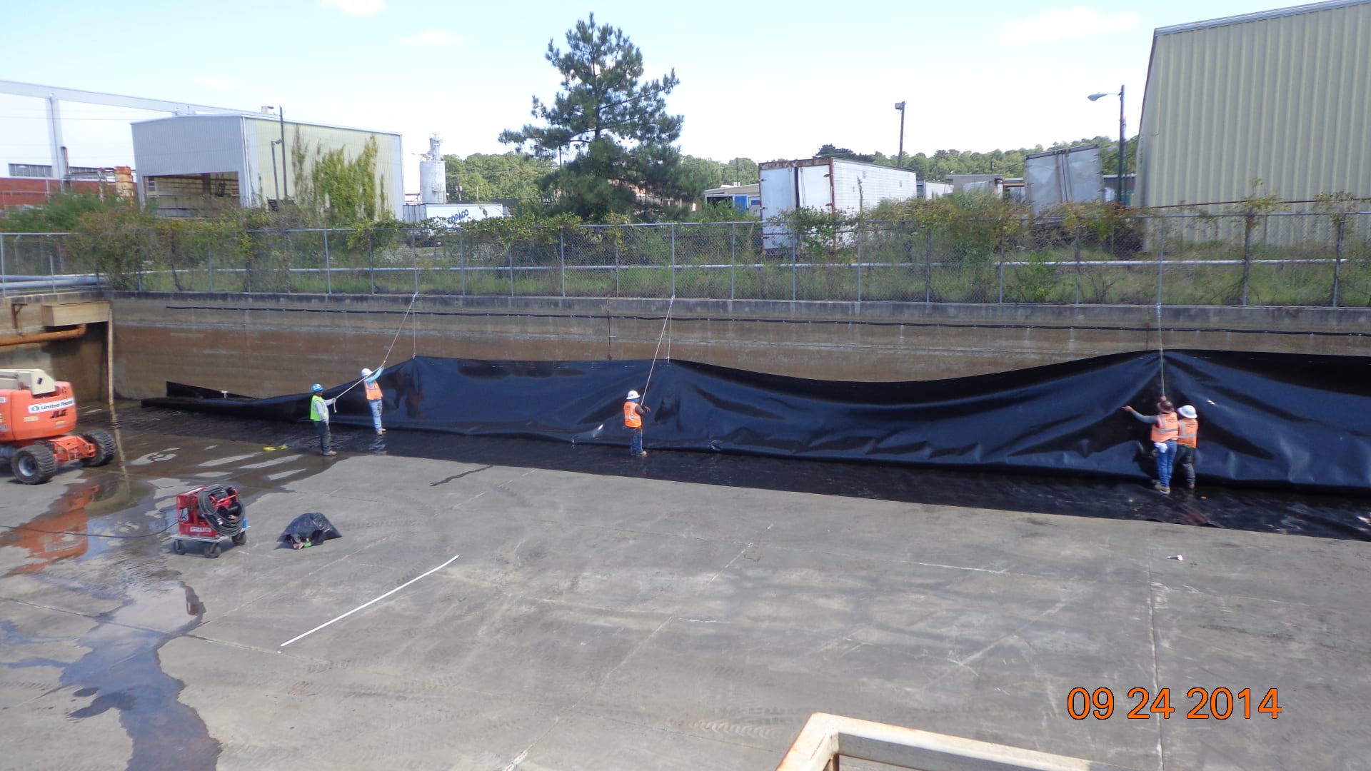 COMANCO Environmental is currently installing a geomembrane liner in a concrete stormwater basin in Columbus, GA. The 60-mil smooth HDPE geomembrane is being installed 10′ high up the walls and will be deployed over the basin’s floor. A mechanical batten bar / neoprene gasket compression attachment secures the geomembrane on the vertical concrete wall while also creating a water-tight application. Approximately 48,000 SF of surface area will be covered with the liner.