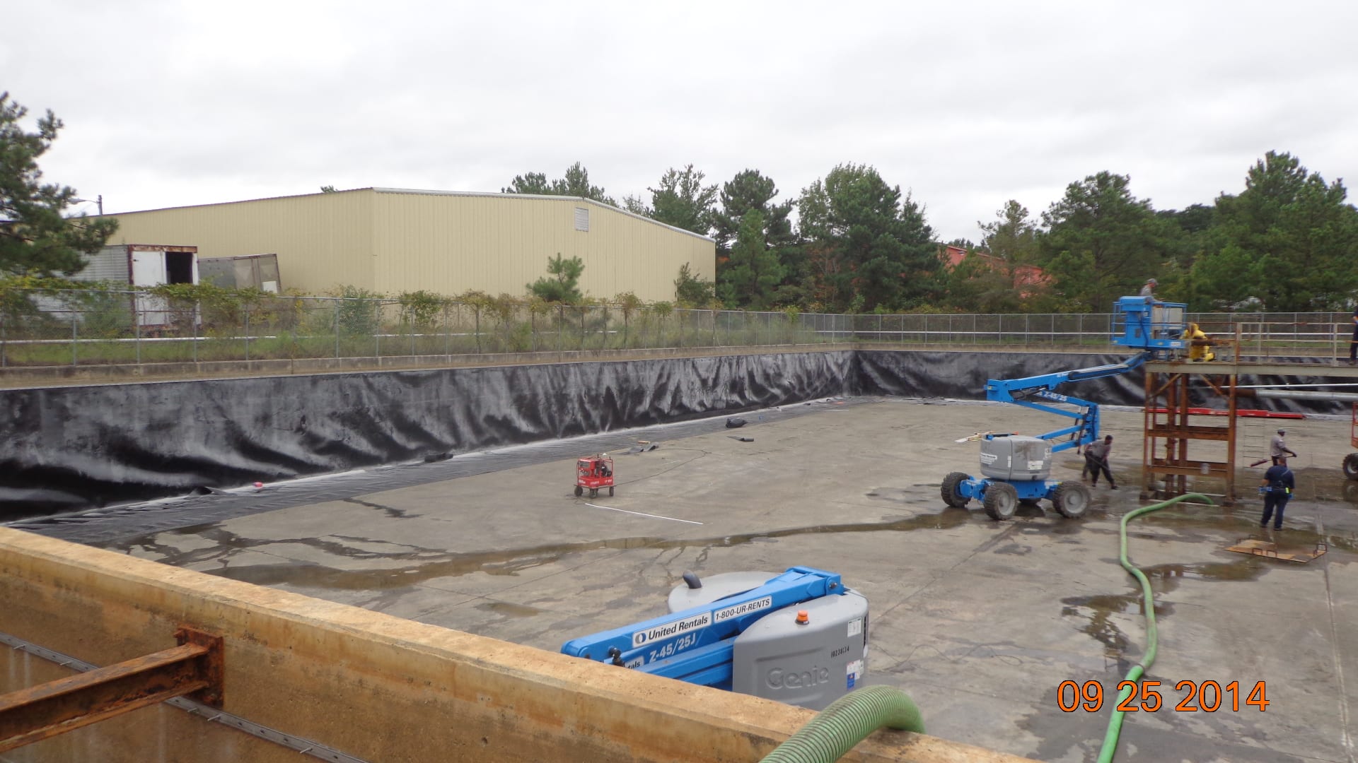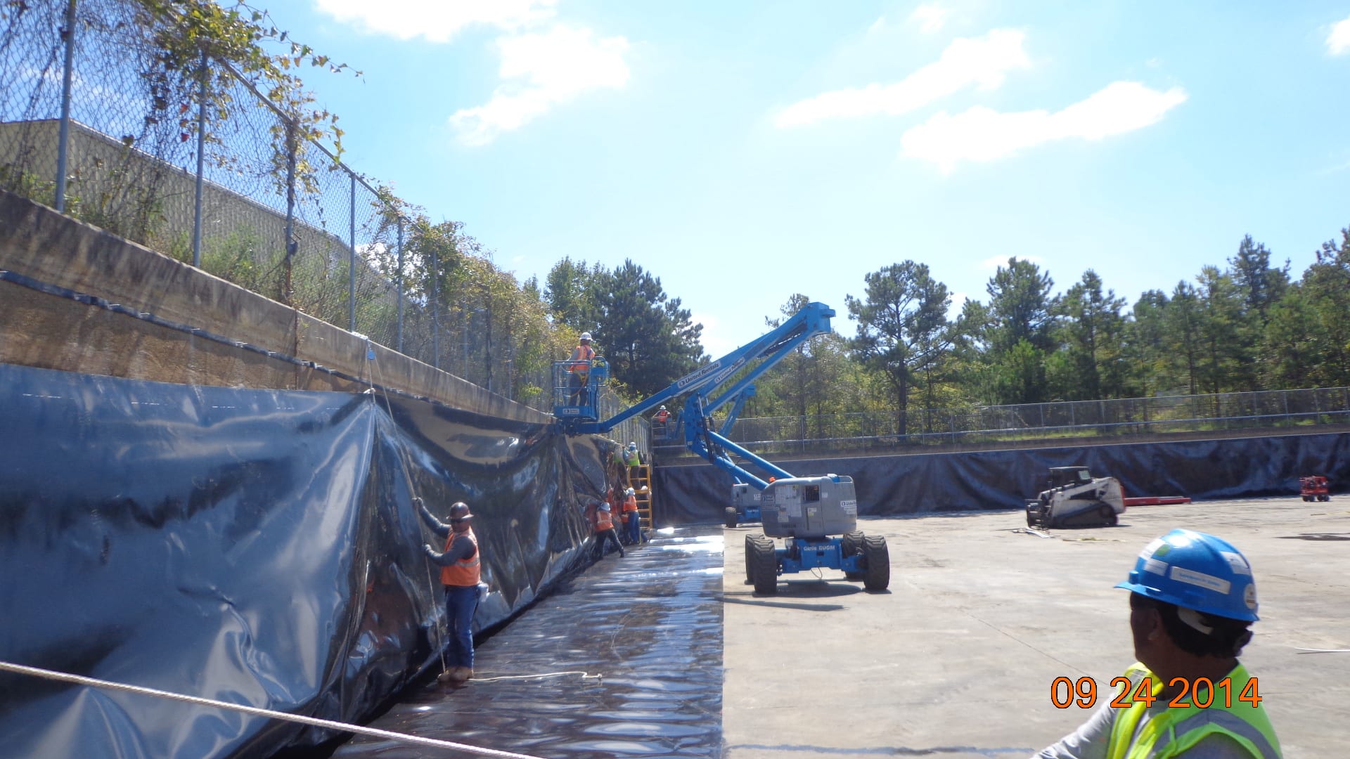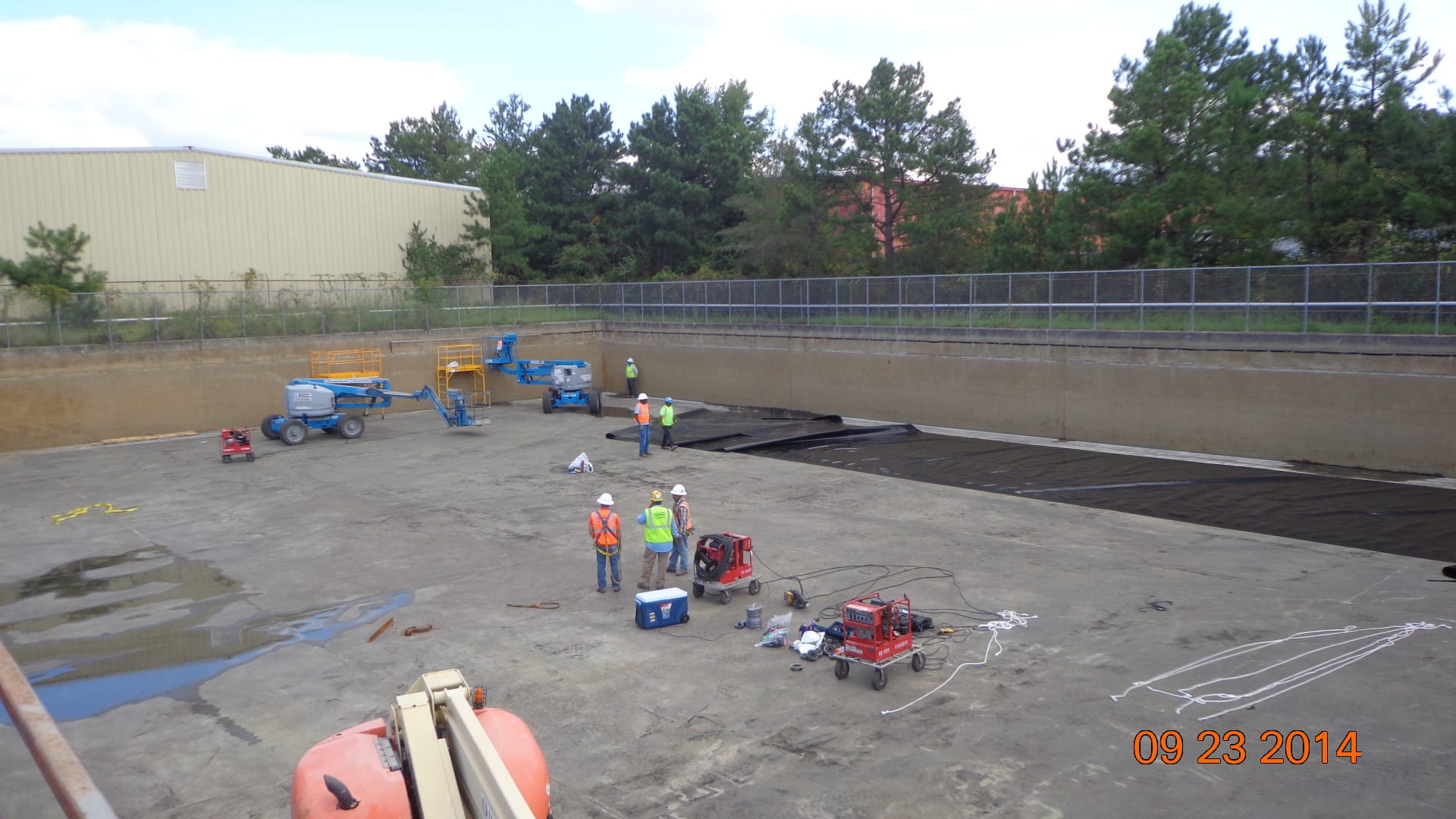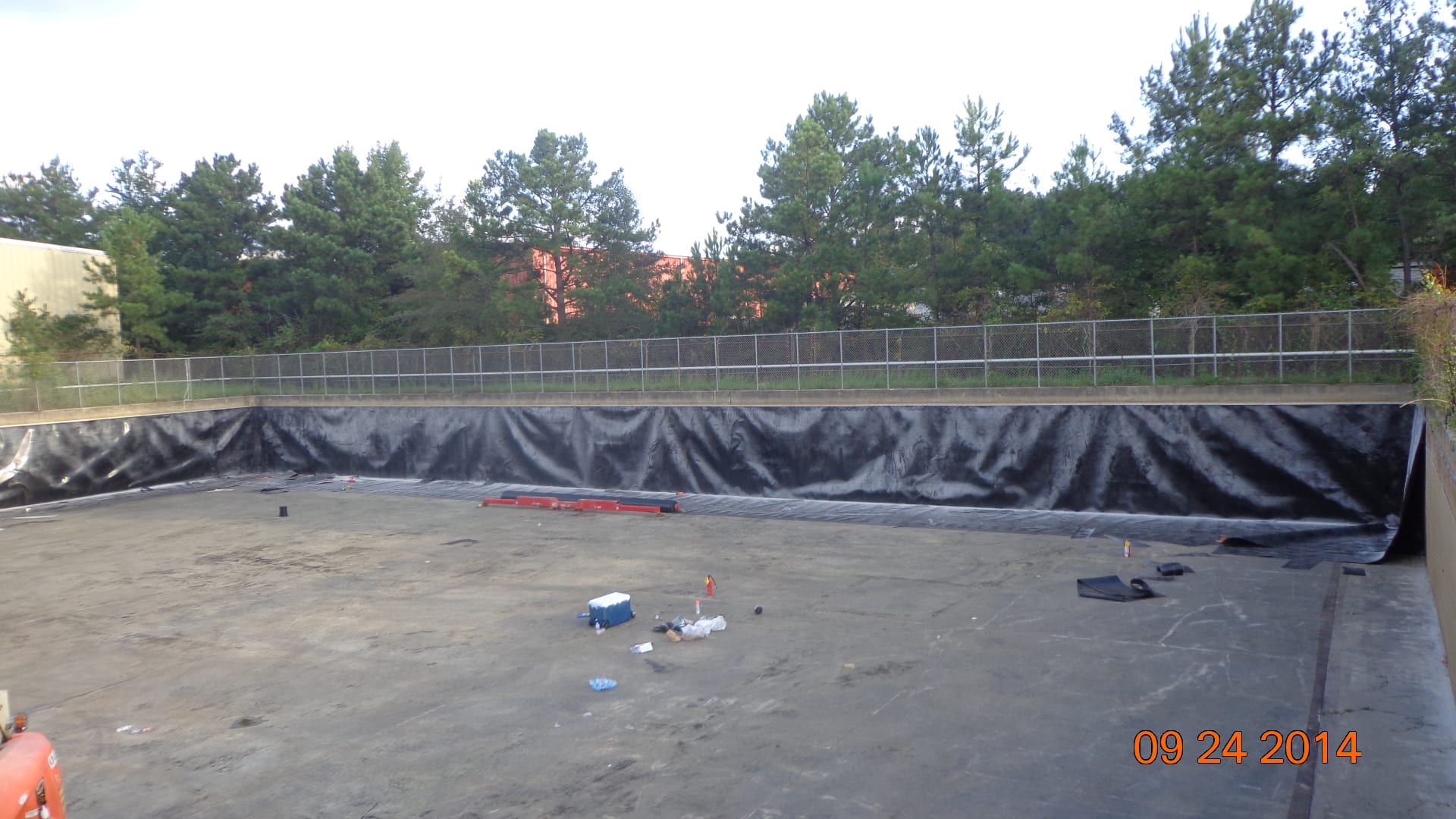COMANCO Environmental is currently installing a geomembrane liner in a concrete stormwater basin in Columbus, GA. The 60-mil smooth HDPE geomembrane is being installed 10′ high up the walls and will be deployed over the basin’s floor. A mechanical batten bar / neoprene gasket compression attachment secures the geomembrane on the vertical concrete wall while also creating a water-tight application. Approximately 48,000 SF of surface area will be covered with the liner.