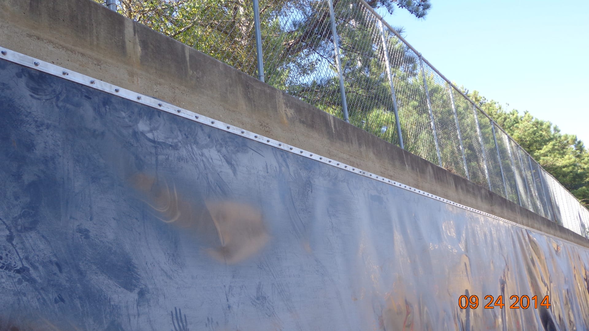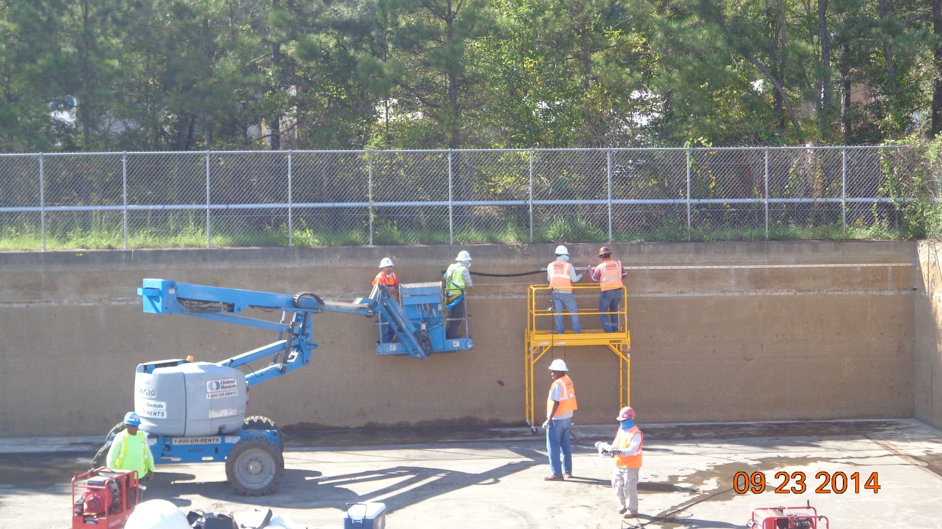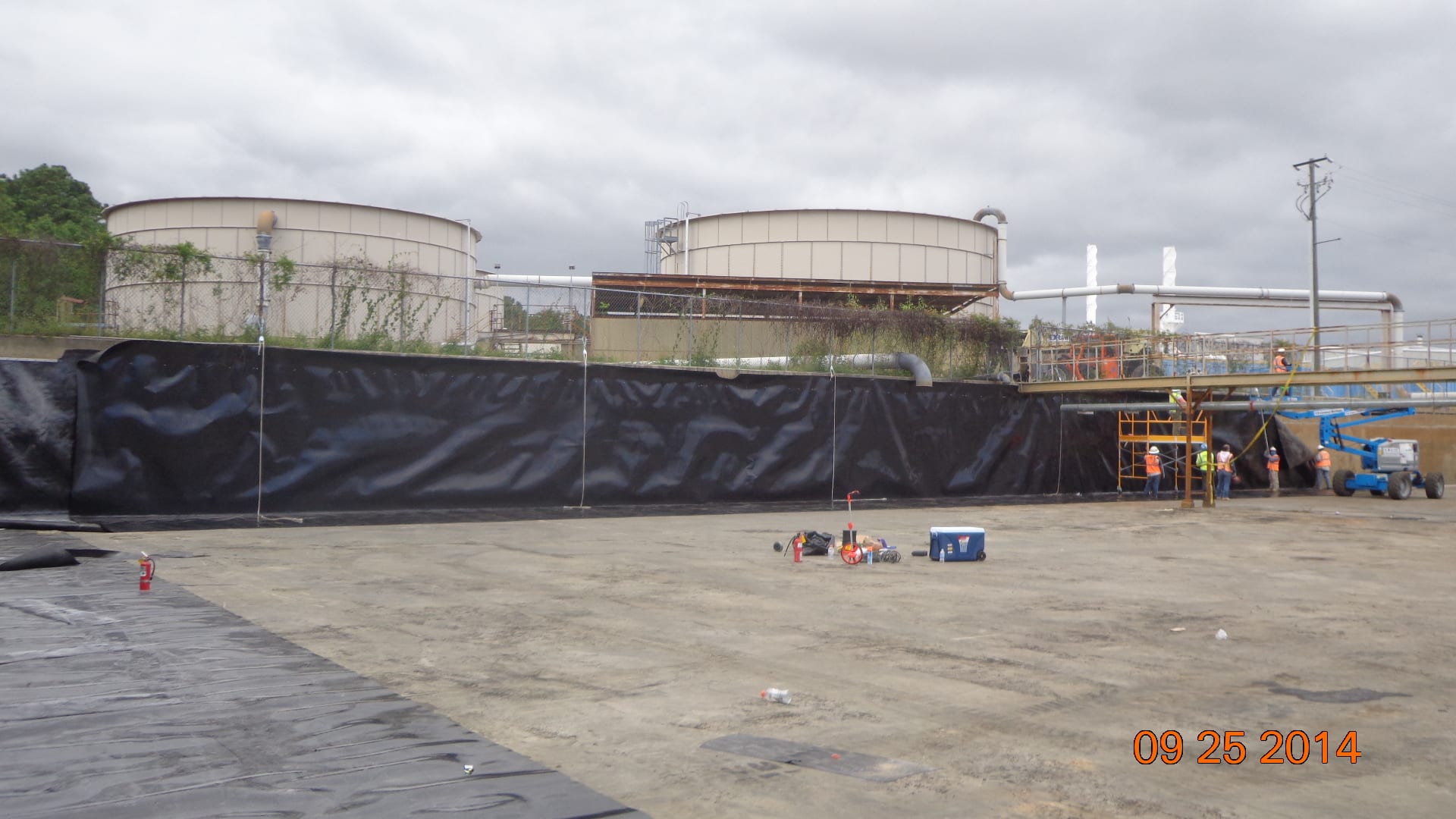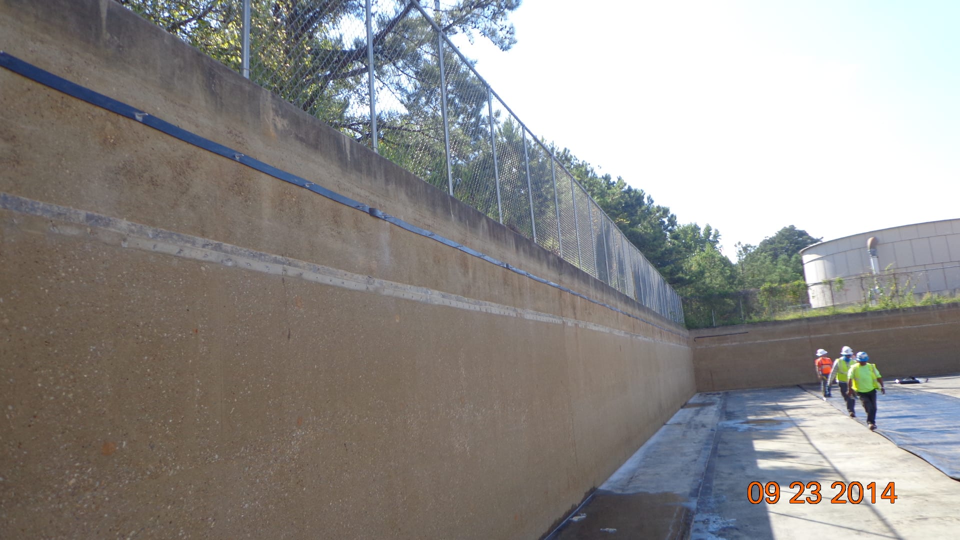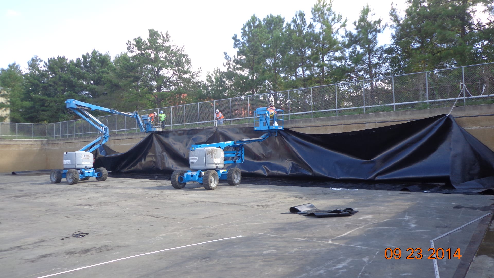 COMANCO Environmental is currently installing a geomembrane liner in a concrete stormwater basin in Columbus, GA. The 60-mil smooth HDPE geomembrane is being installed 10′ high up the walls and will be deployed over the basin’s floor. A mechanical batten bar / neoprene gasket compression attachment secures the geomembrane on the vertical concrete wall while also creating a water-tight application. Approximately 48,000 SF of surface area will be covered with the liner.