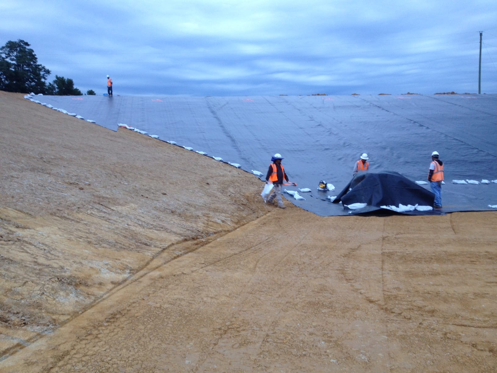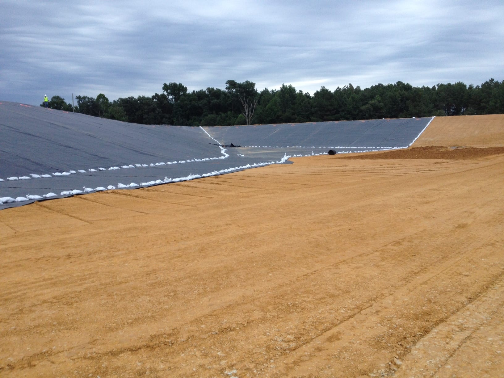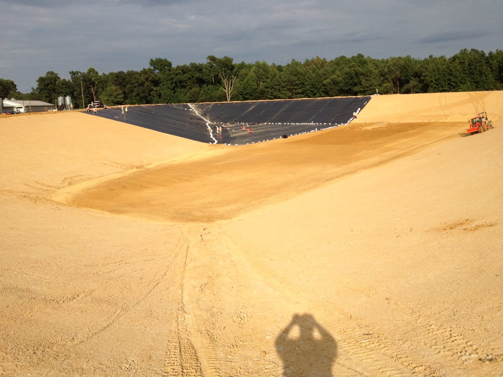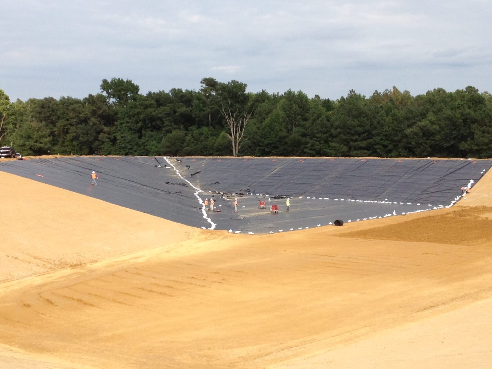 On Monday, August 5th COMANCO Environmental Corporation started a pond liner project in Waverly, Virginia. Murphy Brown LLC hired CEC to supply and install approximately 150,000 SF of 40-mil smooth HDPE geomembrane in a pond at one of their pig farms. Additional items included in the scope of work are textured walkways for access, strips of geocomposite and gas vent flaps for venting. Superintendent, Juan Gomez and his 12-man crew are on schedule to complete this job by the end of the week. Below are some early progress photos of the work.