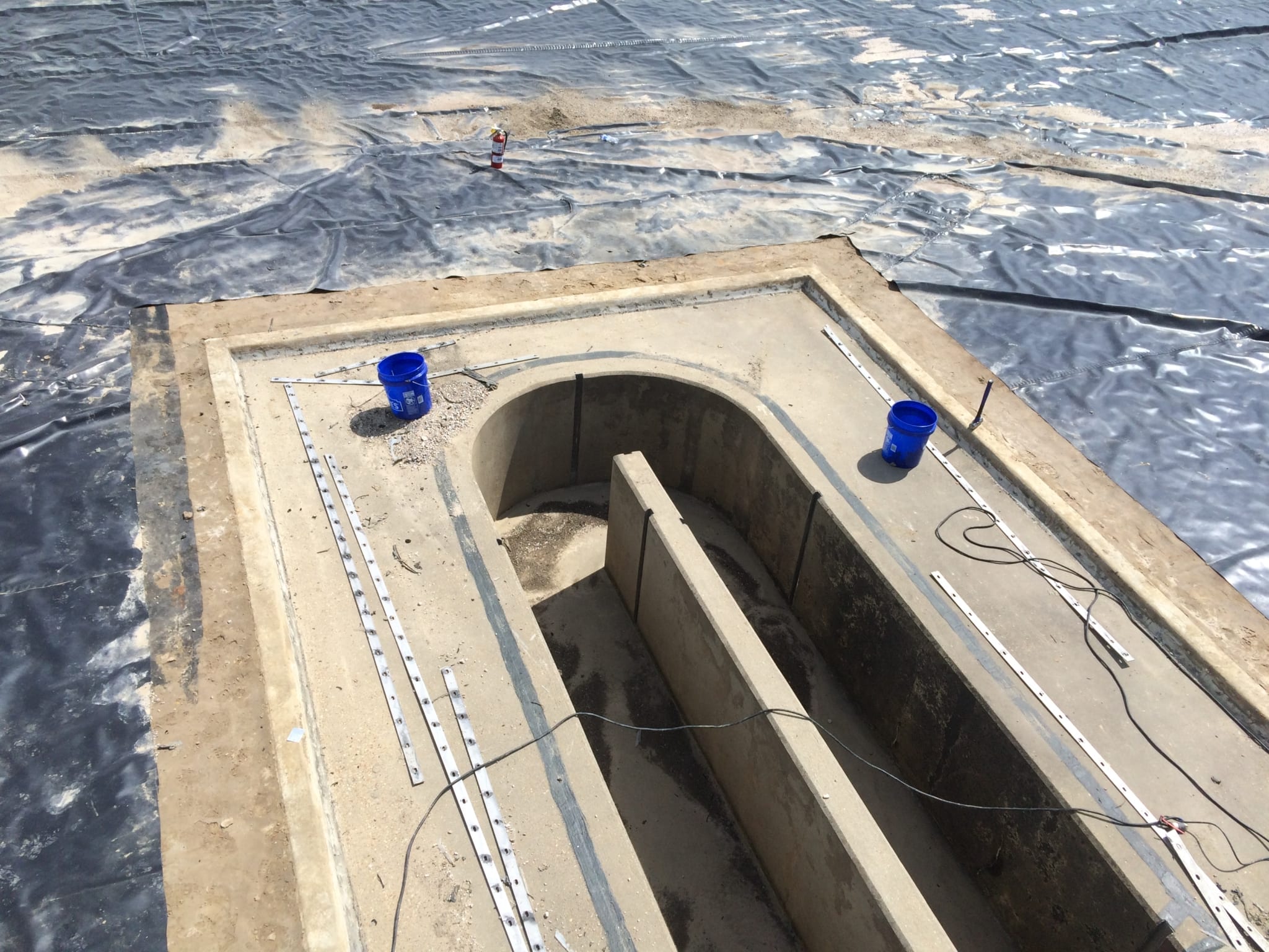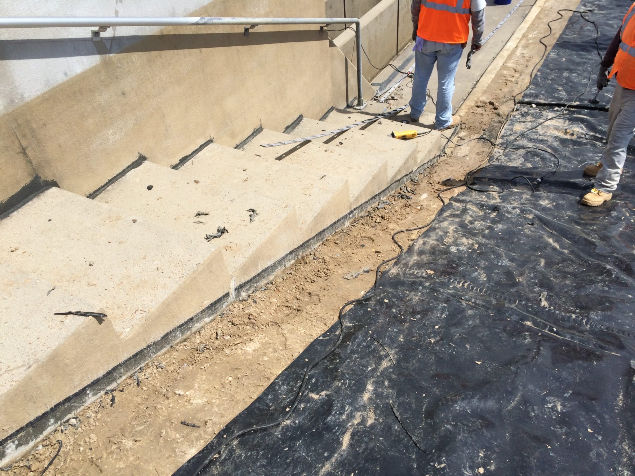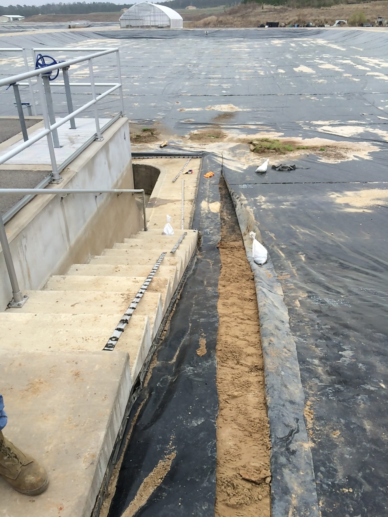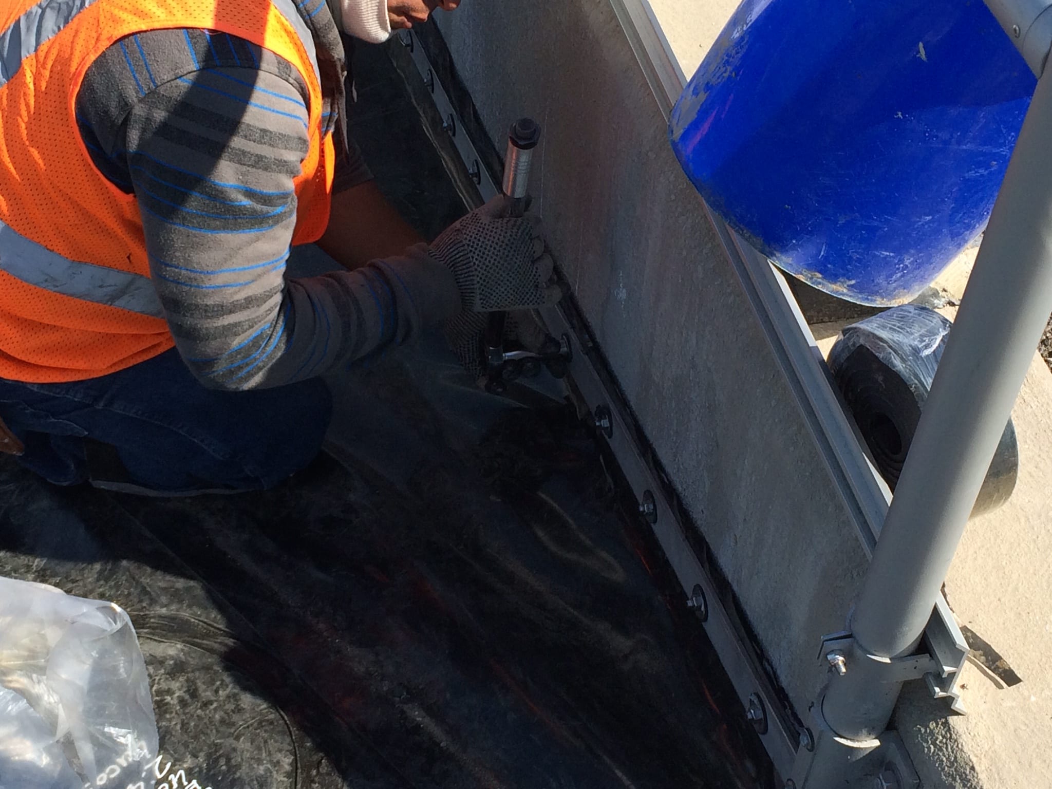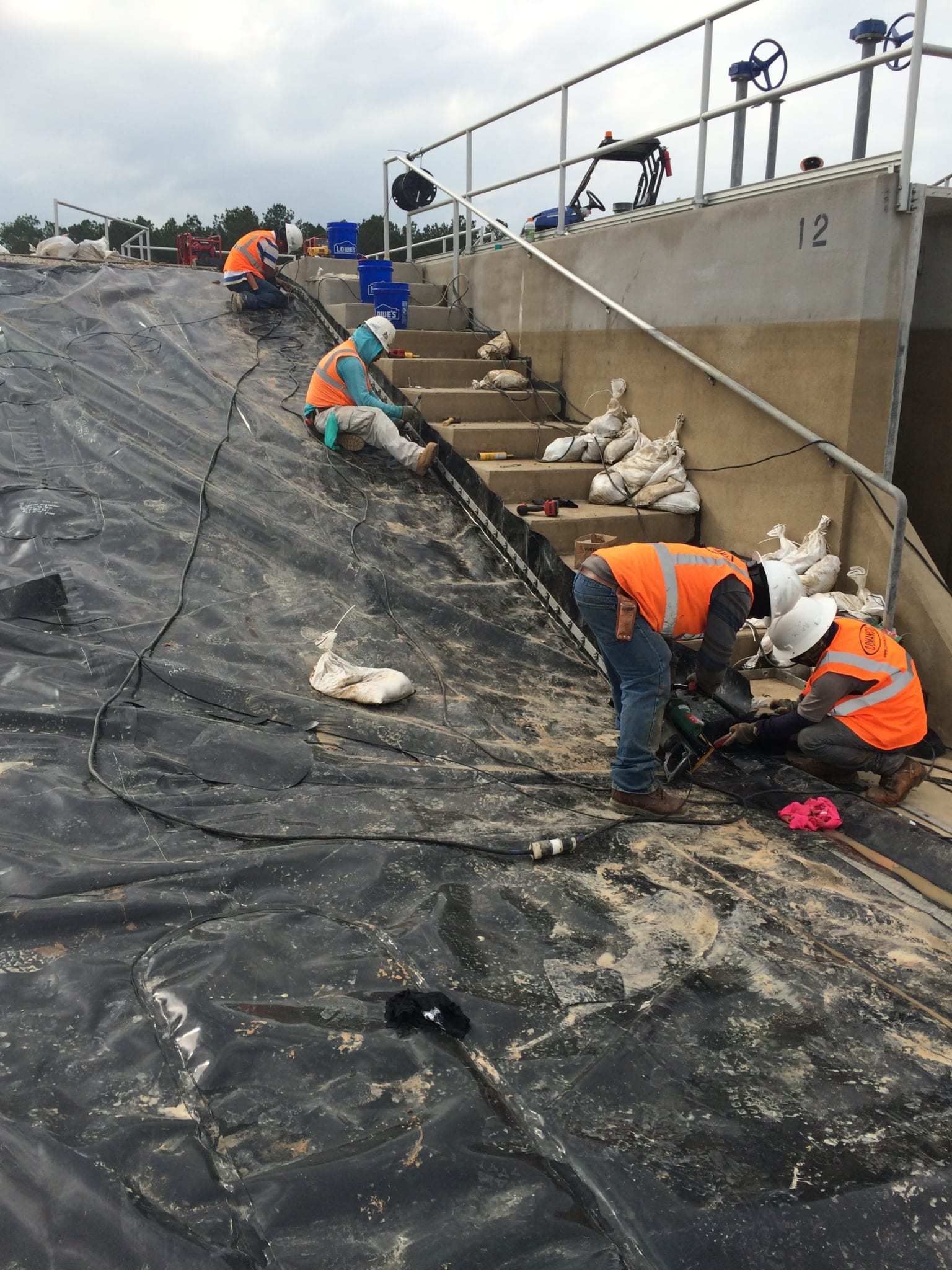 COMANCO has begun repair work at a fish hatchery in Texas. COMANCO is removing the existing batten bar, cutting off the existing bolts, and then shifting the location of the bar before reinstalling it using all new wedge anchors. The repair process also includes installing a new 40mil LLDPE prefabricated liner apron around each kettle, and welding it to the existing pond liner. COMANCO will spend the next several weeks repairing 58 kettles, which includes 7500 linear feet of batten bar. The crew led by Superintendent Jorge Barrantes is focused on quality, ensuring every bolt installed properly, and is torqued the same amount using a torque wrench.