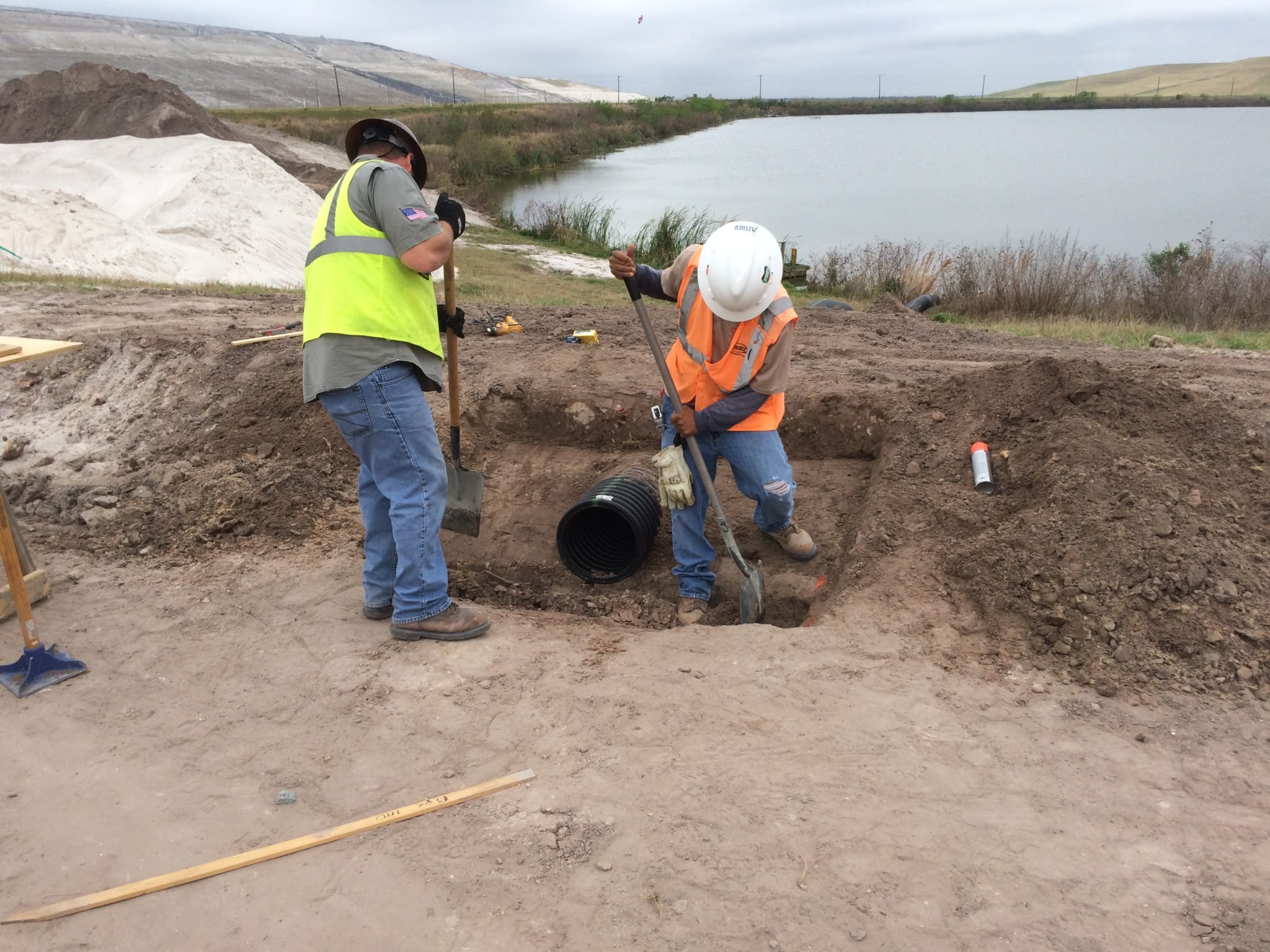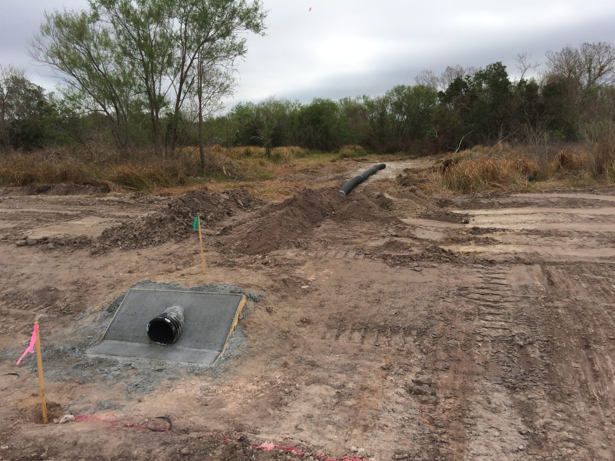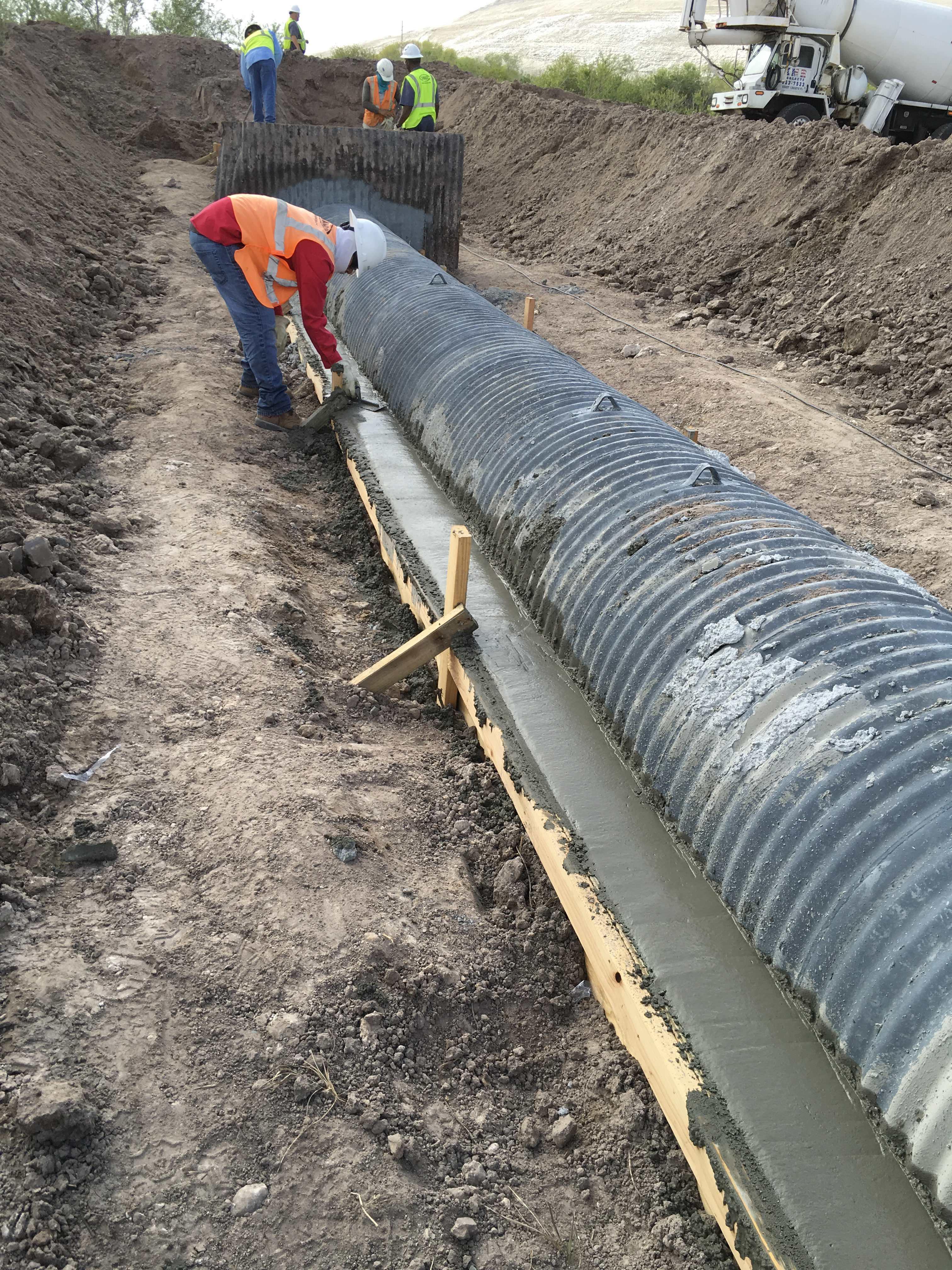The crew successfully completed the two-day concrete saddle pour which will provide stability for an existing 36-inch CMP spillway. In total, 35 cubic yards of concrete were cast in place spanning over 80 feet in length. The crew took extra precautions in terms of safety by constructing safety berms, which eliminated any potential hazards for the concrete trucks traveling in and out of the project. COMANCO was able to complete two of the 12-inch HDPE corrugated outlet drains this week as well, leaving only one more to install in the coming days. EXCELLENT WORK TEAM!