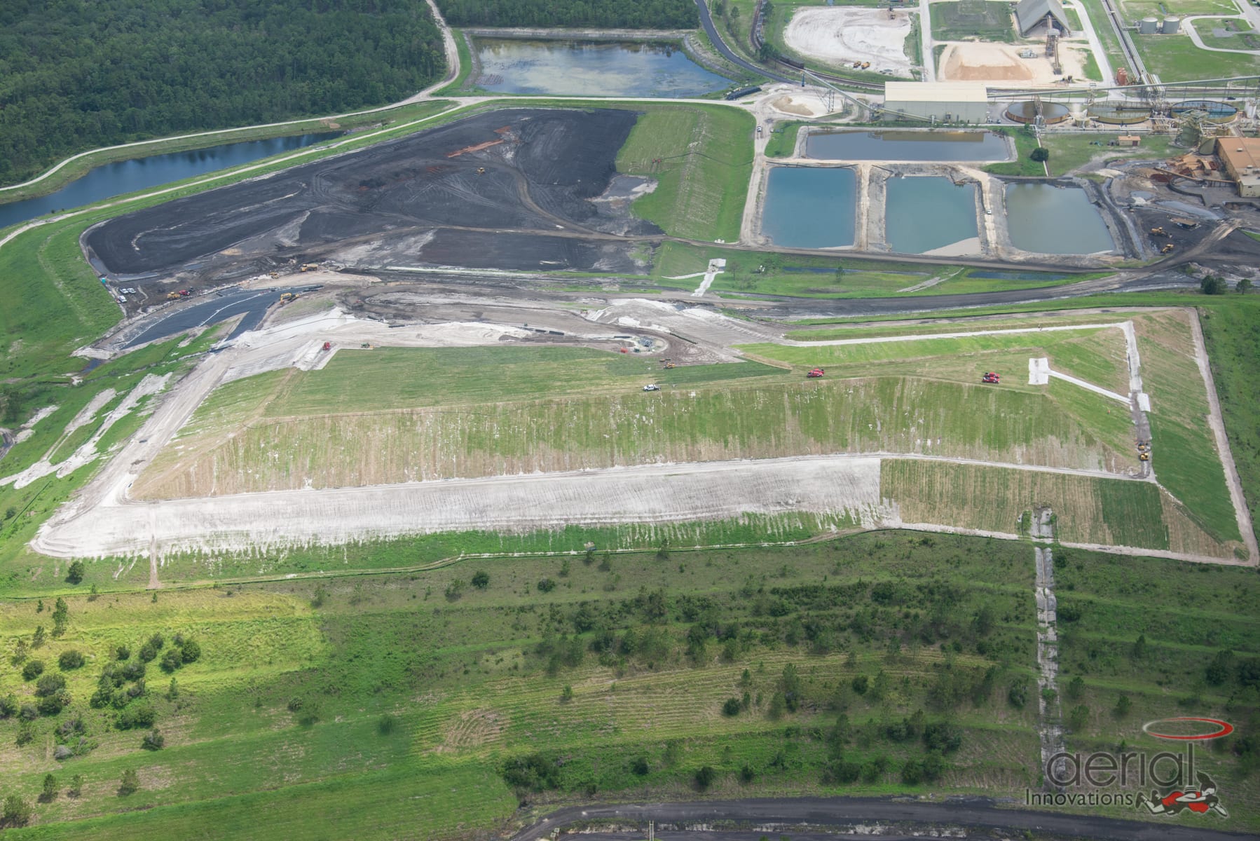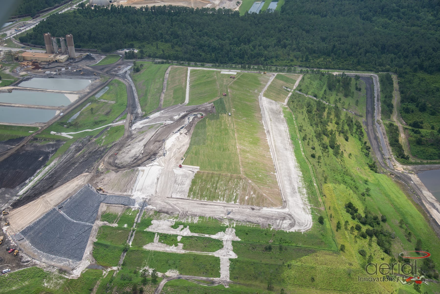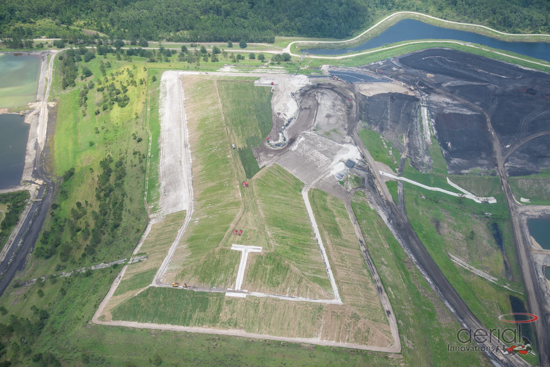 COMANCO Environmental has begun installation of sod on the 2nd phase of construction for a Coal Ash LF expansion project in Palatka, Florida. Despite the 20 plus inches of rain during the past 30 days, the crew is still making great progress. The aerial photos display the progress made by great leadership by Superintendent, Nathan Wilfong, and Foreman, Pedro Beltran along with teamwork.