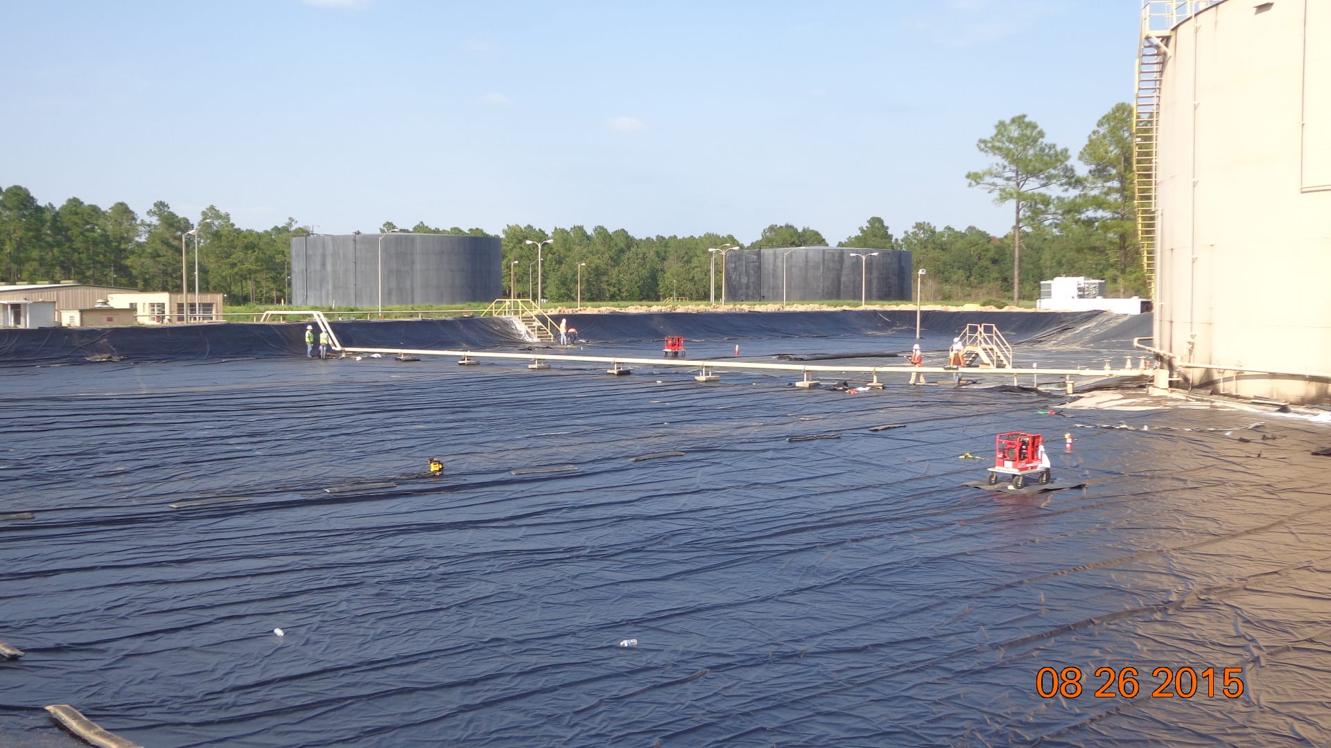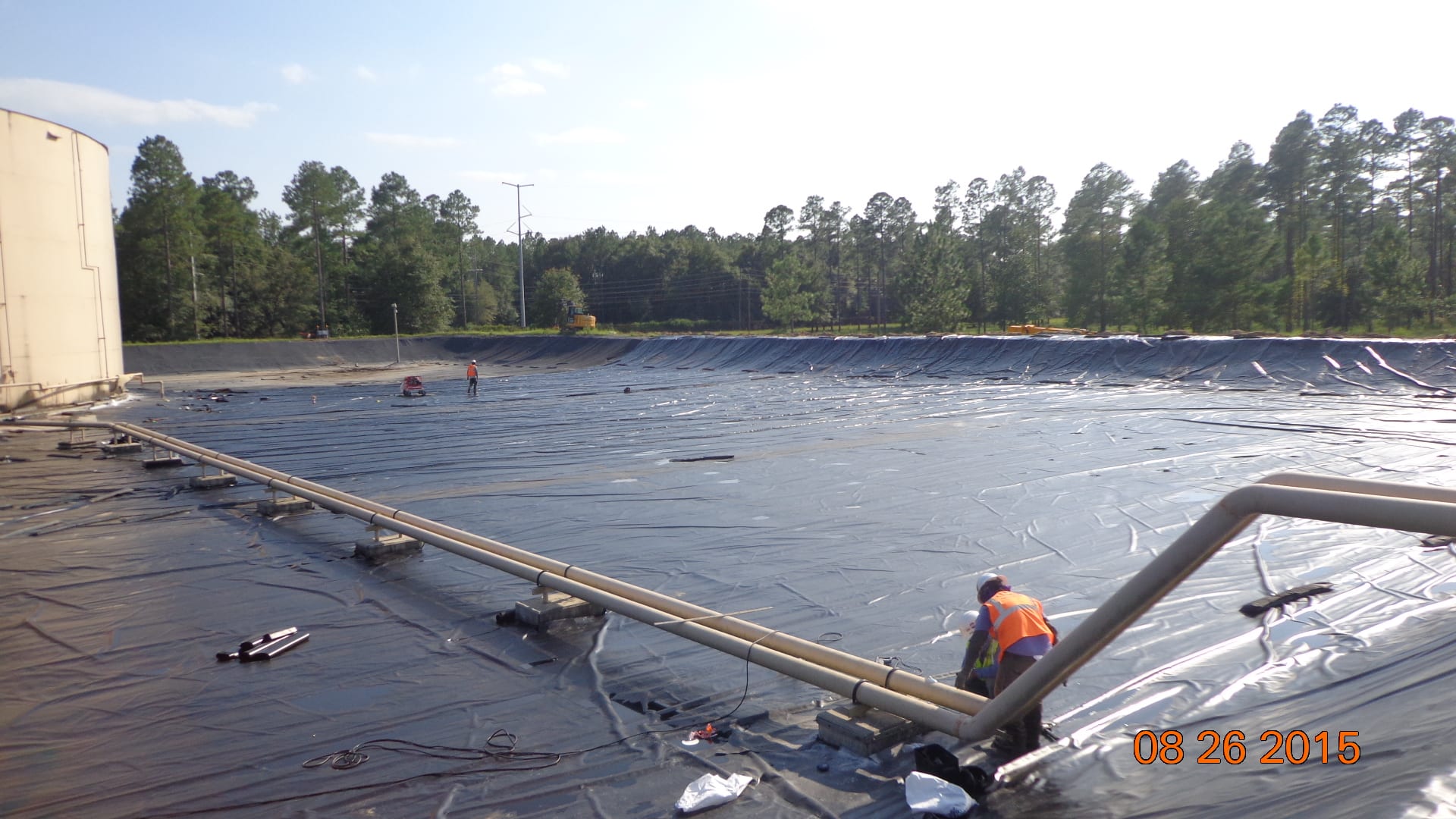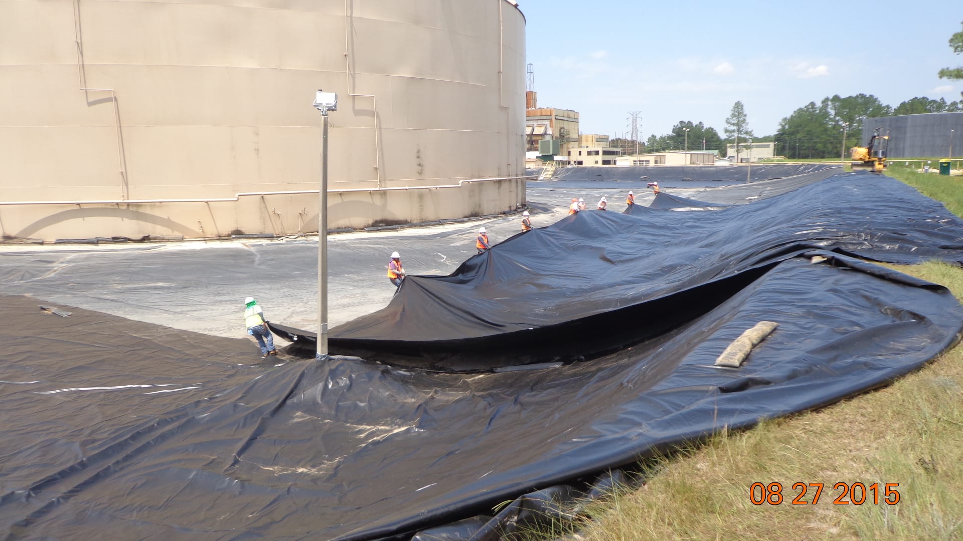 Earlier this week, COMANCO Environmental started construction on a tank containment liner replacement project in Live Oak, FL. A new 30-mil XR-5 liner is being installed over the existing liner. It is being secured in an anchor trench around the perimeter berm and mechanically fastened to the concrete structures inside with batten bar. Supervisor, Max Macedo, and his 9-man crew are keeping safety first and working diligently to complete this project.