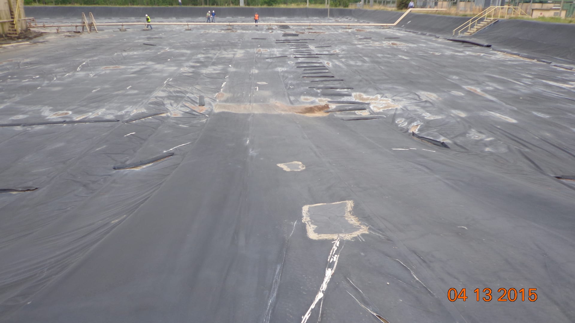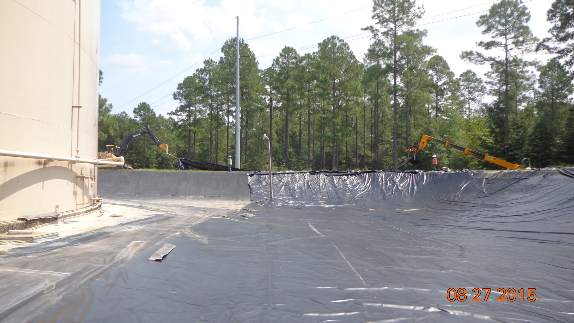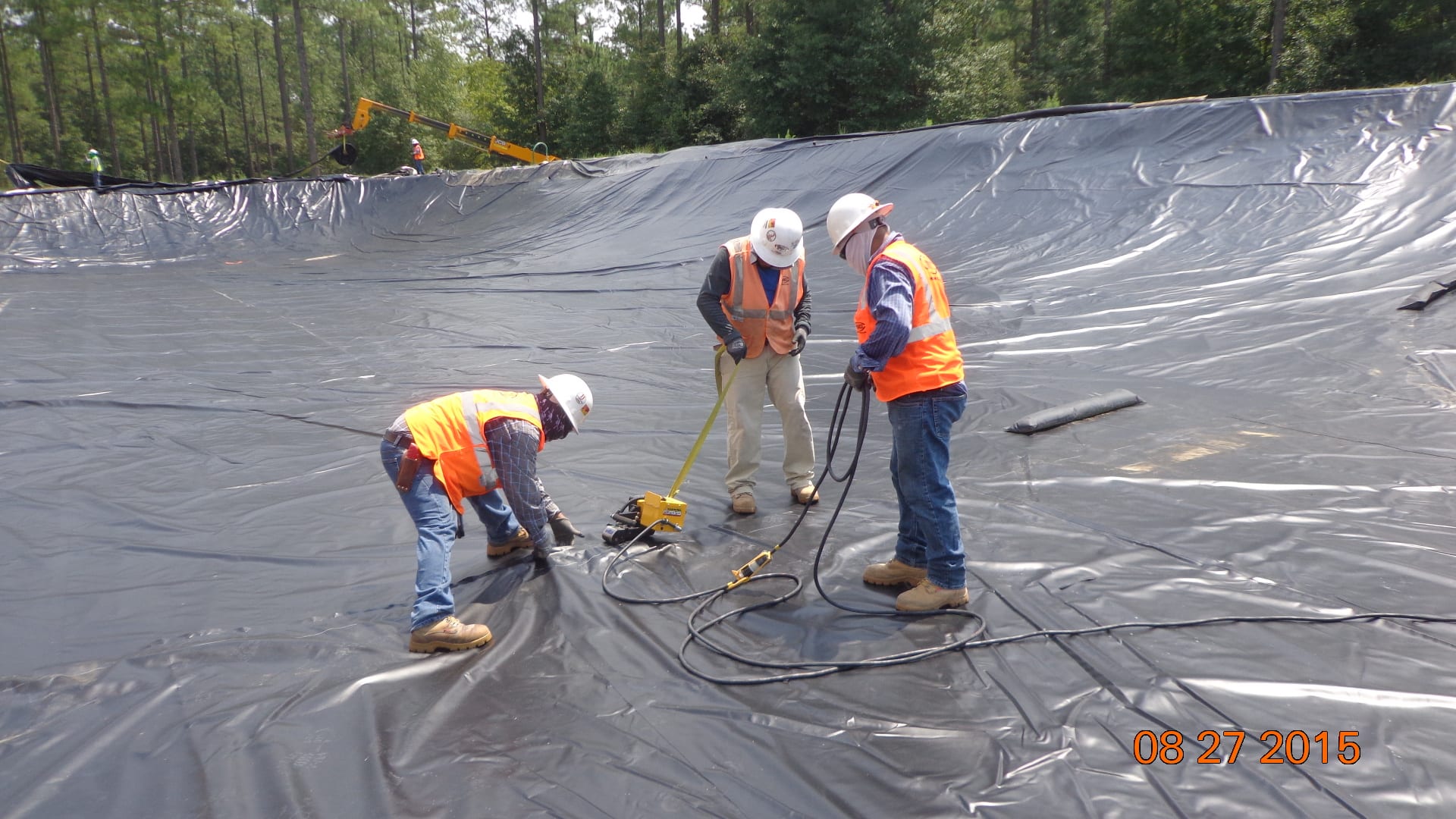 Earlier this week, COMANCO Environmental started construction on a tank containment liner replacement project in Live Oak, FL. A new 30-mil XR-5 liner is being installed over the existing liner. It is being secured in an anchor trench around the perimeter berm and mechanically fastened to the concrete structures inside with batten bar. Supervisor, Max Macedo, and his 9-man crew are keeping safety first and working diligently to complete this project.