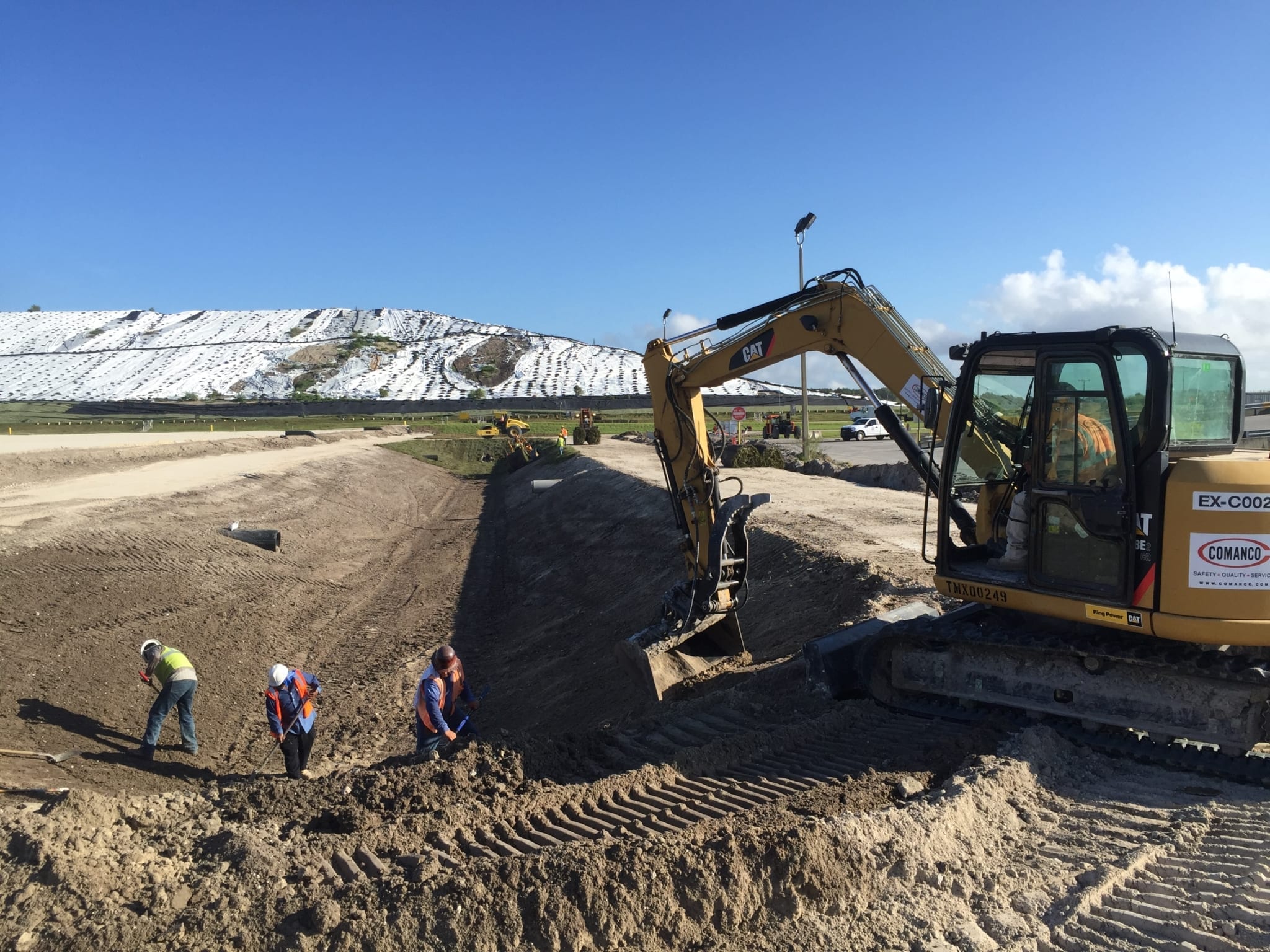 COMANCO is currently making its final push towards completion on the landfill expansion in Polk County. COMANCO has completed the 30-acre landfill cell which included a five layer geosynthetic system, leachate collection pipe and gravel, protective sand cover, and rain tarp installation. We are currently working on the remaining site work which includes the installation of new asphalt access roads, concrete pump station pads, and the surrounding stormwater system of the new cell. The crew is hard at work, striving to give the customer the best quality product while keeping its focus on safety.