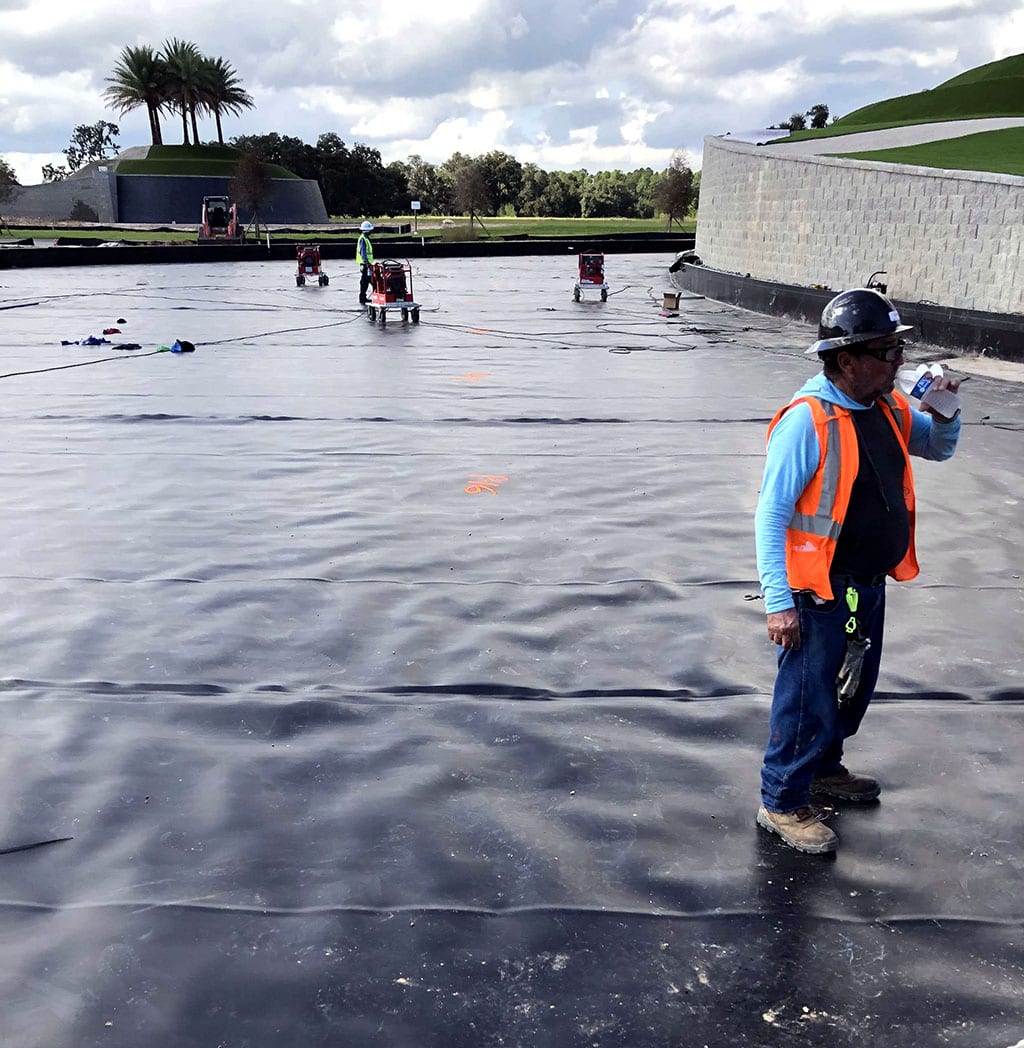 The project consisted of lining two fountains, a two-layer system of geotextile with a layer of 60 mil HDPE geomembrane on top, totaling just over 46,000 SF of each material. Additionally, COMANCO supplied the HDPE embed channel material that was embedded into the concrete to allow the liner to be welded directly to the walls of the fountain without mechanical attachment, for a more aesthetically pleasing look.