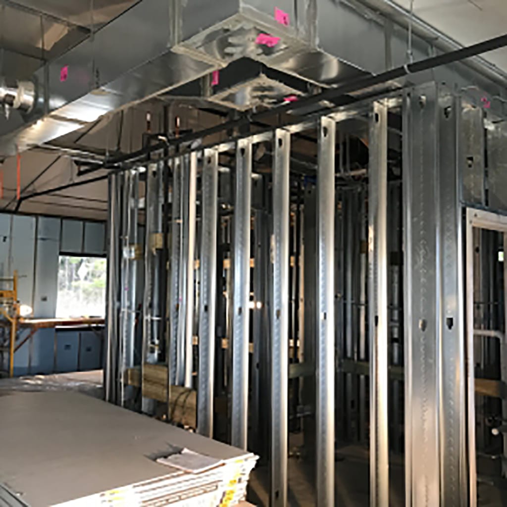 The building is in the process of getting a Sto Corp stucco system – which is more powerful than conventional stucco – and a Stolit Lotusan finish. The finish coat a ready-mixed exterior textured finish that mimics the self-cleaning capabilities of the lotus leaf. Replicating the lotus plant’s ability to send raindrops rolling gently off its leaves, Stolit® Lotusan® resists dirt pick up while keeping walls clean and attractive. Meanwhile, the inside of the building is coming together as well. The interior framing and rough-ins have been completed, and drywall work is well underway.