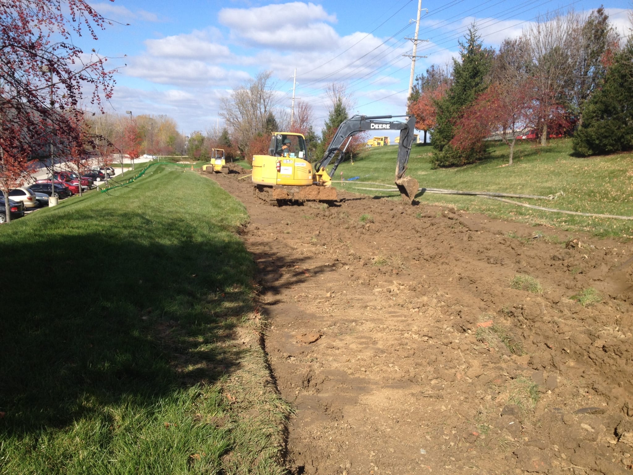 COMANCO has begun a storm water remediation project in the Midwest near St. Louis, MO. The scope of work includes 350 cubic yards of excavation and re-grading to existing, non-functional drainage canal, removal and replacement of an existing rip rap outlet basin around culvert outlets, installation of 250 square yards of sod over newly graded storm water runoff ditch and installation of sprinkler system components. The five man crew is doing a great job coordinating heavy machinery while continually maintaining a high level of safety awareness in the confined commercial work zone. The crew is led by Superintendent Jeremiah Stockwell, Foreman Tommy Terry, and Project Engineer Greg Pignataro. The job is scheduled to be completed mid November 2014.