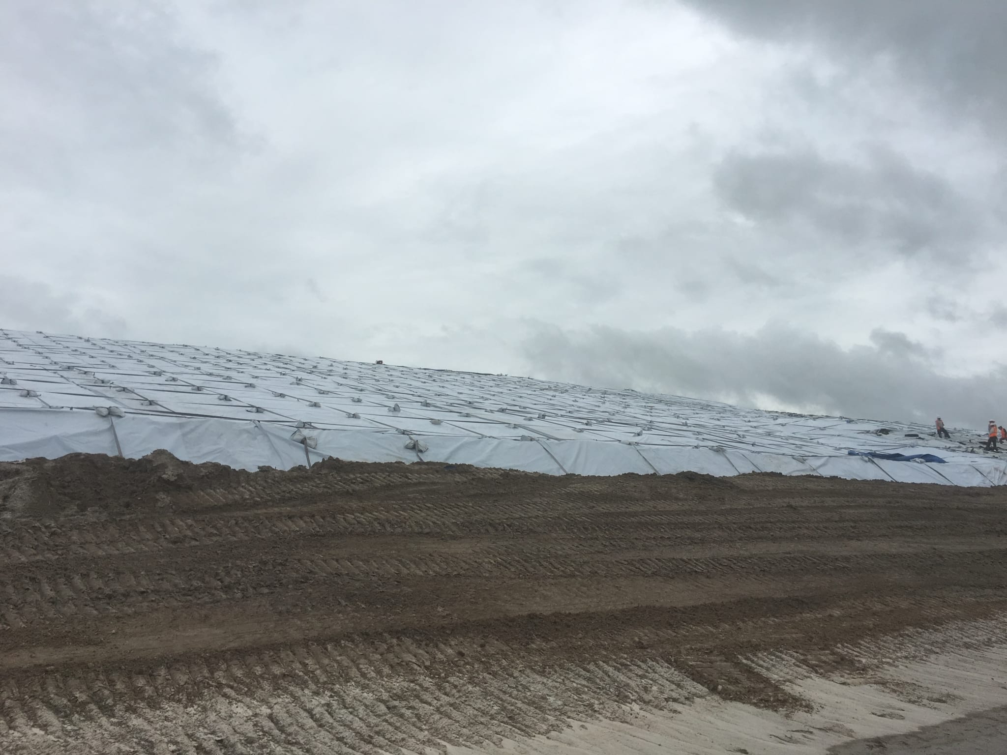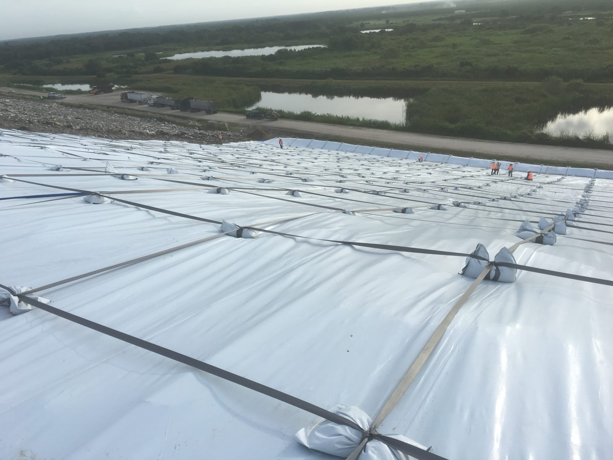 COMANCO is currently in the process of installing 11 acres of 12mil rain tarp at a DeSoto County landfill in Florida. Superintendent Maximino Macedo is leading the crew as they tackle the rain tarp installation. The rain tarp installation includes a sand bag ballast system to assist in locking the liner in place. Down chutes are being installed as drainage measures for the rain tarp. COMANCO looks to complete the project on time and incident free. Keep up the excellent work!