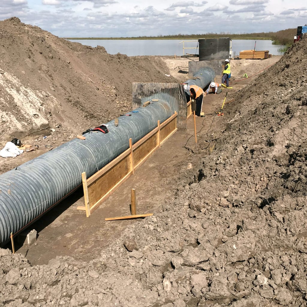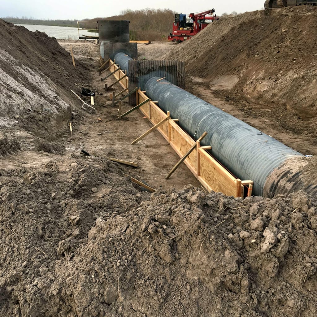 Superintendent Scott Hall along with Jeremy Giles have been prepping for pouring a concrete saddle around an existing 36-inch CMP spillway. The crew first had to refurbish the pipe by coating it with a rust inhibitor and zinc-enriched paint. The next steps included cutting and setting forms, along with backfilling and compacting around the saddle for stability. Once the saddle pour is complete, the crew can focus on building the pond dike back to grade. Check back later this week to see how the saddle turns out!