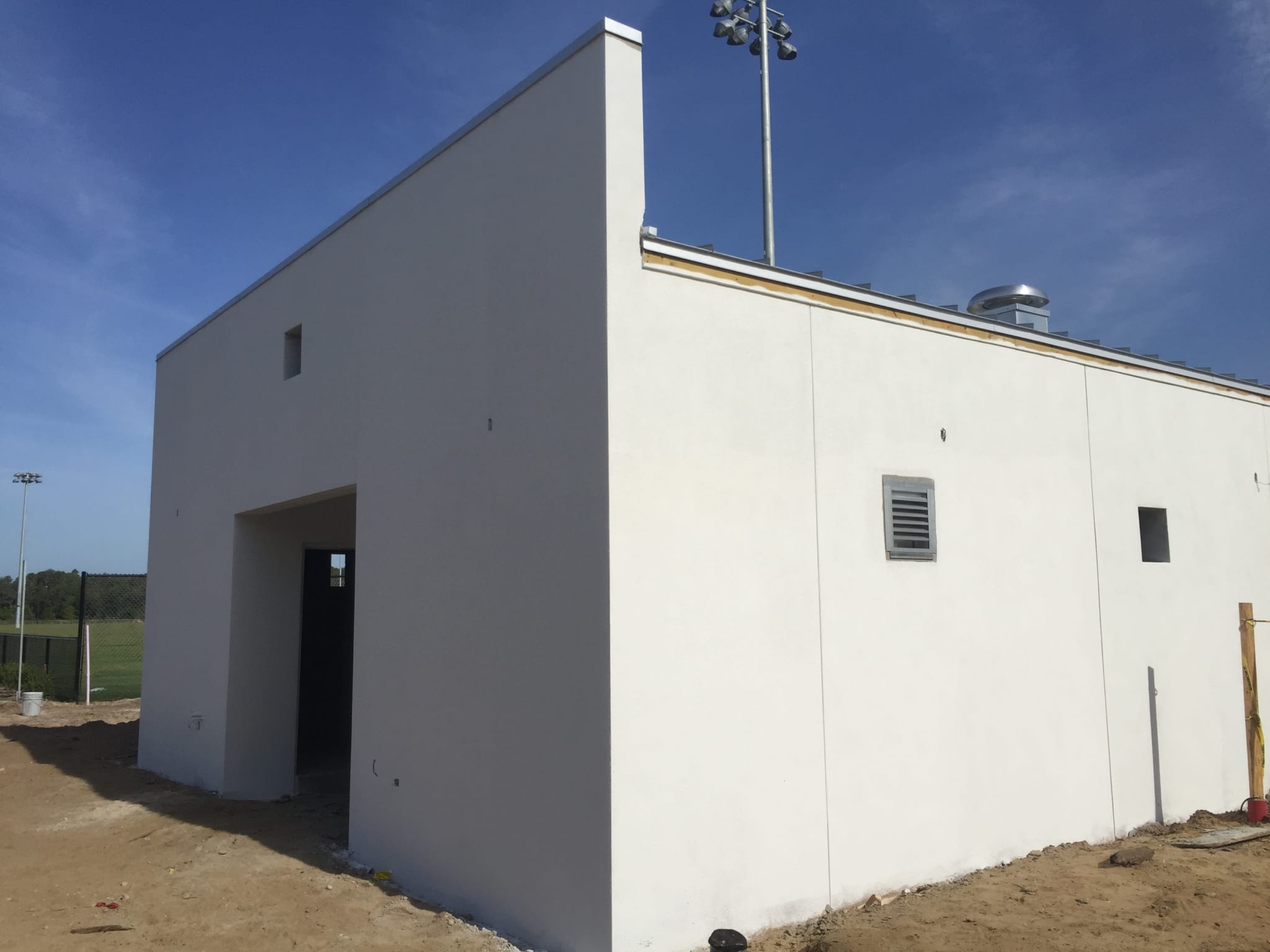 Things are continuing to progress for COMANCO at the Starkey Ranch Sports Complex. The Concession Building and stand-alone Restroom Building just received their paint job!  The exteriors of both buildings have been painted, now that the metal roof work is complete.  COMANCO’s painting subcontractor is required to follow the guidelines that meet the Master Painters Institute standards, with each paint type designated by an MPI index.