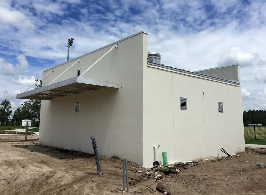 The buildings at Starkey Ranch Sports Complex continue to move towards completion this week. The drywall installation at the pre-engineered metal Maintenance Building is wrapping up as the rooms prepare for paint and fixtures. The fenced storage area was installed this week as well. The pre-fabricated awnings have been installed on the Concession and Restroom Buildings as painters are working their way through the buildings, priming, and installing dual coats of paint. The exterior concession area work will start soon, as the grease trap was installed this week, as the final piece of underground installation. Stay tuned for additional updates at Starkey Ranch!