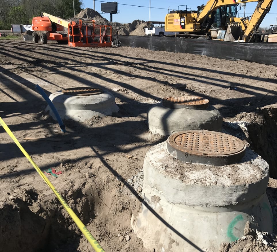 The building erection is nearing completion as the structural steel is up and the wall panels and insulation have been installed. The standing seam metal roof install will wrap up this week. The site work is coming together as well, as the storm water and sanitary structures are in, and the site is being graded for concrete and pavement. The DOT work to install the new deceleration lane to access the property also began this week and will allow safe access to the Tire’s Choice property for future customers. Stay tuned for more updates!